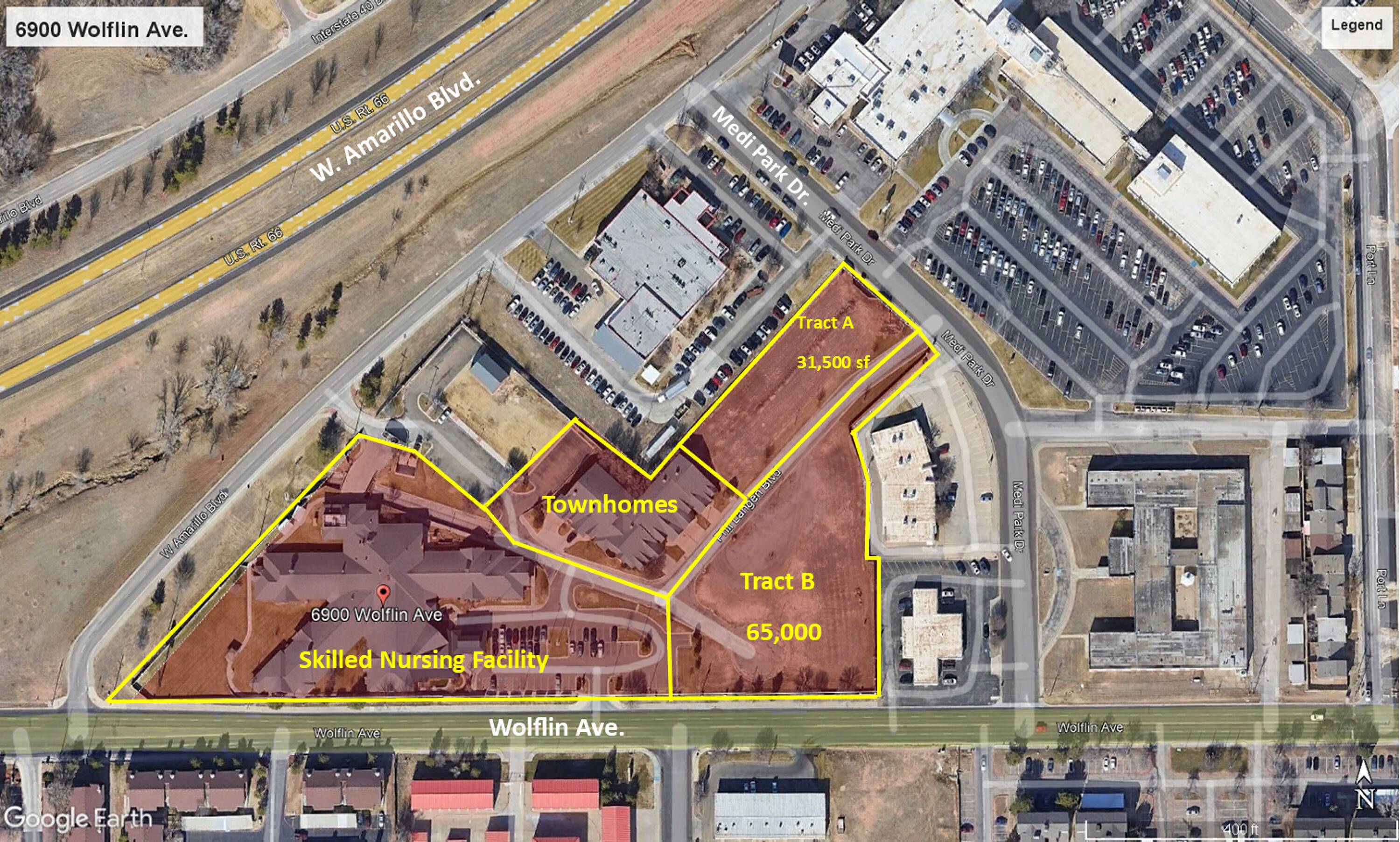 This property features a 42,635 square foot, 60-bed skilled nursing facility situated on 3.71 acres, along with six townhomes and two land tracts. The nursing facility has been recently renovated and is move-in ready. It features a central nursing station branching out into four wings, each with its own nursing station. The facility includes a fully equipped commercial kitchen, dining room, laundry facility, physical therapy area, private offices, break room, conference room, and day room. Each suite has its own restroom with a shower and individual climate control. The facility is protected by an overhead fire suppression system and a security alarm system with cameras and key fob controlled access. A diesel generator provides backup power. The facility received a new roof in 2015 and a full remodel in 2018, including new HVAC systems, plumbing, paint, and carpet. The six townhomes include: a 2,298 square foot unit with 3 bedrooms, 2.5 bathrooms, and a 2-car garage that is currently vacant with an unfinished interior but does have the mechanical and plumbing in place; a 2,163 square foot unit with 3 bedrooms, 2.5 bathrooms, and a 2-car garage that is currently leased for $1,600/month; a 1,991 square foot unit with 3 bedrooms, 2.5 bathrooms, and a 2-car garage that is currently vacant and needs carpet and paint; a 2,470 square foot unit with 3 bedrooms, 2.5 bathrooms, and an oversized 2-car garage that is currently leased for $1,500/month; a 2,458 square foot unit with 3 bedrooms, 2.5 bathrooms, and a 2-car garage that is currently leased for $1,500/month; and a 2,510 square foot unit with 3 bedrooms, 2.5 bathrooms, and a 2-car garage that is currently leased for $1,200/month. One land tract is 31,500 square feet with frontage on both Medipark Drive and Phil Langden Blvd. The other is 65,000 square feet with frontage on Wolflin Avenue, Phil Langen Blvd., and Medipark Drive. City water and sewer run down Phil Langen Blvd. The property is located across W. Amarillo Blvd from both BSA and NWTX Hospitals.