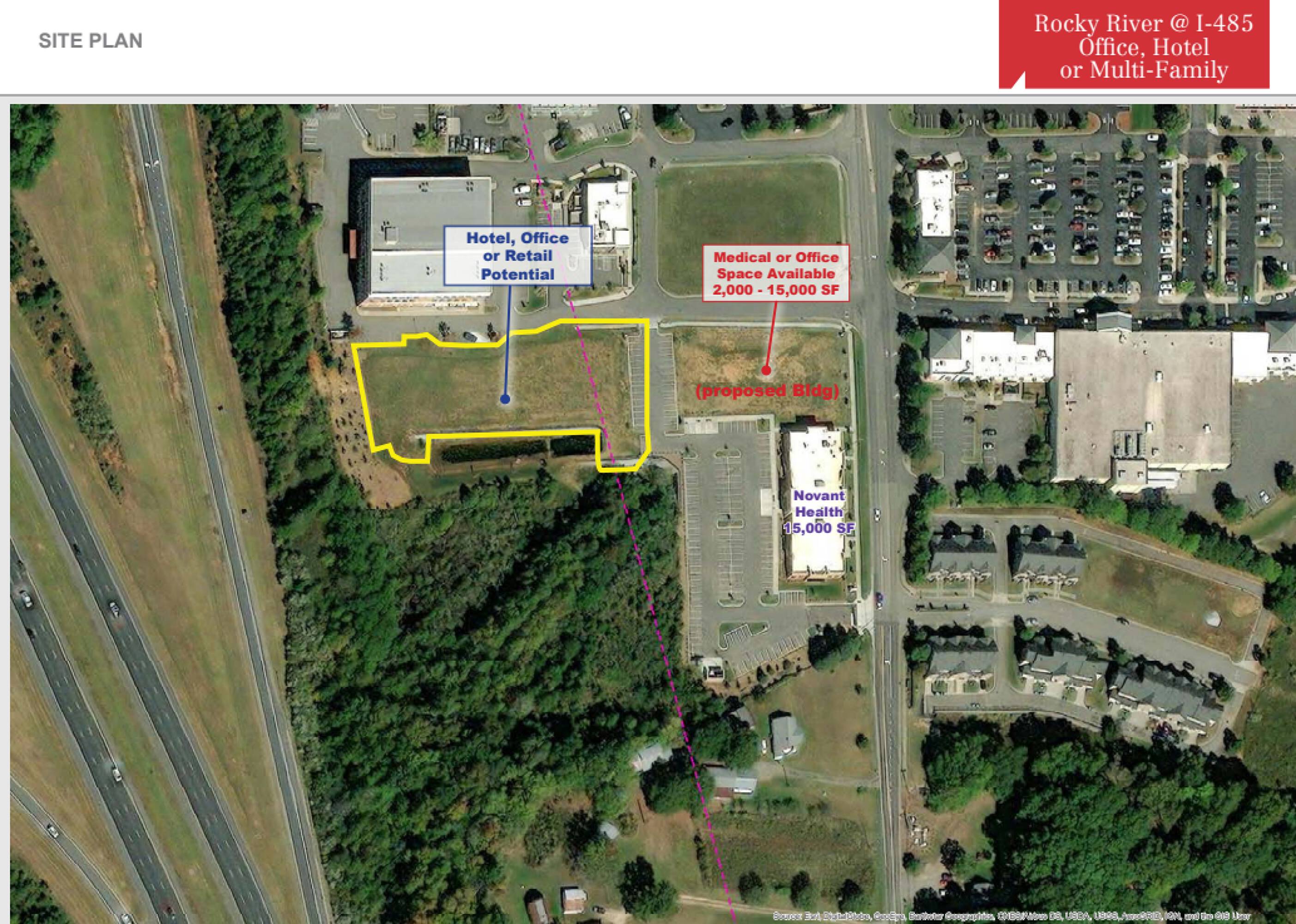 Approximately 1.5 acres of land are available for purchase, with potential build-to-suit options. The site is suitable for a hotel, office, or retail development. The property is zoned CC in Mecklenburg County and PUD in Cabarrus County.