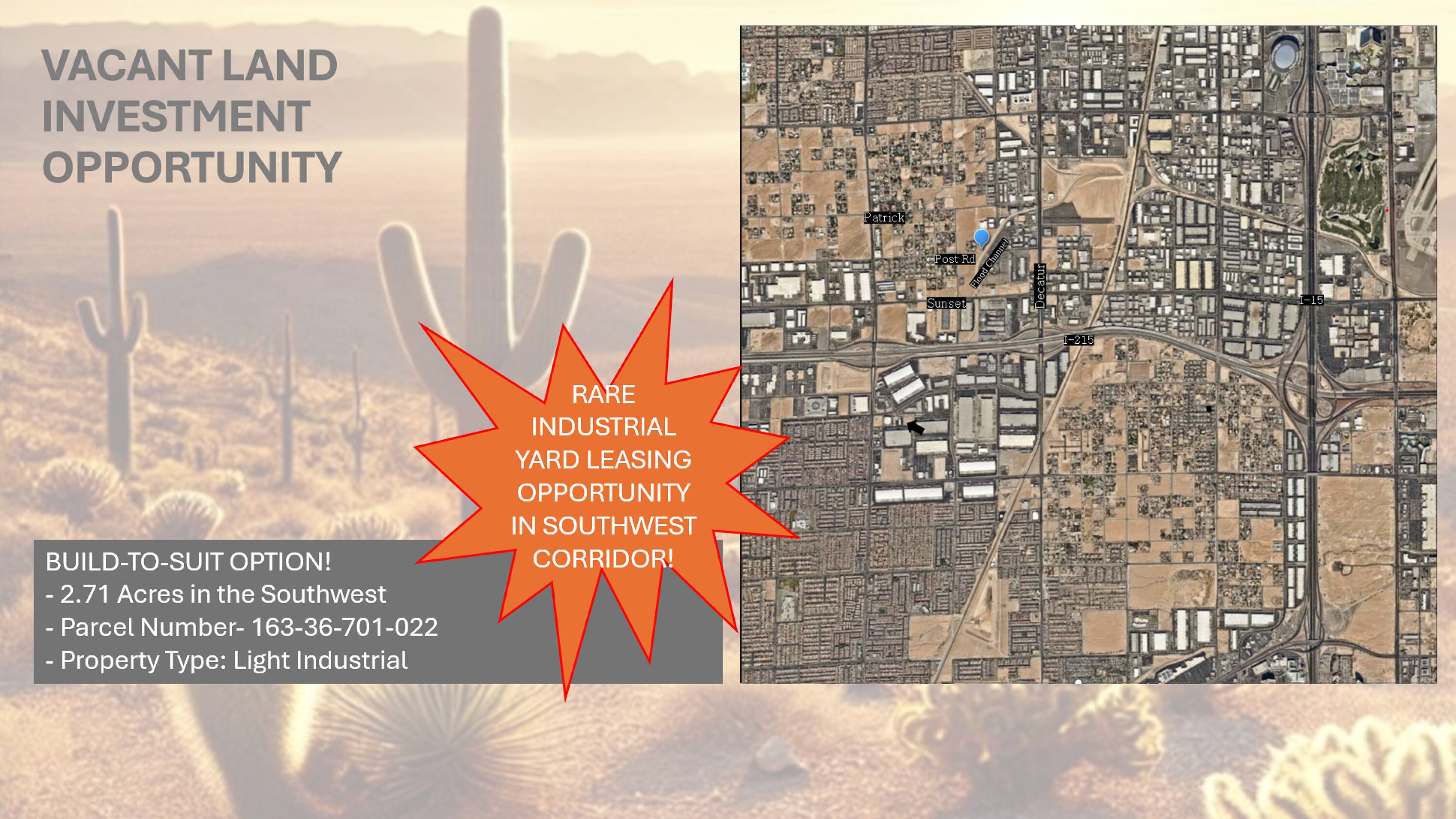 This property features: Prime location in the highly sought‑after Southwest Corridor near Sunset and I‑15.; Exceptional yard space opportunity.; Build‑to‑suit option available.