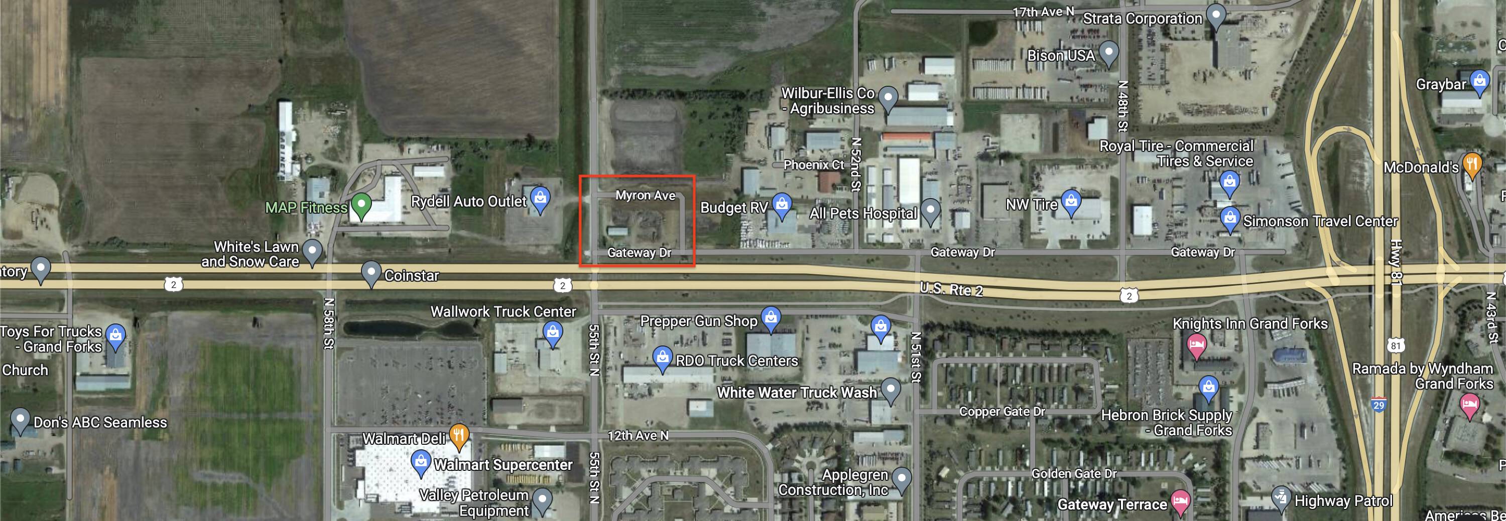 This commercial-zoned lot is located at the intersection of Gateway Drive (Highway-2) and 55th Street North. The surrounding area includes businesses such as Walmart, RDO Equipment, Rydell Auto Outlet, and Budget RV. The site benefits from high visibility along a high-traffic corridor. It is located minutes from the University of North Dakota, GFK Airport, Grand Forks Air Force Base, and Grand Sky. The property offers accessibility and regional connectivity.