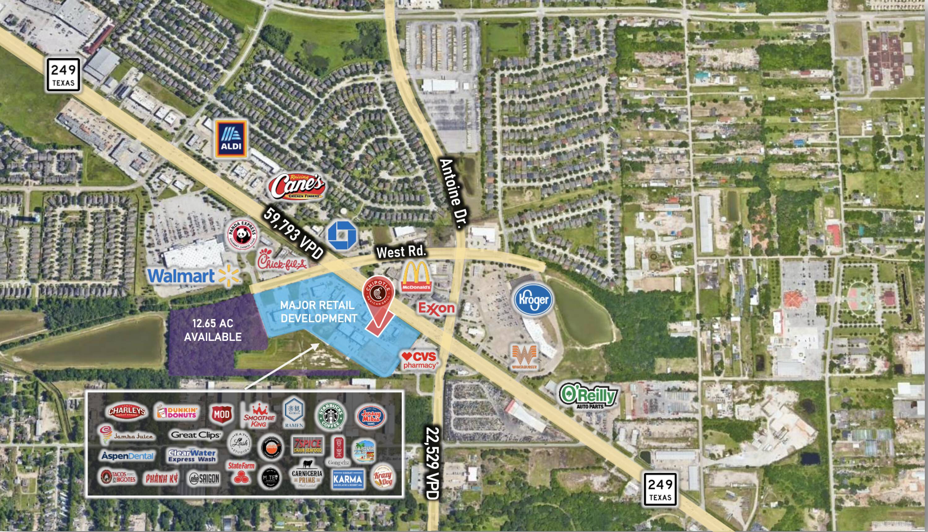 This is a single-tenant net lease opportunity for sale, located at 12625 Tomball Parkway, Houston, Texas 77086. The property is 2,325 square feet and is leased to Chipotle (NYSE: CMG) under a corporate-backed, 10-year commitment. The lease includes four 5-year options with 10% rental increases every 5 years. Rent commenced in October 2023. The property is located in a large retail corridor near the signalized intersection of SH 249 and Antoine Dr. Other tenants in the area include Walmart Supercenter, Kroger, Jersey Mike’s, Starbucks, Smoothie King, Panda Express, Chick-fil-A, McDonald's, and Whataburger. The Chipotle location benefits from high visibility and easy accessibility.