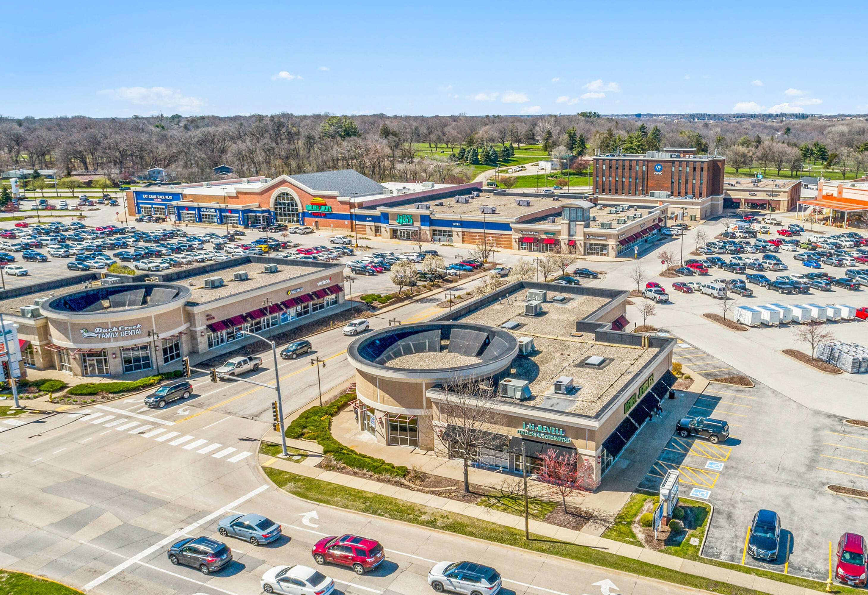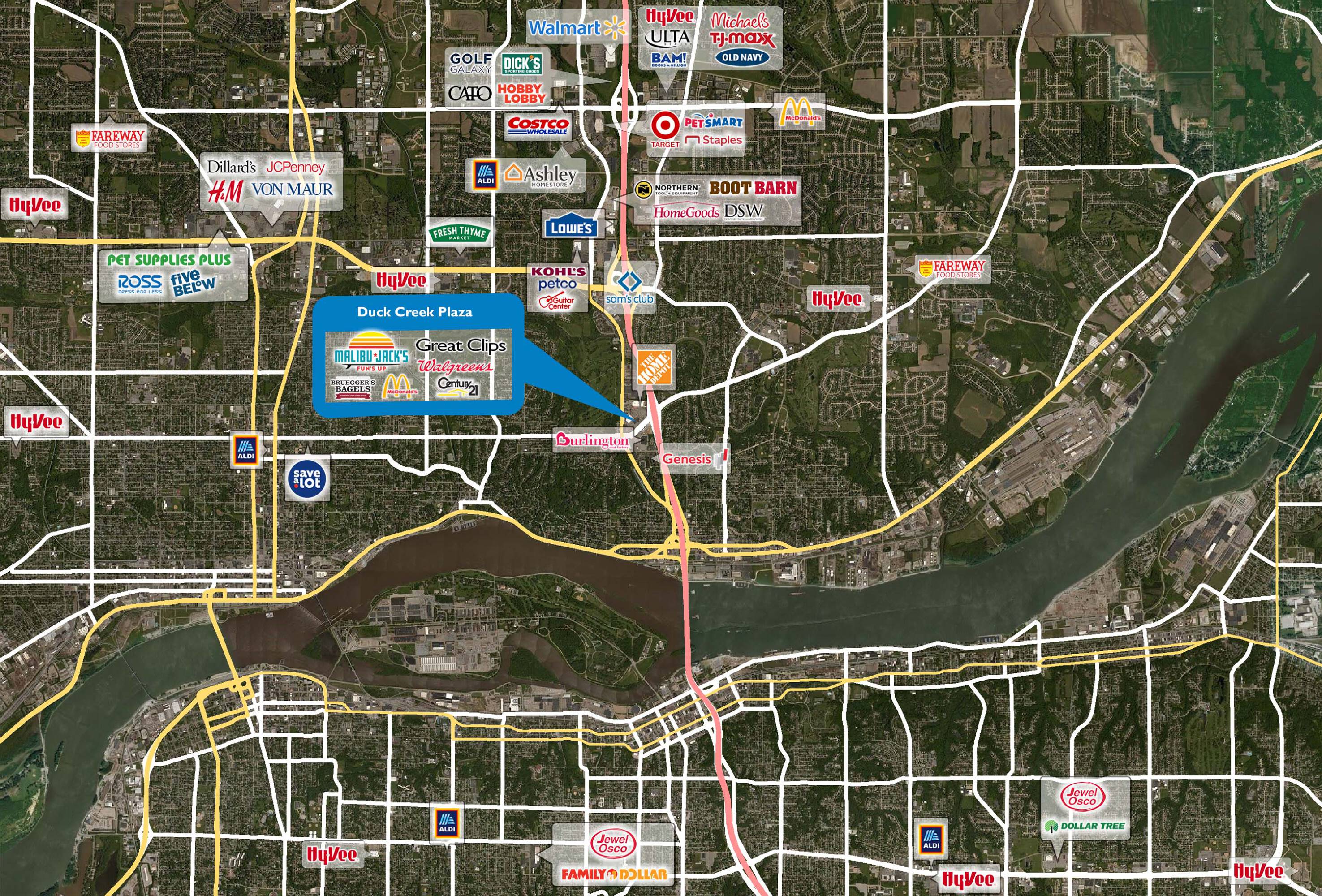 Duck Creek Plaza is a multi-tenant shopping center featuring a mix of national and local retailers. The location benefits from its proximity to I-74, at the intersection of Middle Road and Kimberly Road, with traffic exceeding 89,000 vehicles per day. Multiple retail opportunities are available, suitable for restaurants, salons, boutiques, fitness studios, and service businesses. The shopping center is shadow-anchored by Home Depot and Walgreens and includes Malibu Jack's. Retail space is available for lease in Bettendorf, Iowa.