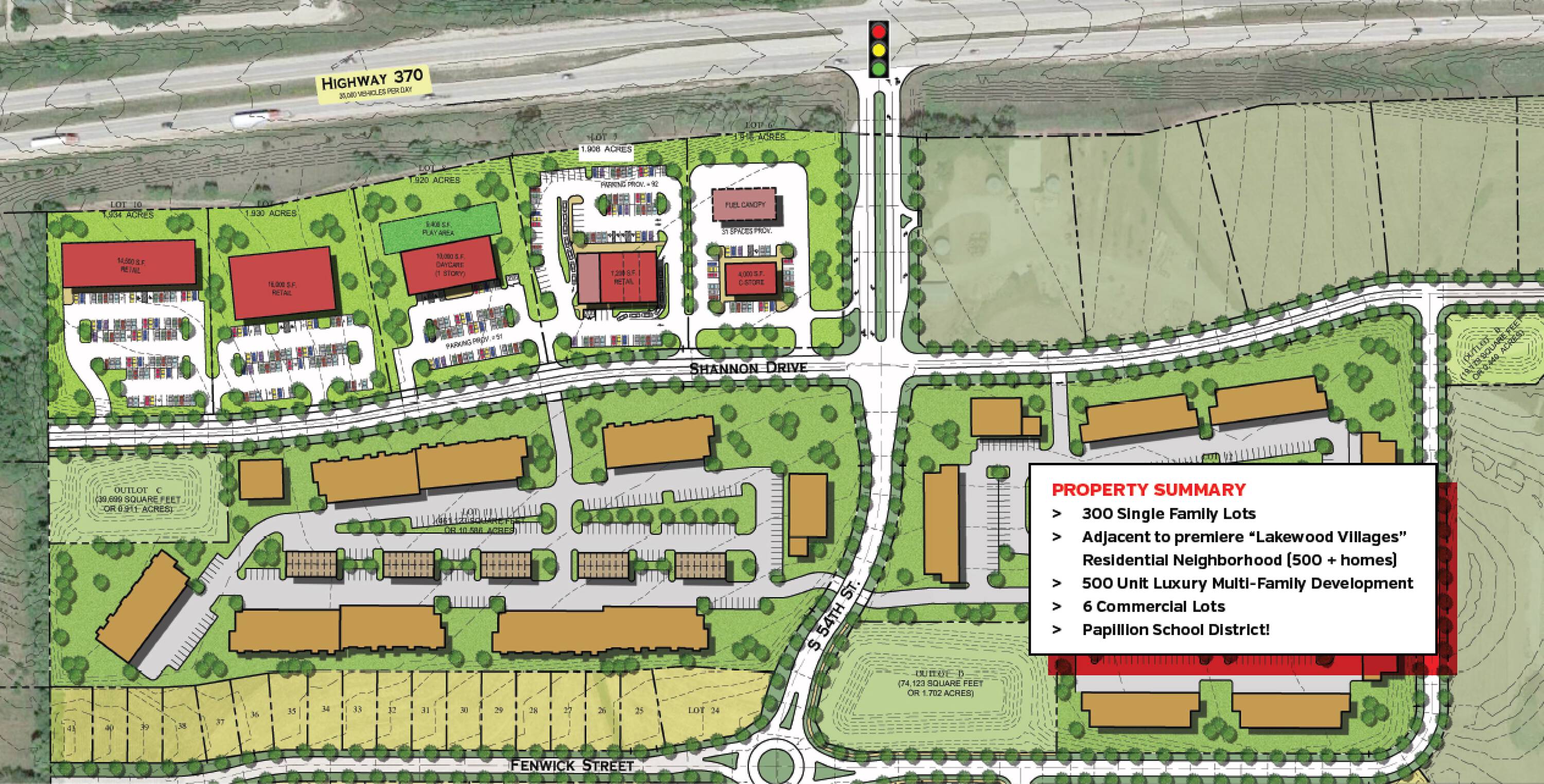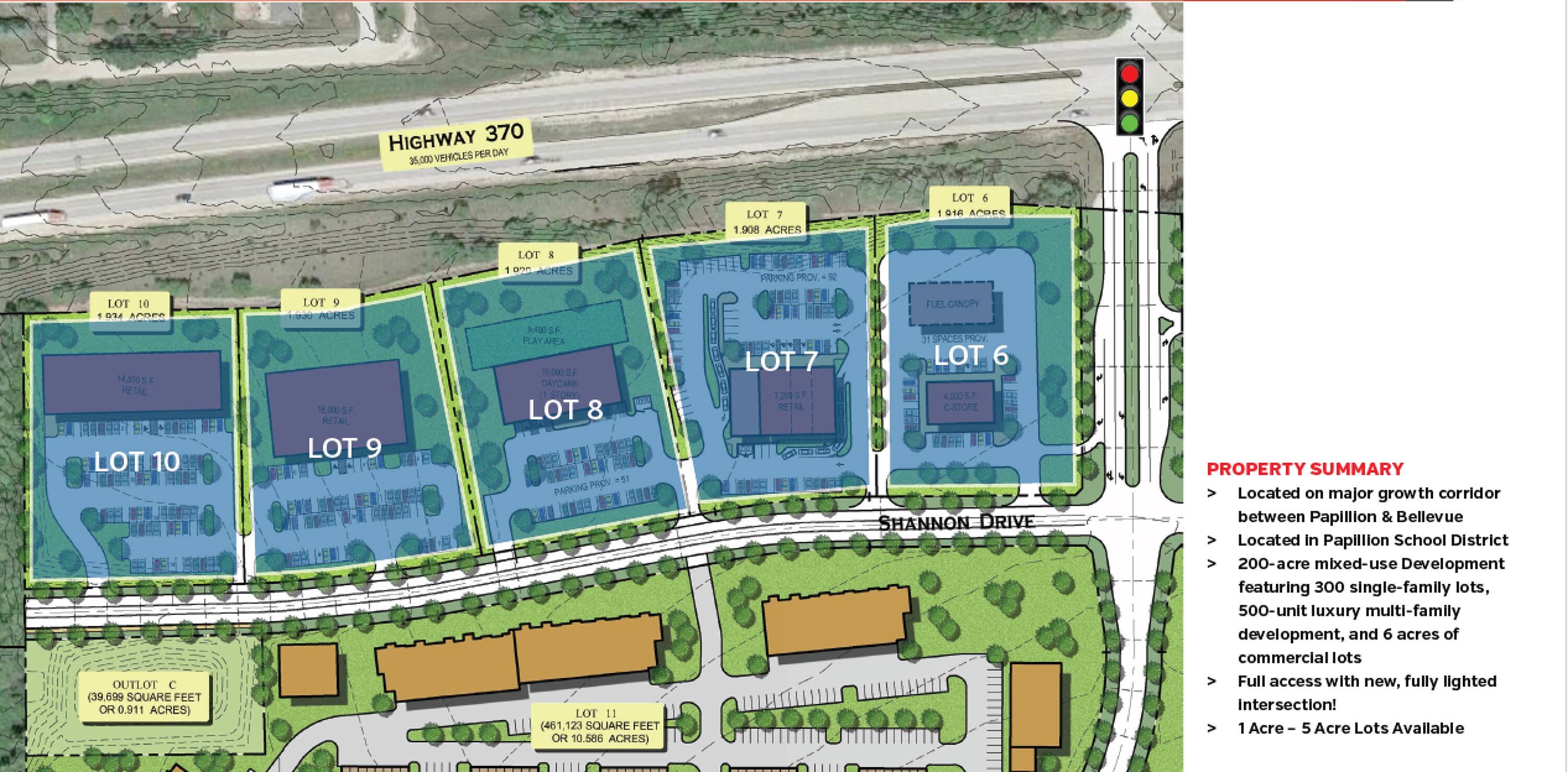 This property features: Located on major growth corridor between Papillion and Bellevue.; Full access with **new fully lighted intersection on Hwy 370.**; Located in 200‑acre mixed‑use development.