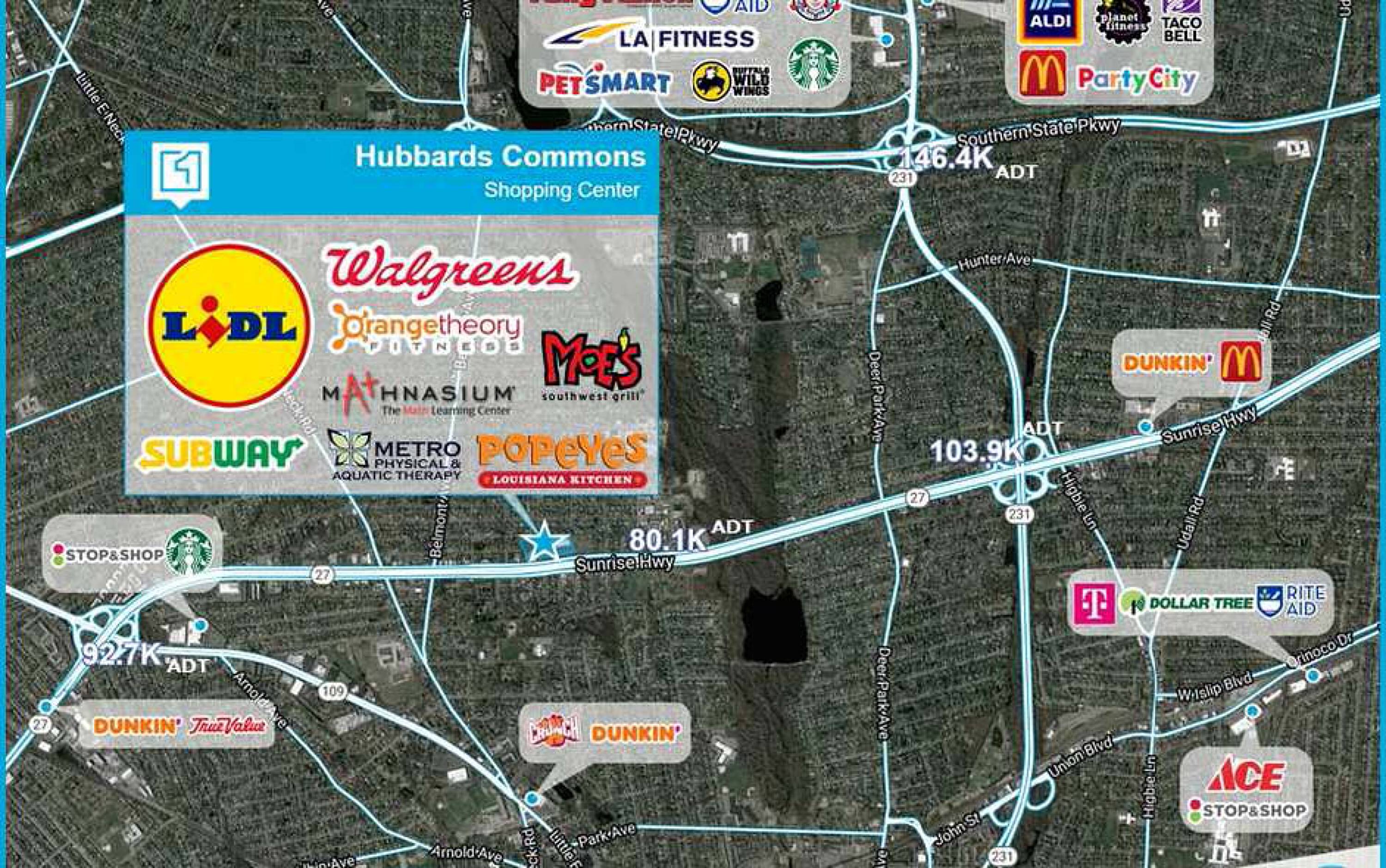 This property features: Anchored by Lidl, Walgreens Pharmacy, and Orange Theory Fitness, providing strong customer traffic; Located on the corner of Sunrise Highway and Hubbards Path in West Babylon, Long Island, NY; Features a dynamic mix of necessity‑based grocer retail and complimentary local retailers