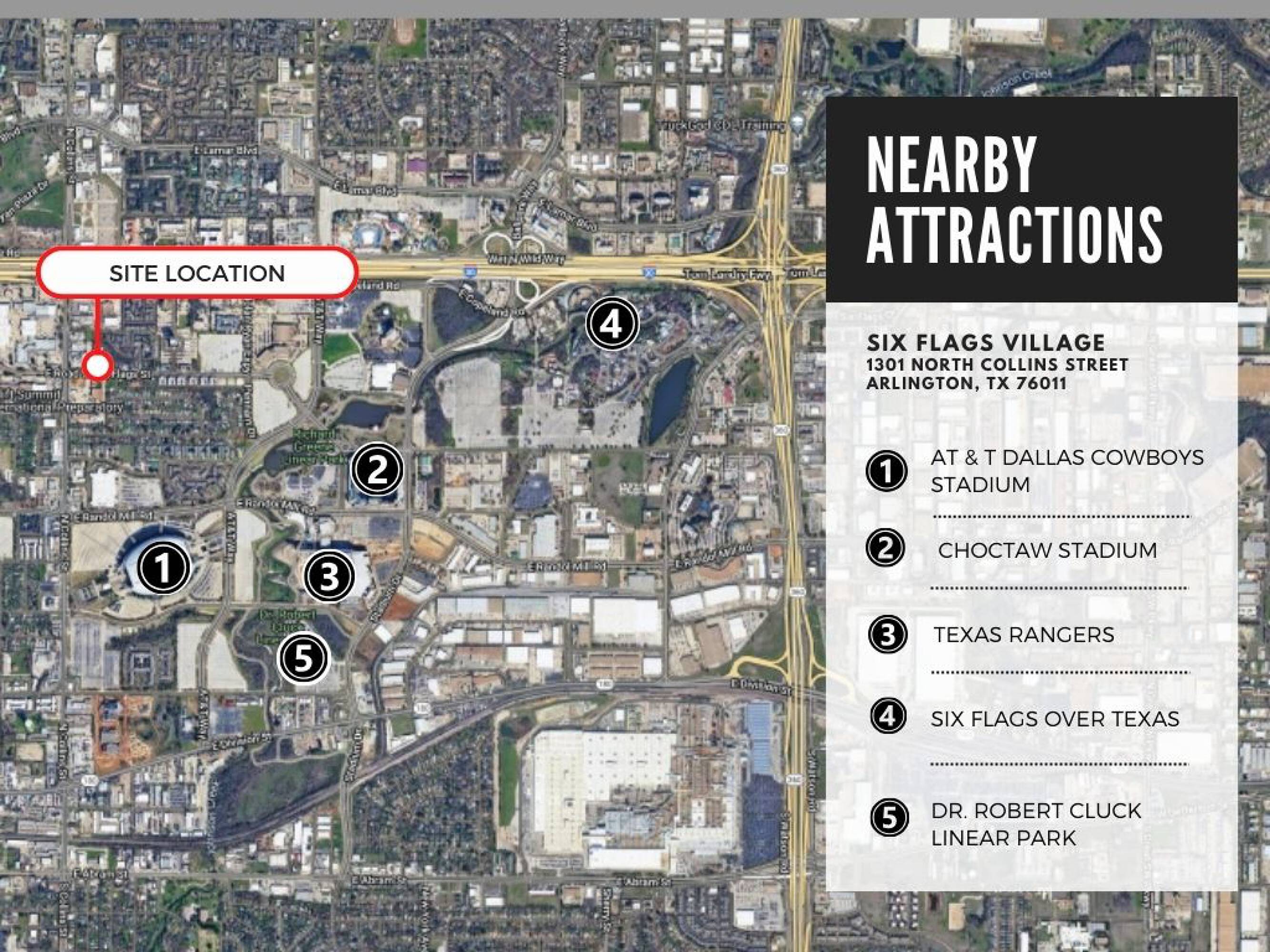 - Six Flags Village — 1303 N Collins St, Arlington, TX 76011