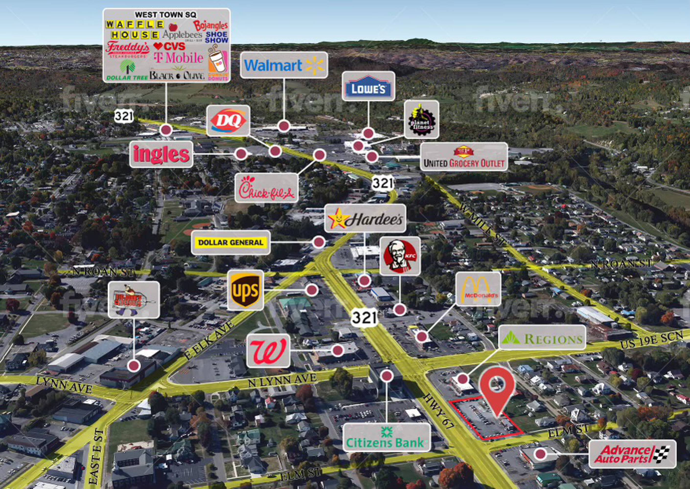 Newly built commercial property in Elizabethton, Tennessee, with high visibility.