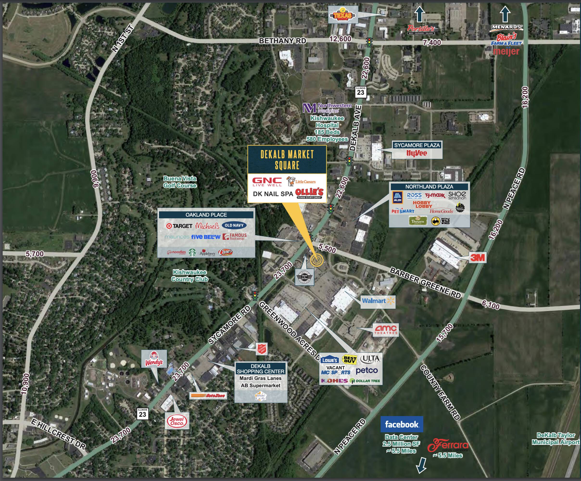 DeKalb Market Square is a retail center located on Sycamore Road, a commercial corridor in DeKalb. The property benefits from visibility and high daily traffic. It is directly across from Walmart, Kohl’s, Lowe’s, and AMC. The center offers flexible suite layouts and ample parking. It is suitable for retail, medical, fitness, service, or restaurant businesses seeking a location with high exposure. Spaces are available for lease at $10 per unit.