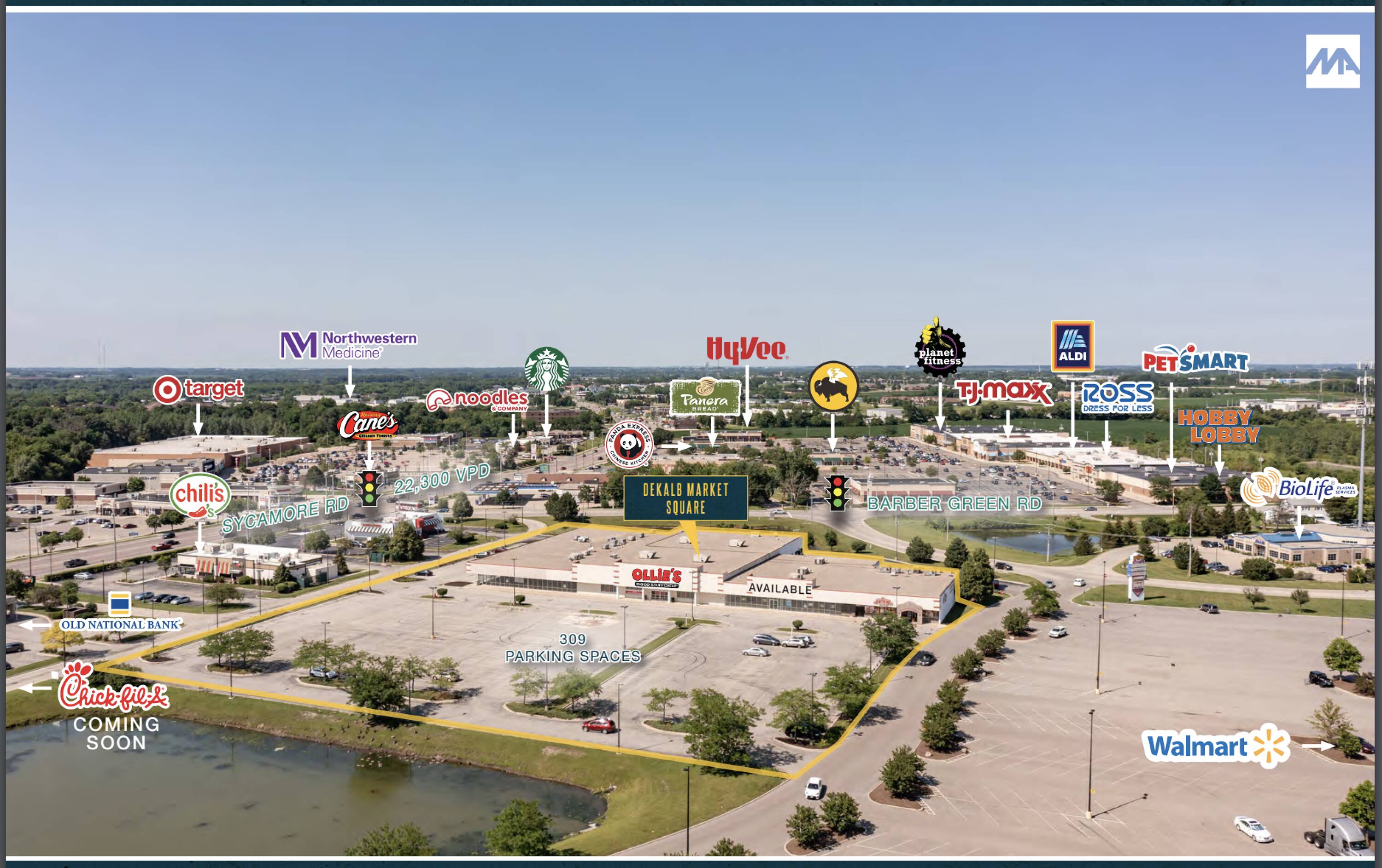 This property features: High‑traffic location on Sycamore Road, a major commercial corridor.; Excellent visibility and easy access.; Directly across from major retailers: Walmart, Kohl’s, Lowe’s, and AMC.