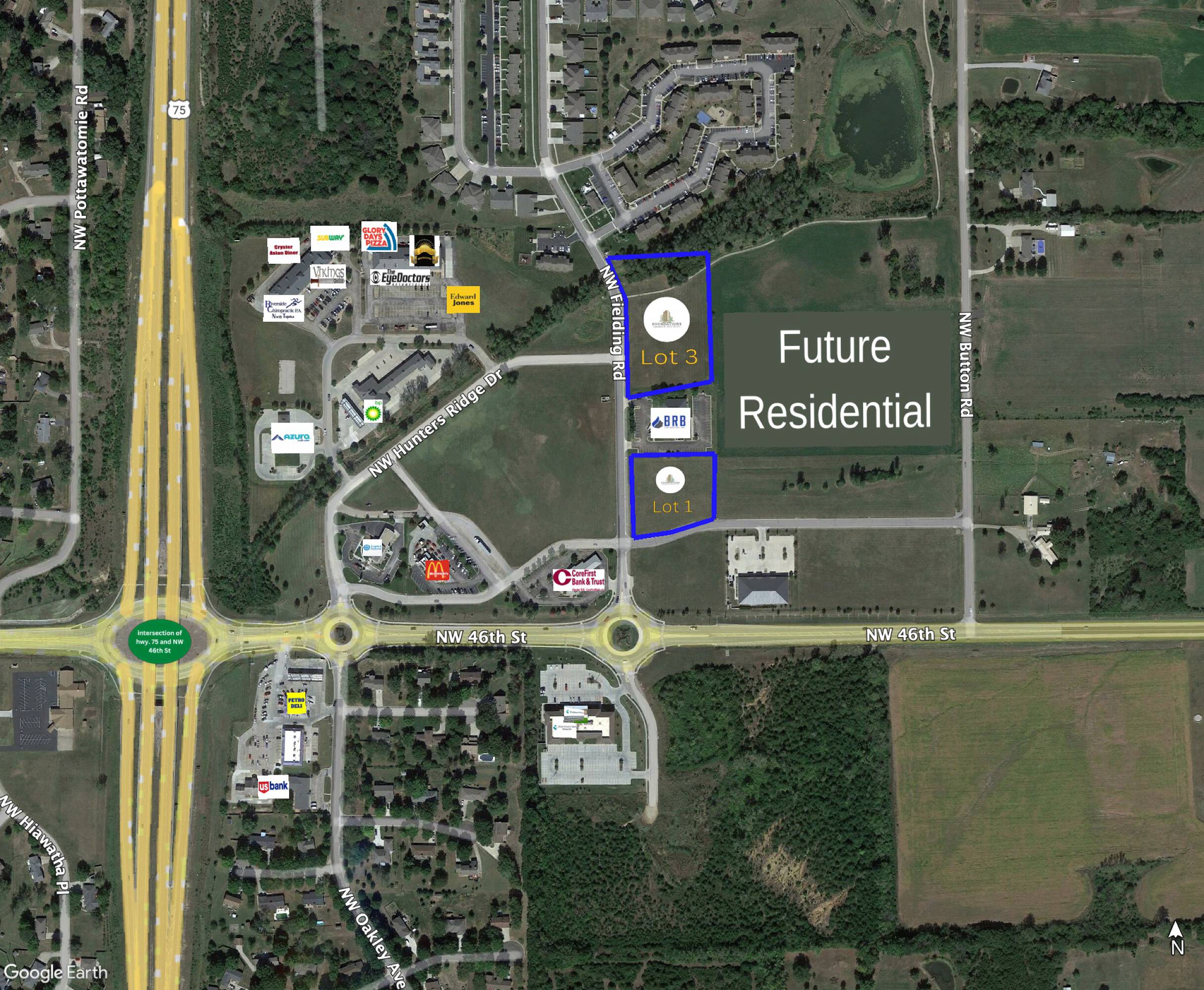 Commercial development land is available for sale on the North Side of Topeka, Kansas, situated in an emerging commercial and residential area, close to retail, office, and services. This pad site is ready for development on the corner of 47th Street and Hunters Ridge. There are two sites available. Meadowlark Square Sub Block A Lot 1 comprises 1.4 acres and Meadowlark Square Sub Block A Lot 3 comprises 3.03 acres. The land is adjacent to Sterling Chase Residential, Emory Lake Luxury Apartments, future residential development to the east, Azura Credit Union, BP, BRB Contractors Inc, Capitol Federal Savings, Core First Bank & Trust, Cotton O’Neil Express Care North, Cryster Asian Diner, Edward Jones Investment, El Dorado Mexican Grille, Glory Days Pizza, McDonalds, Petro Deli, Riverside Chiropractic, Subway, The Eye Doctors, and Viking Sports Bar.