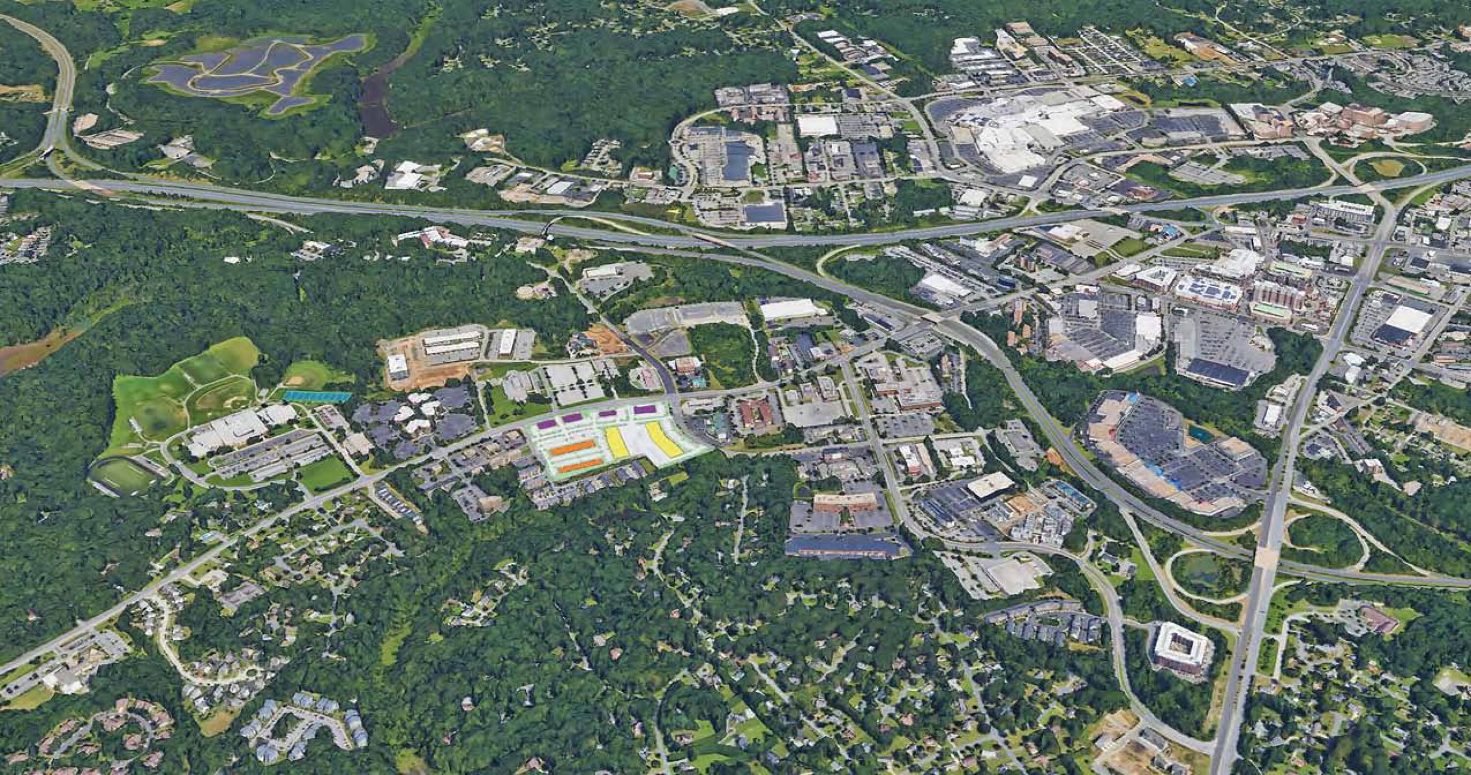 Mixed-use community with office, flex, R&D, and retail spaces.