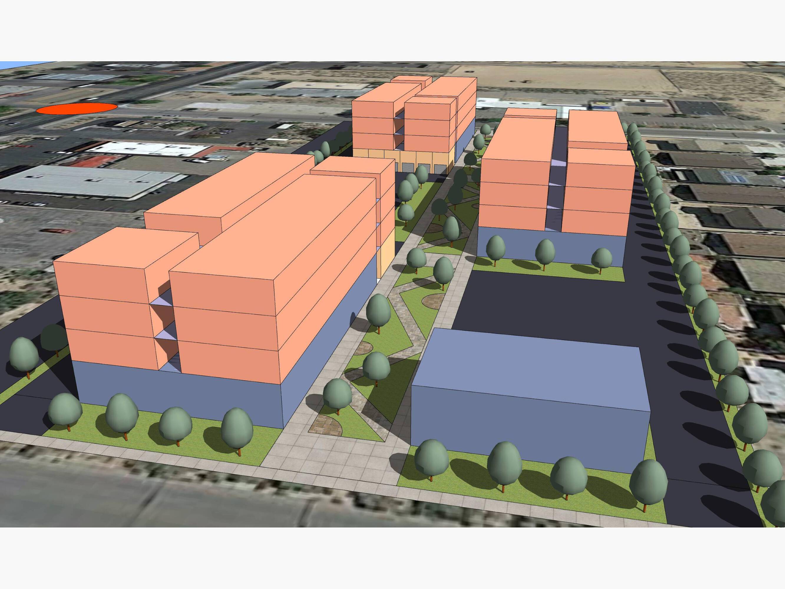 This property presents a great investment opportunity with seller financing available for the land. Zoned NC (Neighborhood Commercial), it is suitable for new development. A preliminary meeting with the Rio Rancho Planning Department and related departments was positive, encouraging further progress. The property is envisioned for a multi-income, mixed-use, multi-story development, potentially including 78 higher-quality apartments or condominiums, along with garages, a solar-paneled covered surface parking area, and a rooftop common area. The ground floor could feature a courtyard (pedestrian-only), artisan retail spaces, an eatery, brewery, dry bar, research and development facilities, and generative AI work flex space. The concept aims to create a work, live, shop, and play community. Several projects are underway within a few blocks, indicating a revitalization of Southern Blvd SE. Conceptual design is by FBT Architects.