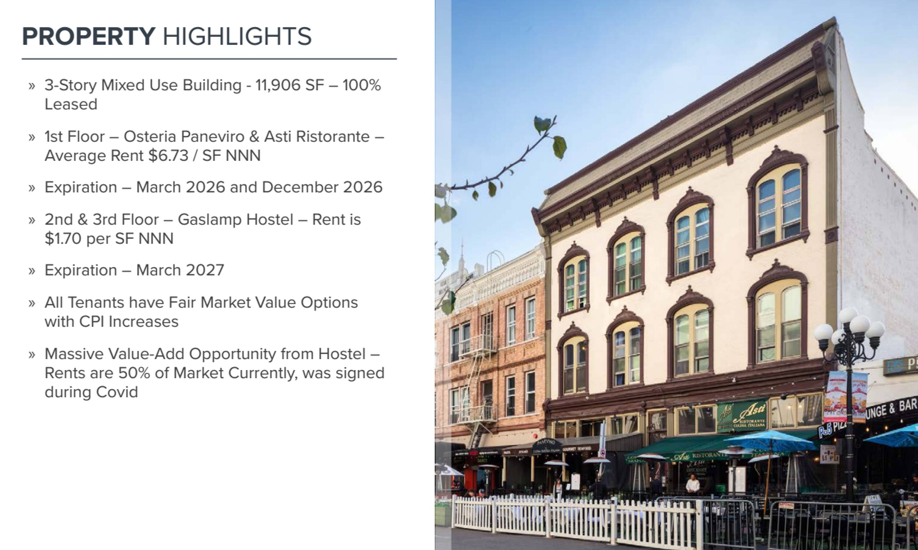 This is a three-story mixed-use building with 11,906 square feet. The building is currently 100% leased. The first floor is occupied by Osteria Paneviro and Asti Ristorante, with an average rent of $6.73 per square foot NNN. These leases expire in March 2026 and December 2026, respectively. The second and third floors are leased to Gaslamp Hostel, with a rent of $1.70 per square foot NNN. The Gaslamp Hostel lease expires in March 2027. The property is located in San Diego, CA.