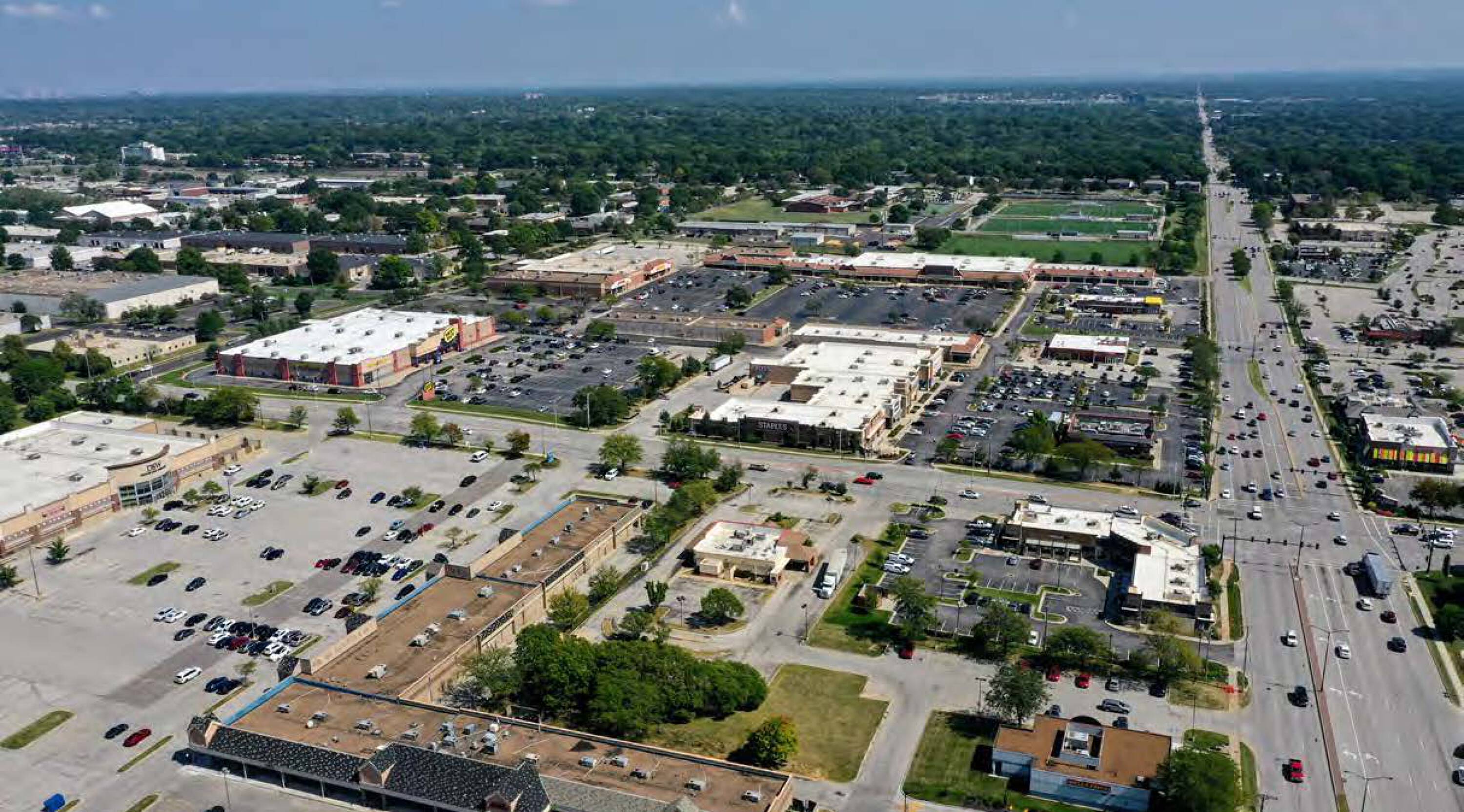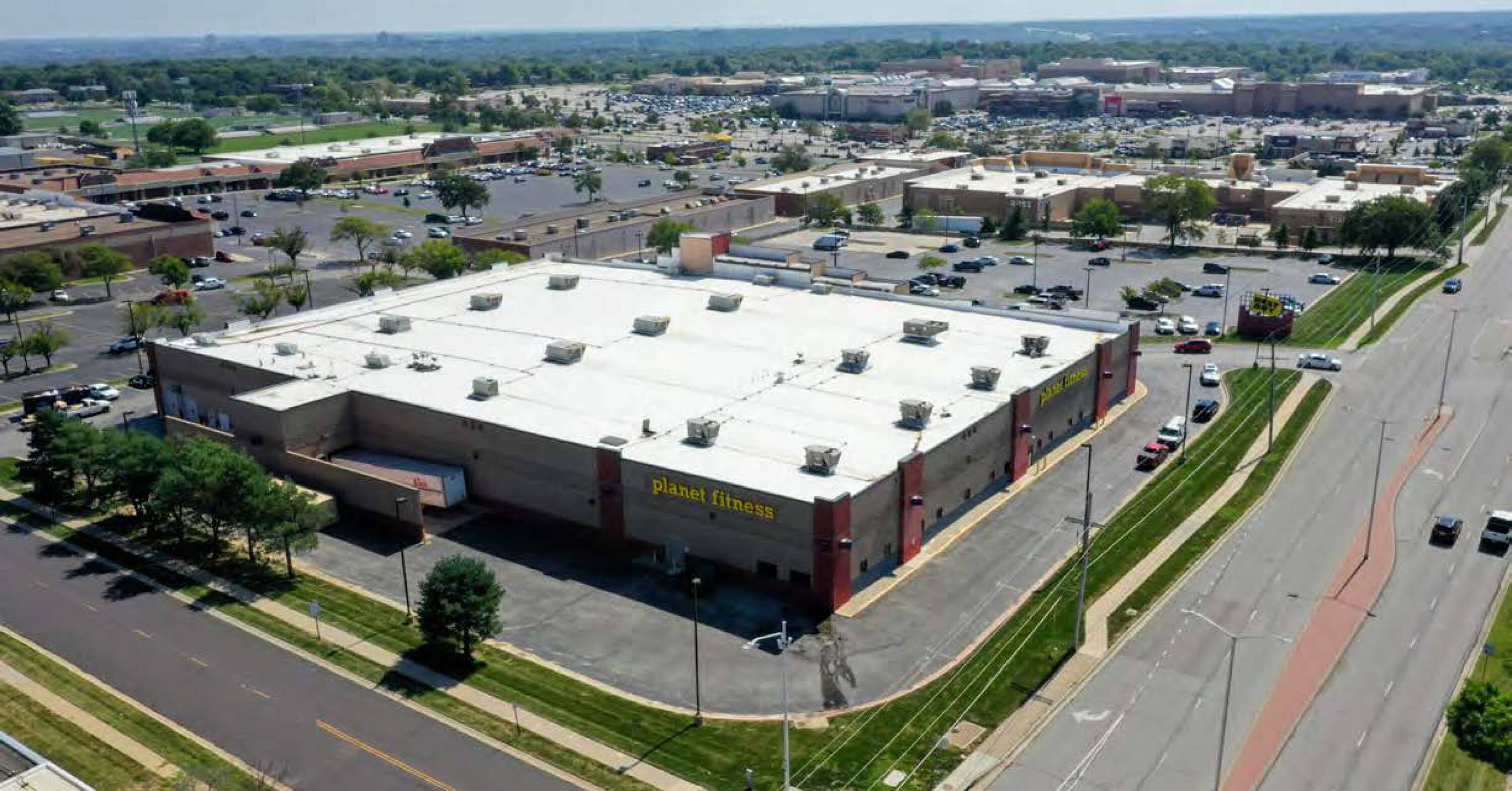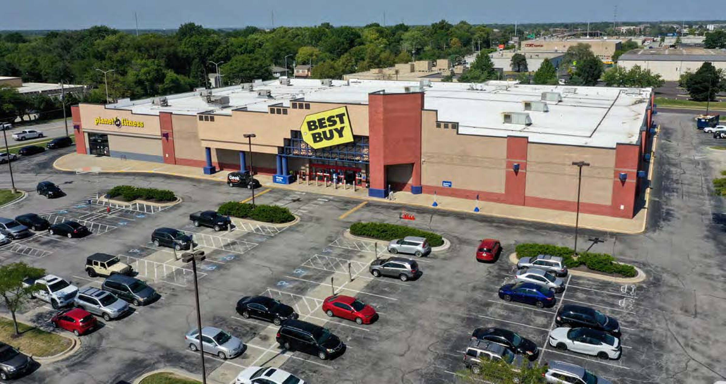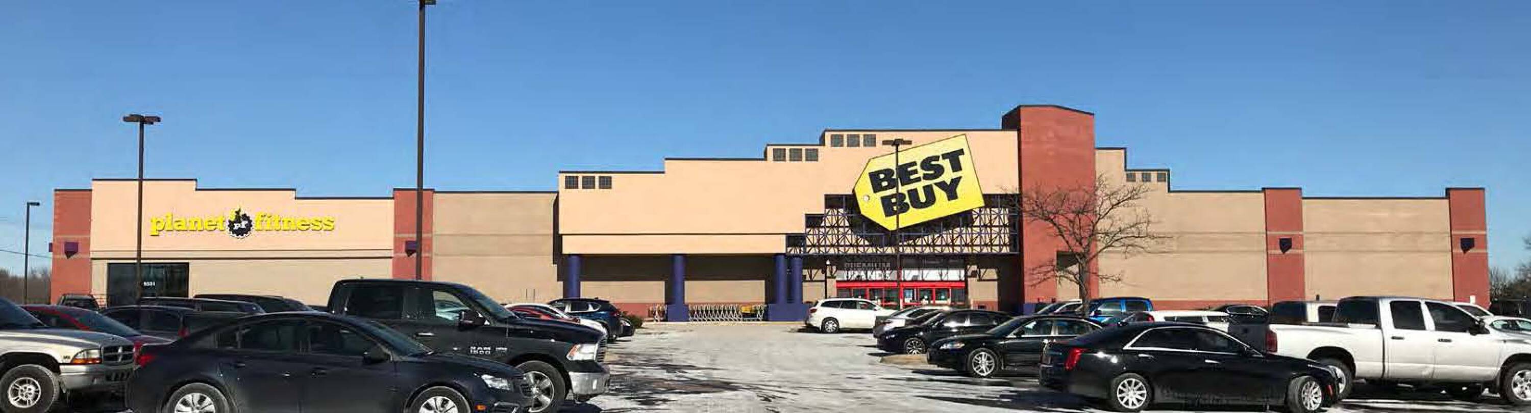 Retail building with Planet Fitness and Best Buy.