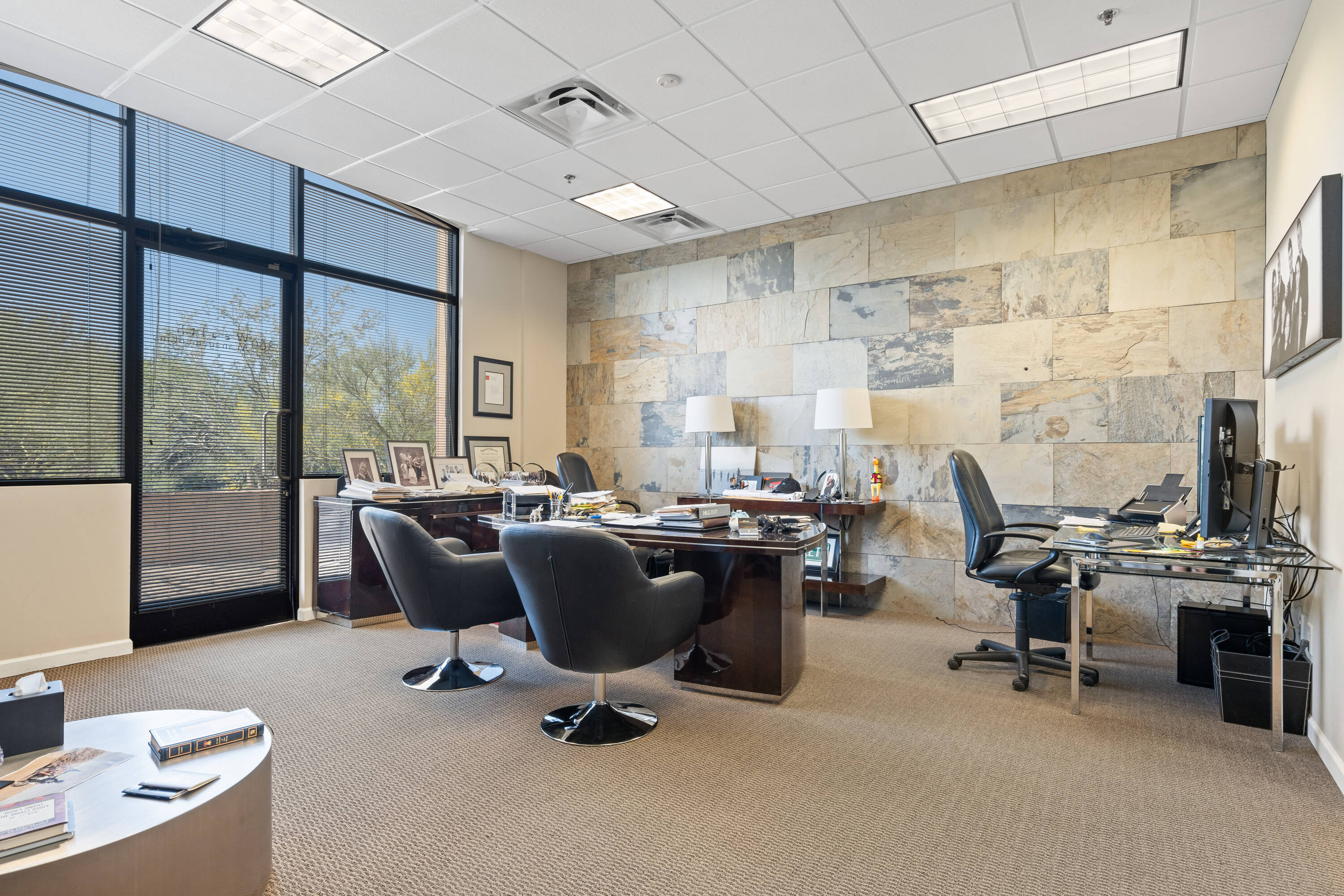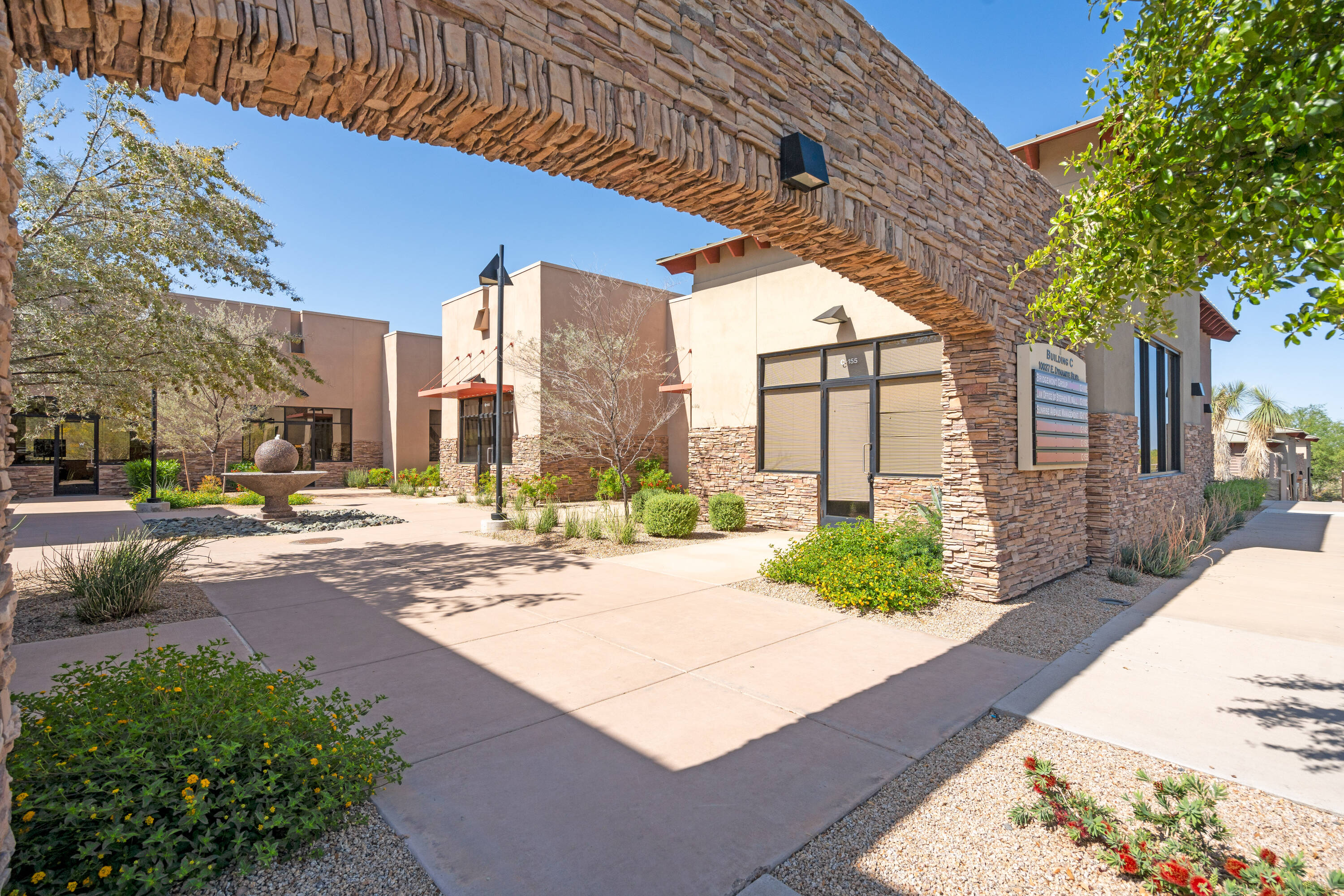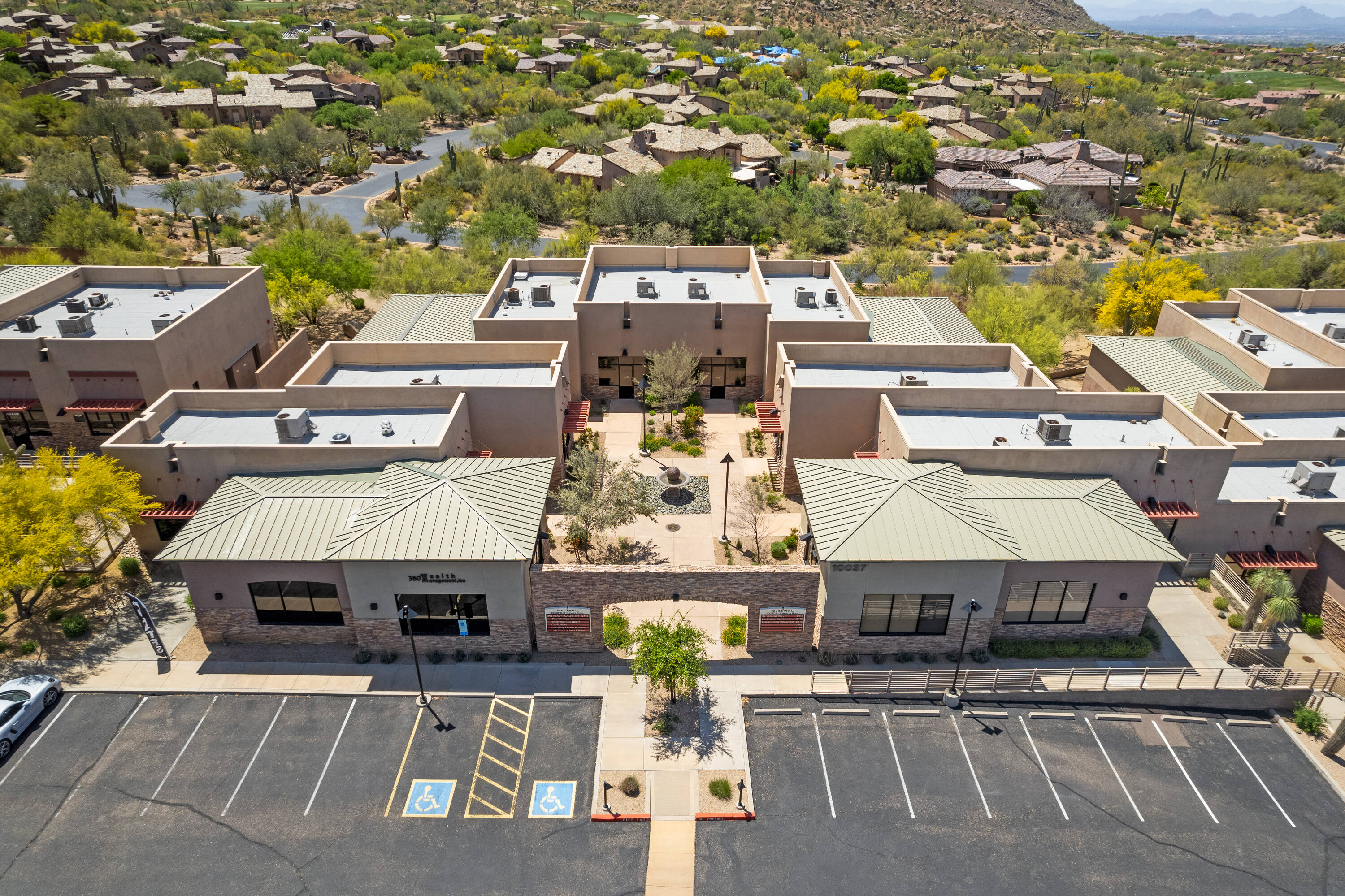 This commercial property is located in North Scottsdale within The Villages at Troon North development, built in 2006. The building, identified as Building C, Suite 101-155, encompasses approximately 11,589 square feet and is situated on a 15-acre site zoned C-2 in Scottsdale. Constructed in a Southwest-Spanish architectural style, the property offers mountain and desert views, complemented by desert landscaping throughout the courtyard and surrounding areas. The property provides 4.3 parking spaces per 1,000 square feet, including seven covered spaces. The existing build-out includes a reception/waiting area, multiple private offices, a full kitchenette, and an open bullpen area suitable for cubicles. Building C can support traditional office, medical, or retail use, making it an excellent purchase opportunity for an owner/user/investor.