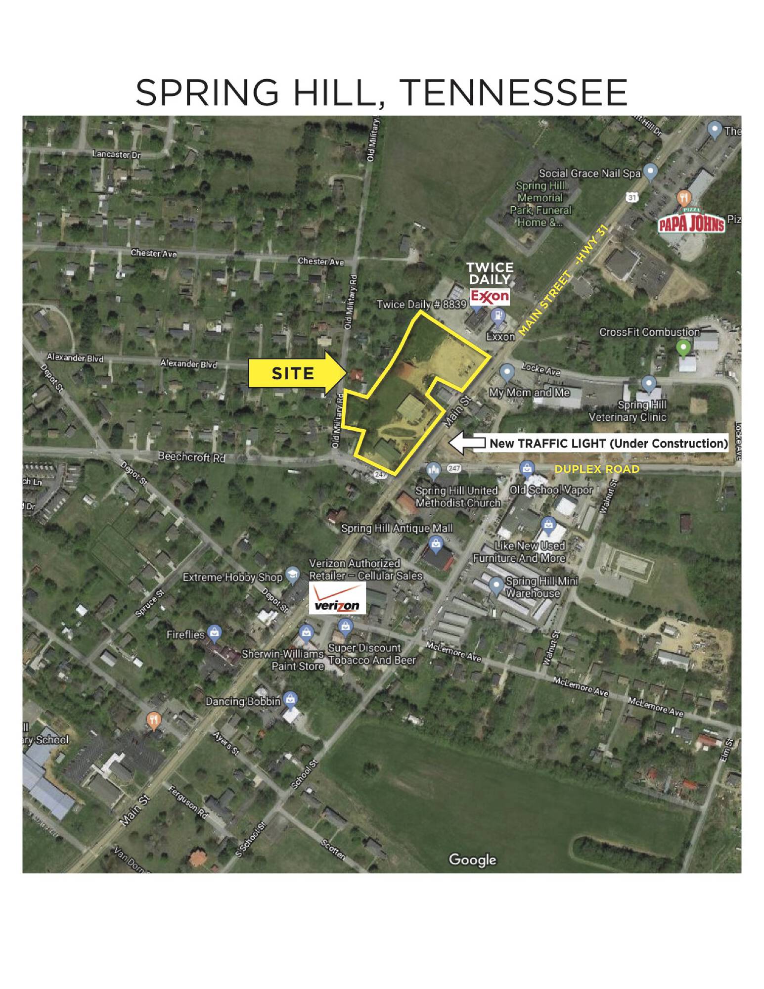 This 3.8-acre commercial property is located at the intersection of Main Street and Duplex Road in Spring Hill, Tennessee. The site is zoned commercial and includes all utilities. The property is divisible.