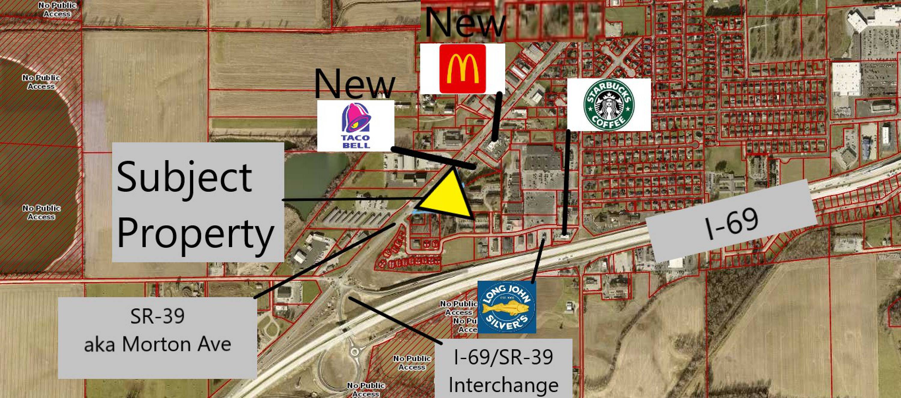 This commercial land is situated between the I-69 interchange and the new Taco Bell and McDonald's locations, offering over 600 feet of frontage on SR 39. The property's B3 zoning makes it suitable for a variety of uses, including auto parts, retail, office, restaurant, petroleum/fuel, hospitality, hotel, and convenience store. Located just off I-69 on SR 39, the site is conveniently less than 1/4 mile from the I-69/SR-39 interchange, which features both Northbound and Southbound on/off ramps. The property is adjacent to the new Taco Bell location. Currently, there is only one fuel station within 0.85 miles of this interchange. While a sale is preferred, the owner may consider a NNN lease, build-to-suit, or land lease. The preference is to sell the property as a whole, but splitting it into 2-3 parcels may be considered. An additional 1.8 acres are available through a separate listing, seller, and broker, potentially creating a total of just under 5 acres. A partial 1031 exchange is possible. There is a storage facility and dwelling on the site, but no value is attributed to these structures. An estimated 30-60 day vacate time is required after closing.
