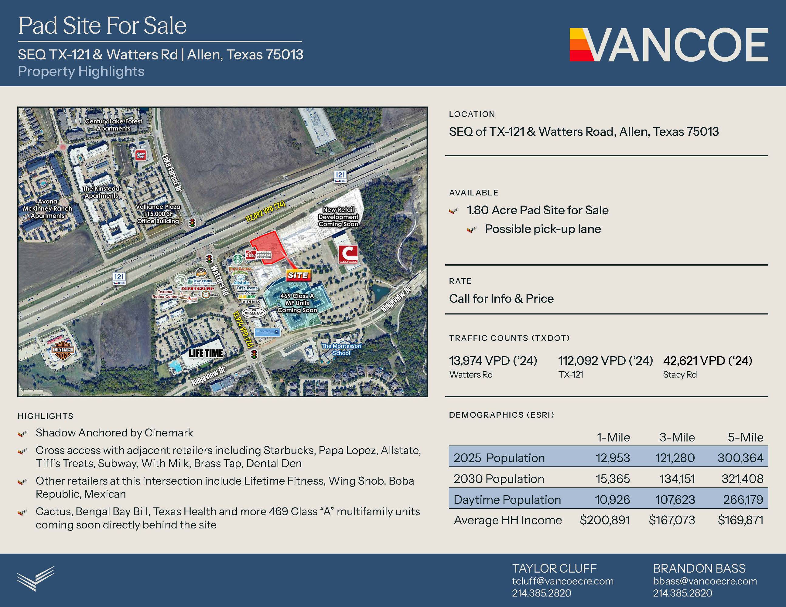 This 1.80-acre pad site is available for sale. The site is shadow-anchored by Cinemark and features cross access with adjacent retailers, including Starbucks, Papa Lopez, Allstate, Tiff’s Treats, Subway, With Milk, Brass Tap, and Dental Den. Other retailers at the intersection include Life Time Fitness, Wing Snob, Boba Republic, Mexican Cactus, Bengal Bay Bill, and Texas Health. Additionally, 469 Class “A” multifamily units are coming soon directly behind the site.