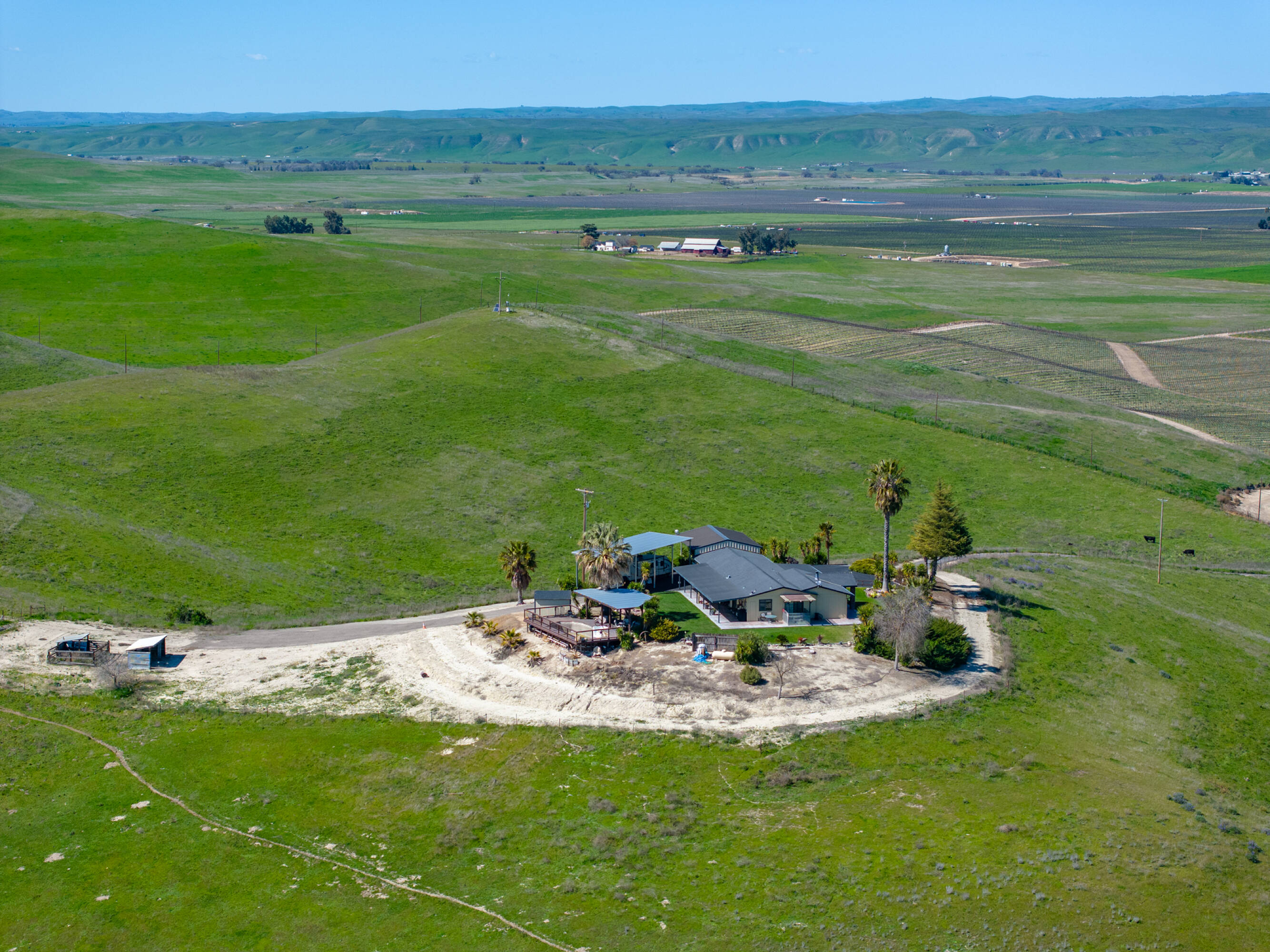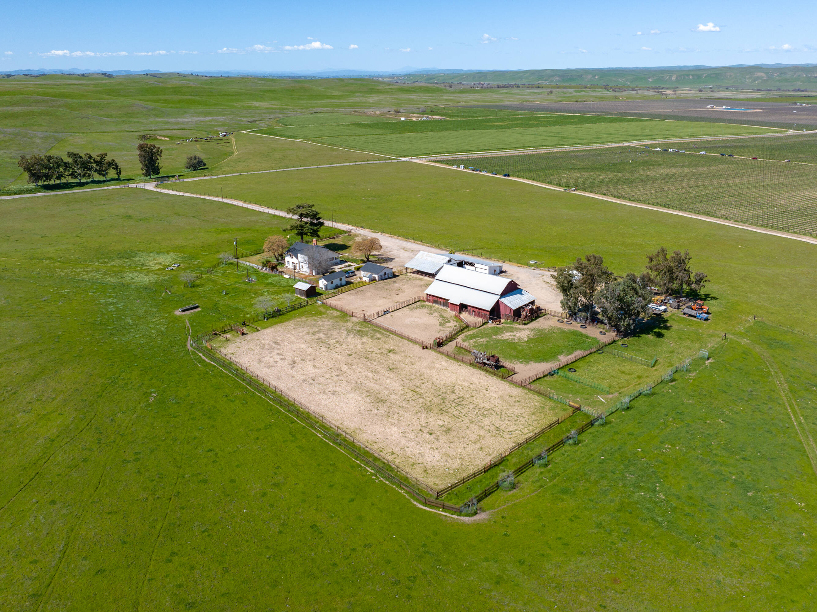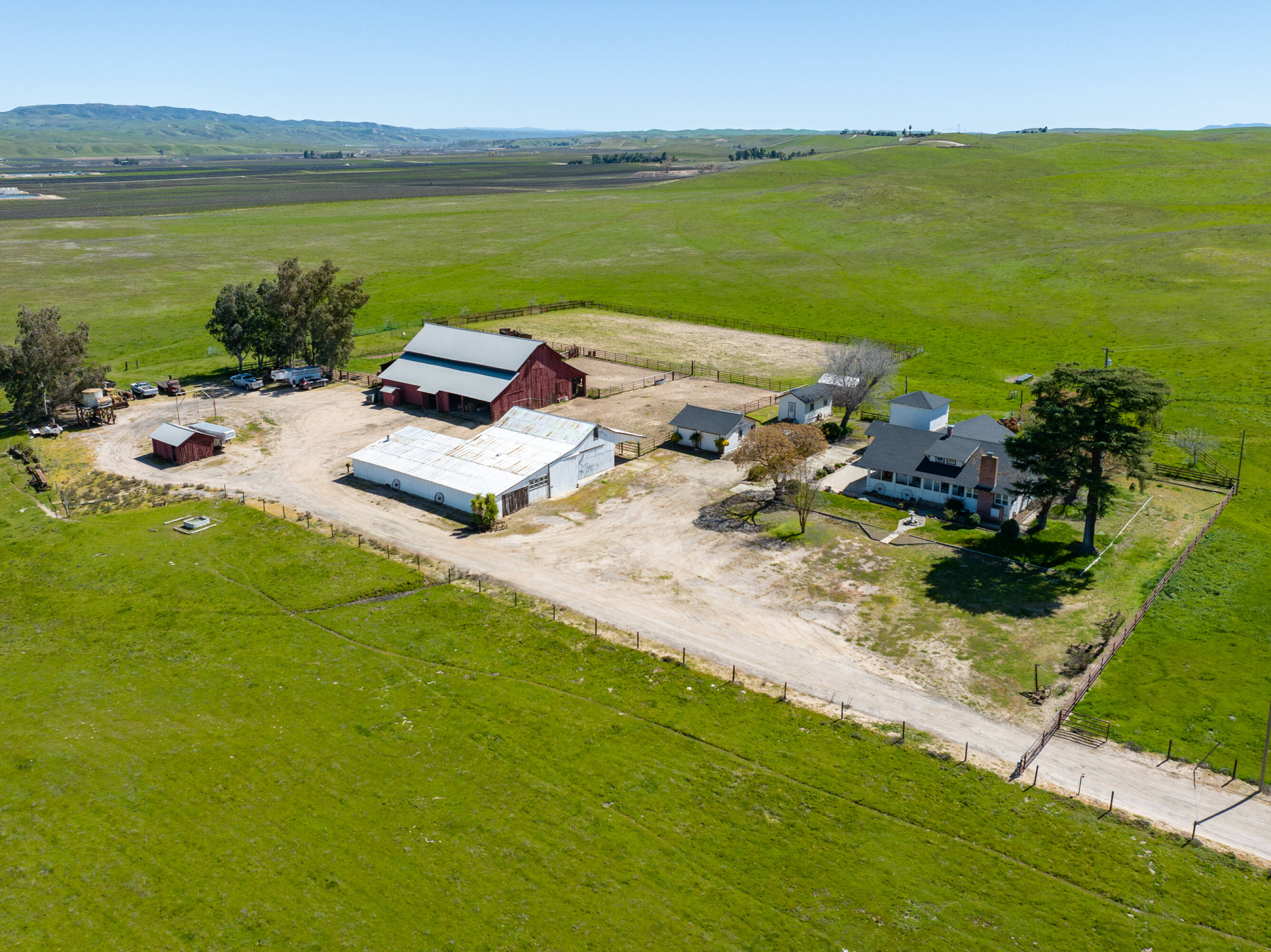 Kuhnle Shandon Ranch, situated near Paso Robles and Shandon, encompasses 3,055 acres of grazing land and dry farming operations. The ranch is conveniently located off Highway 46 East and along Highway 41, approximately 18 miles east of Highway 101, providing easy access to the San Joaquin Valley and coastal towns. The property includes 27 certificated parcels and is enveloped by four Williamson Act Contracts. This working cattle ranch and dryland farm features three residences, two barns, and numerous outbuildings, with perimeter and cross fencing. Horse facilities include barns, pens, an arena, and riding trails, along with cattle pens and troughs. Water is supplied by five wells, ensuring ample water for stock and domestic use. The main headquarters, located at 2500 South Highway 41, features a 2,845-square-foot home built in 1912 with five bedrooms, two bathrooms, and a detached water tower. Additional improvements include a 4,320-square-foot wood barn with an attached hay shed, a 3,321-square-foot granary used for storage, a 1,100-square-foot shop, a small garage, a detached two-car garage, a bunkhouse, an oil shed, paddocks, a riding arena, and corrals. Farmstead One, at 2225 Shandon Highway, includes two residences: a 1,422-square-foot home with three bedrooms and one bath, and an 858-square-foot home with two bedrooms and one bathroom, along with a 2,240-square-foot horse barn. Farmstead Two, at 3005 Truesdale Road, features a 1,700-square-foot manufactured home with three bedrooms, two bathrooms, an attached garage, an attached carport, and an above-ground pool. The property is zoned Agriculture and falls within the Paso Robles Groundwater Basin.