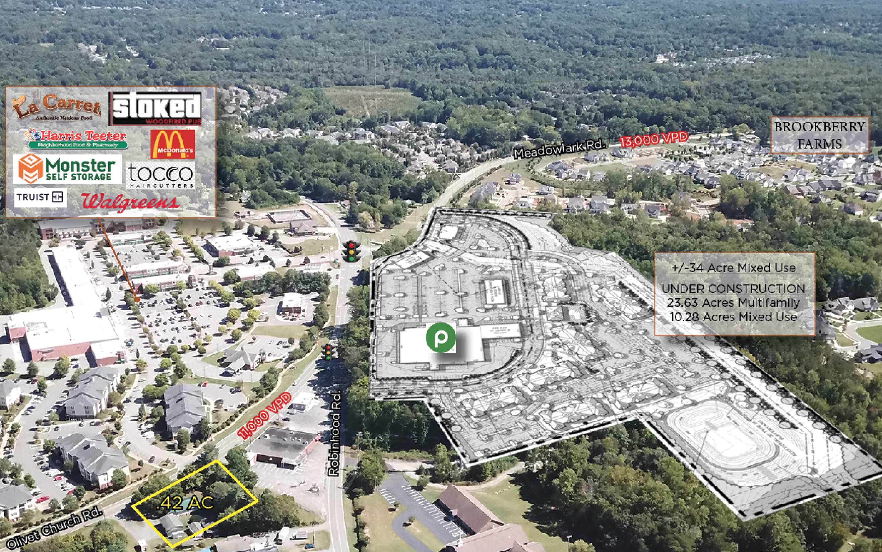 This +/- 0.42 acre parcel is located across from a +/- 34 acre mixed-use project currently under construction and anchored by Publix. The property benefits from traffic counts of 11,000 vehicles per day on Olivet Church Rd. and 13,000 vehicles per day on Robinhood Rd.