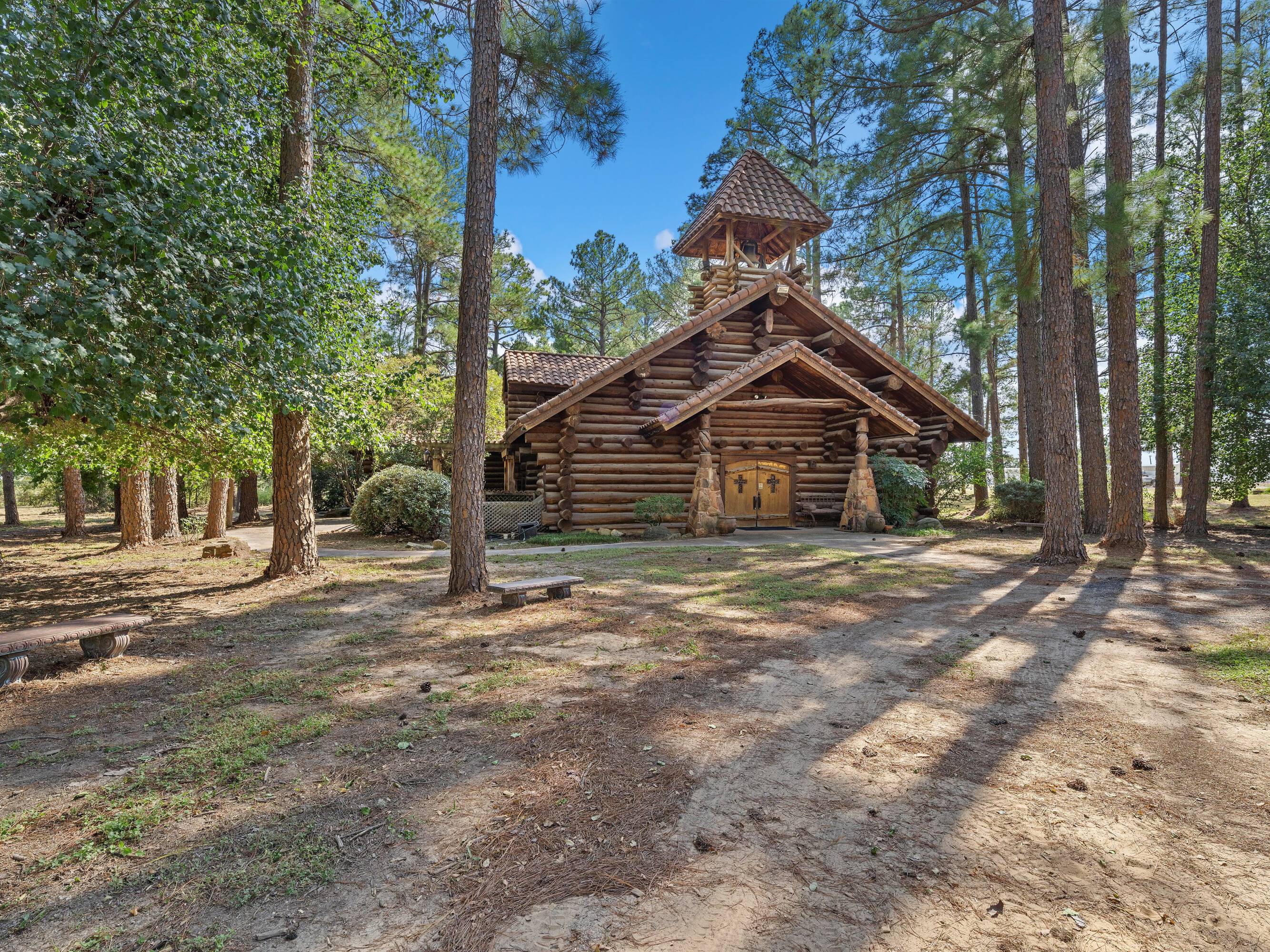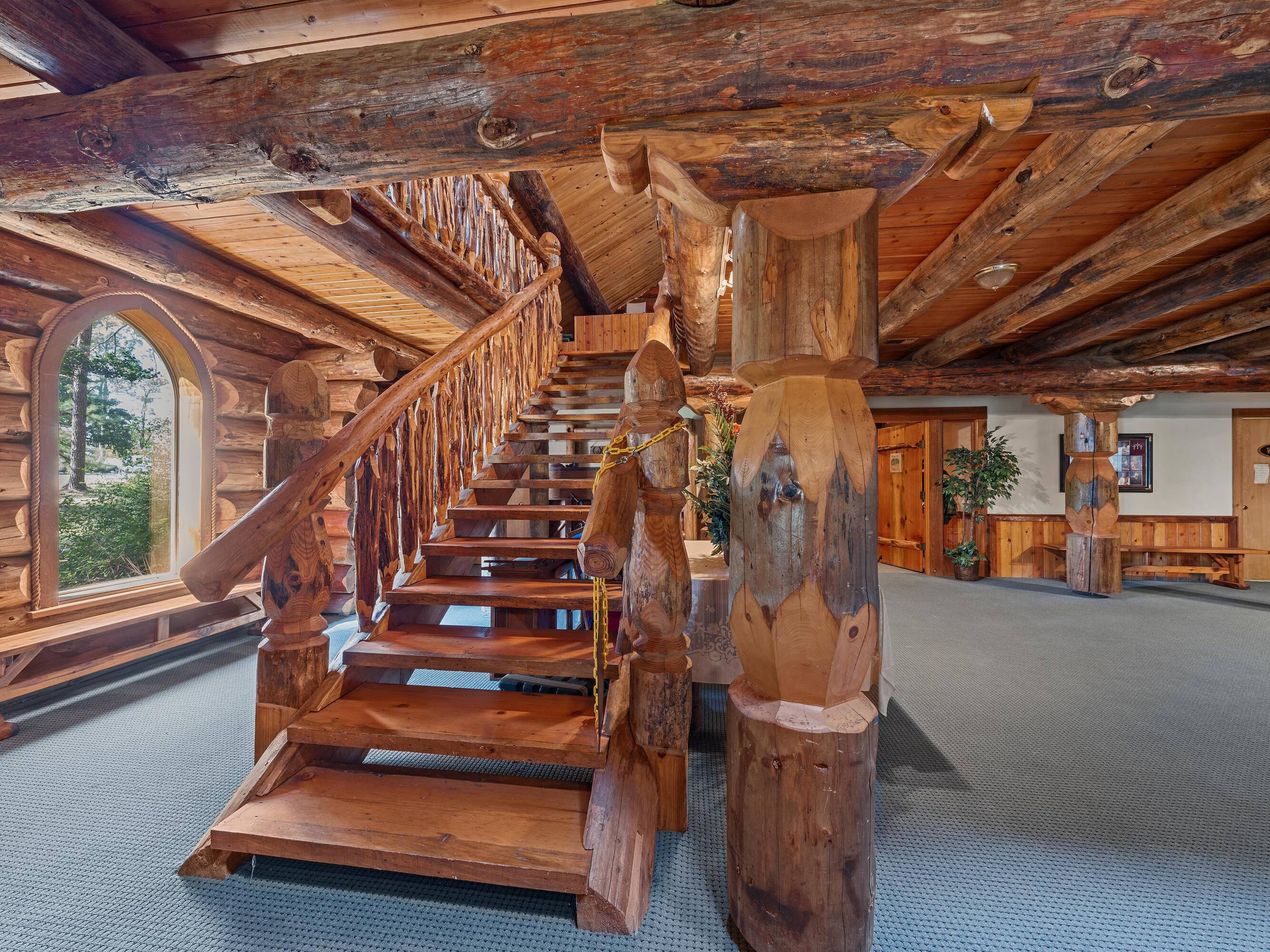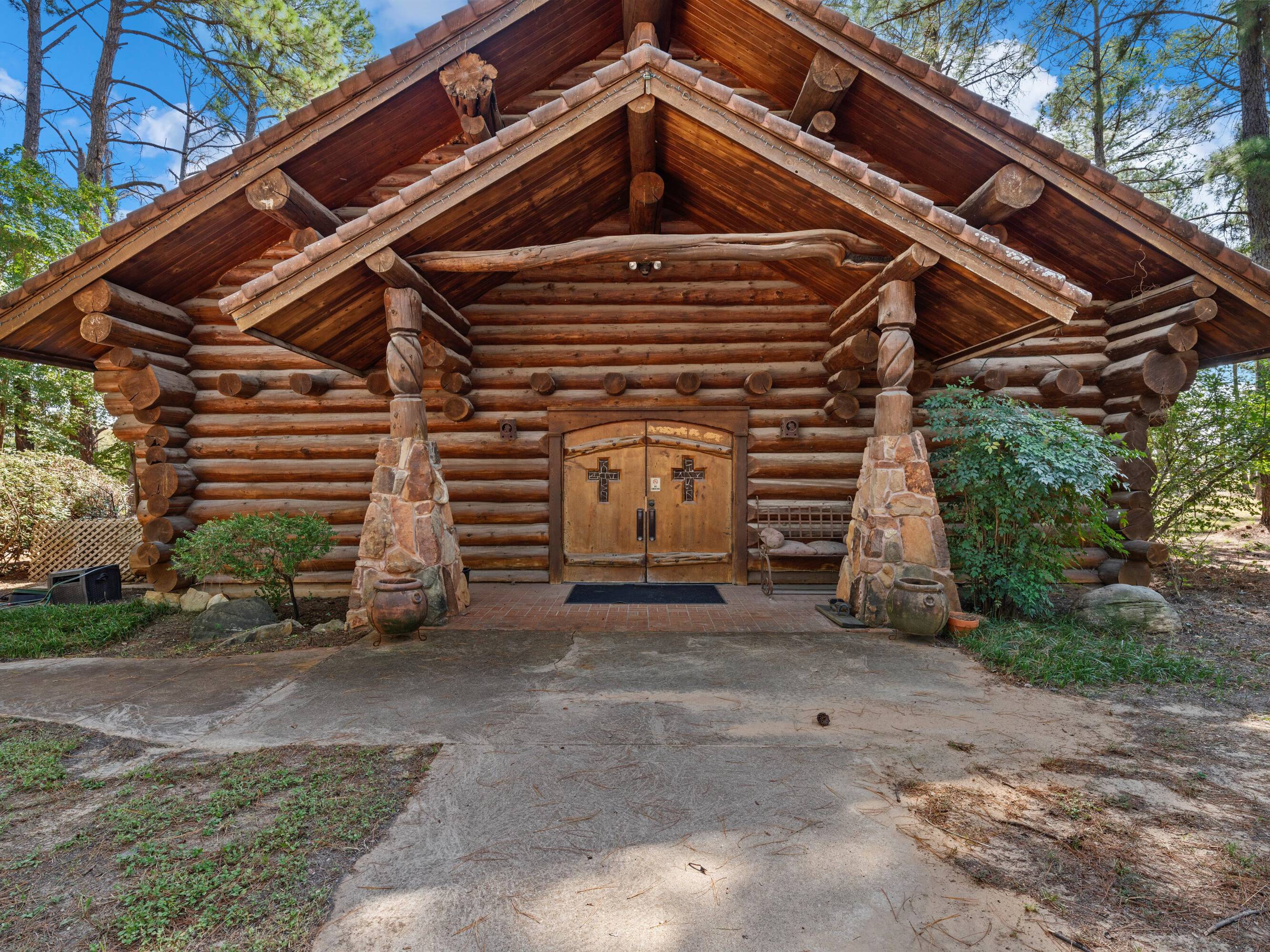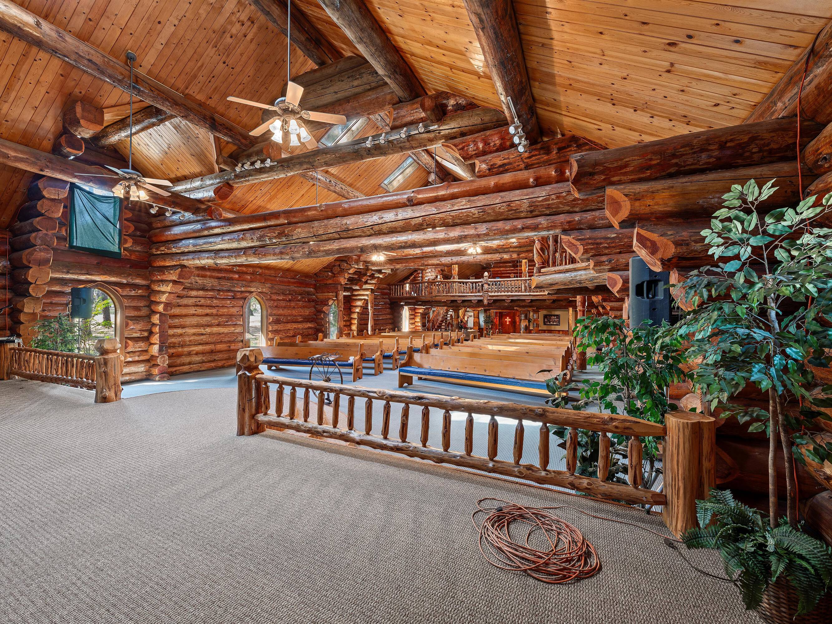 This scribed log cabin church, situated among pine trees, provides a peaceful and spiritual retreat. The handcrafted structure features scribed logs, showcasing craftsmanship and rustic elegance. Large windows allow natural light to illuminate the vaulted wood ceilings and exposed beams. The church is surrounded by pine trees, offering shade and tranquility. The property is ideal for weddings, special ceremonies, or quiet reflection. The church provides a blend of nature and architecture for those seeking a sacred space. The 7.51-acre property can be expanded into a wedding venue and event space. The building size is 5923 square feet.