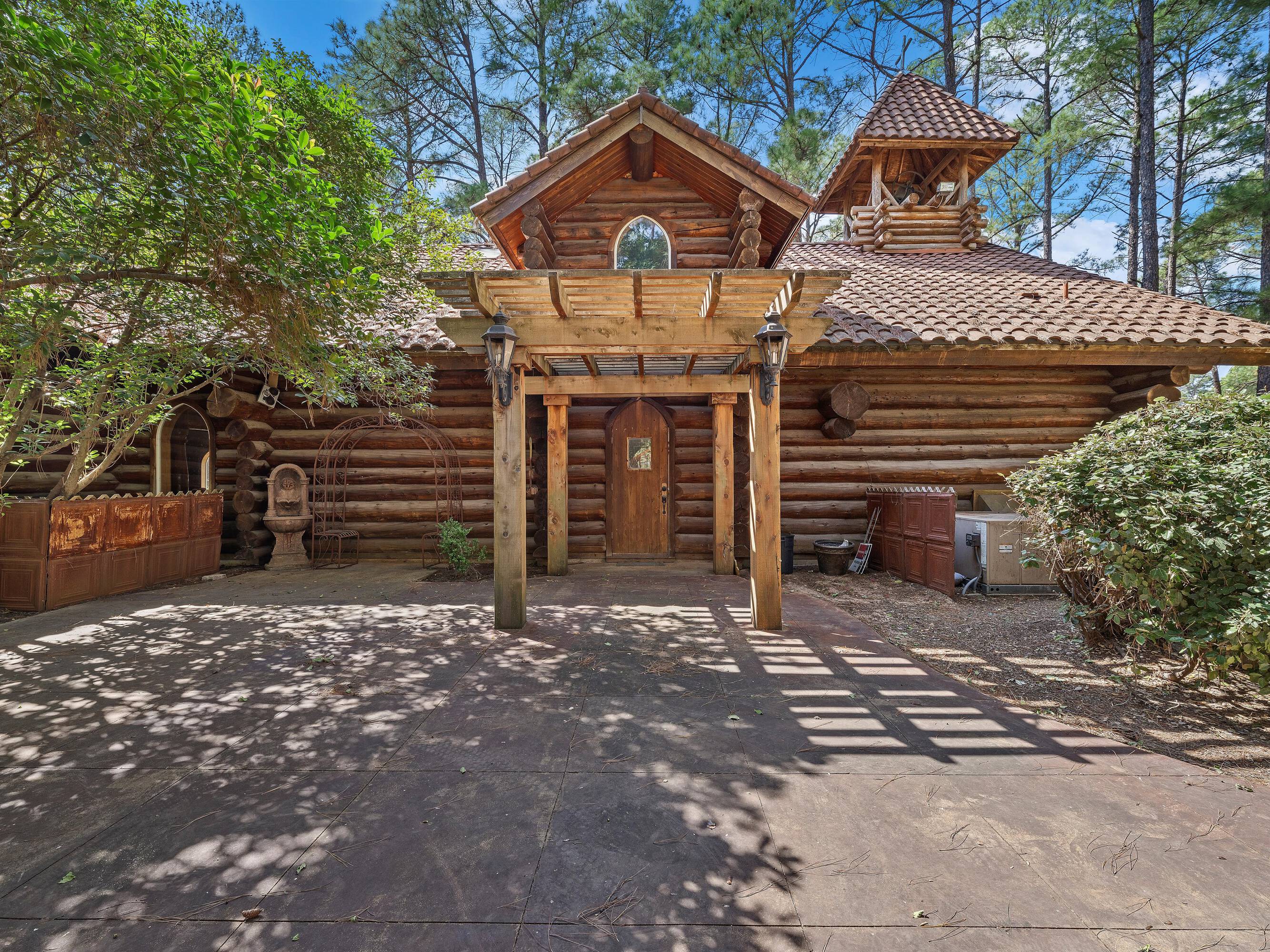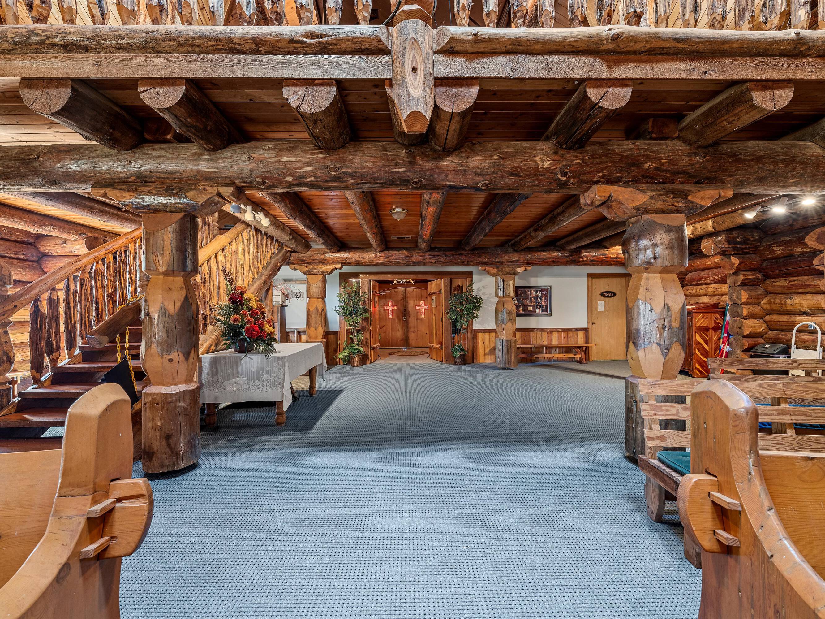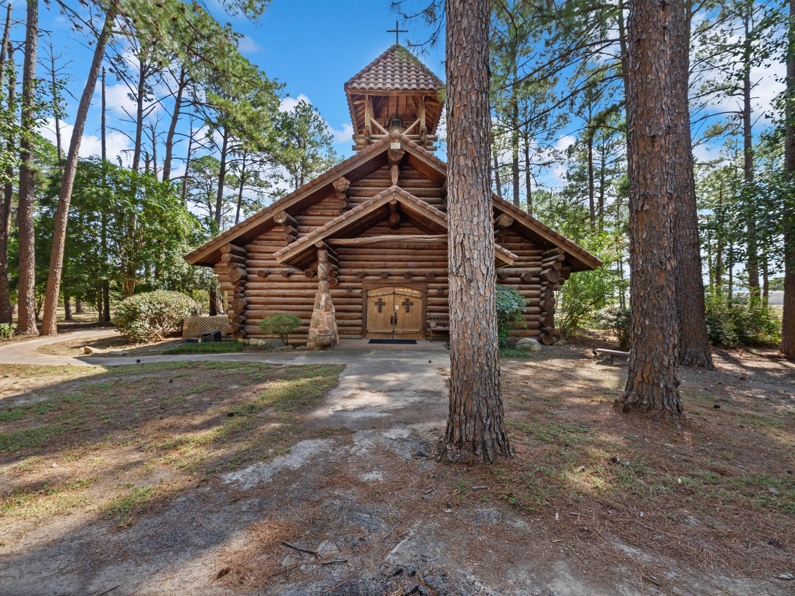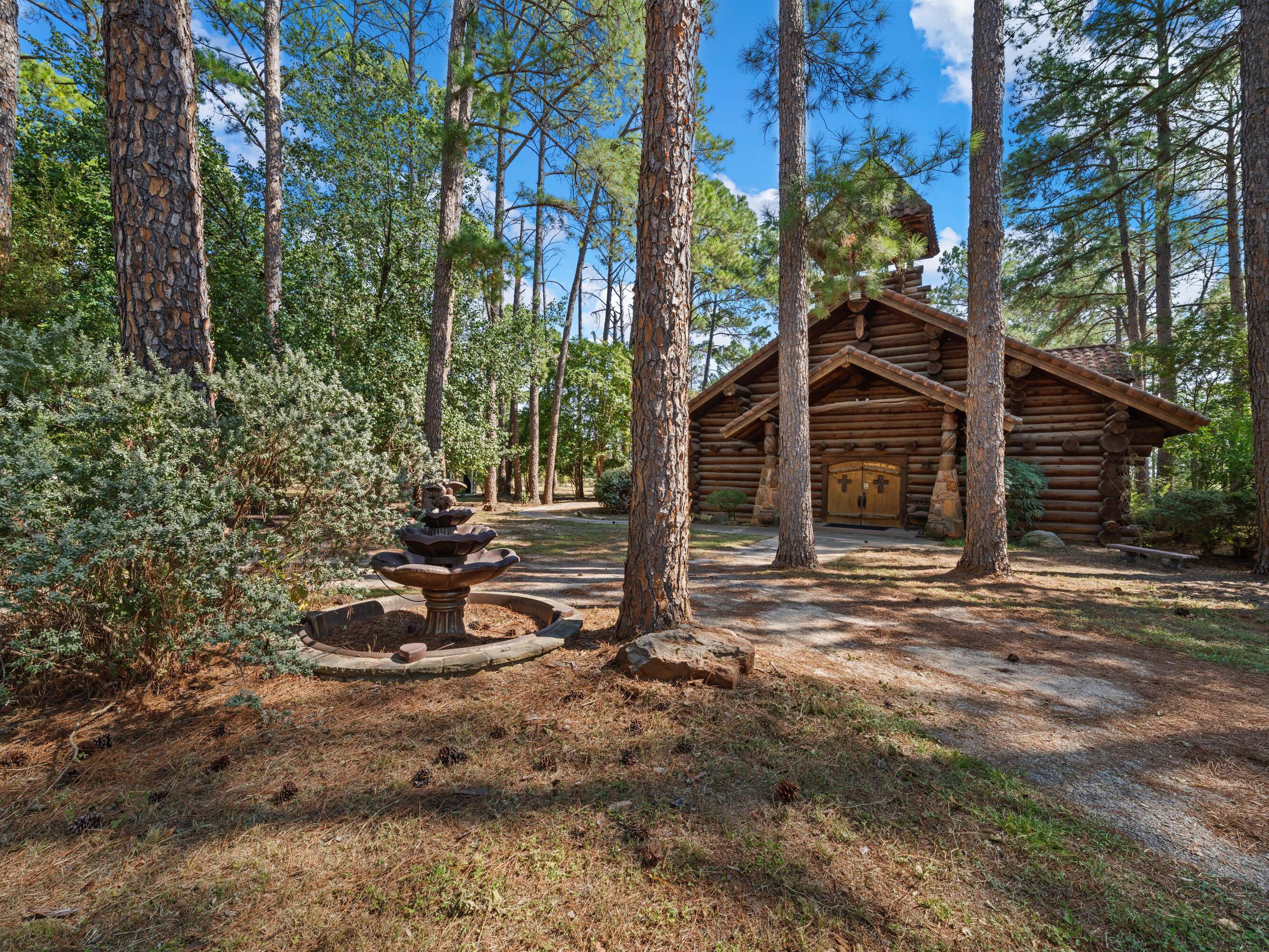 This scribed log cabin church, situated among pine trees, provides a peaceful and spiritual retreat. The handcrafted structure features scribed logs, showcasing craftsmanship and rustic elegance. Large windows allow natural light to illuminate the vaulted wood ceilings and exposed beams. The church is surrounded by pine trees, offering shade and tranquility. The property is ideal for weddings, special ceremonies, or quiet reflection. The church provides a blend of nature and architecture for those seeking a sacred space. The 7.51-acre property can be expanded into a wedding venue and event space. The building size is 5923 square feet.