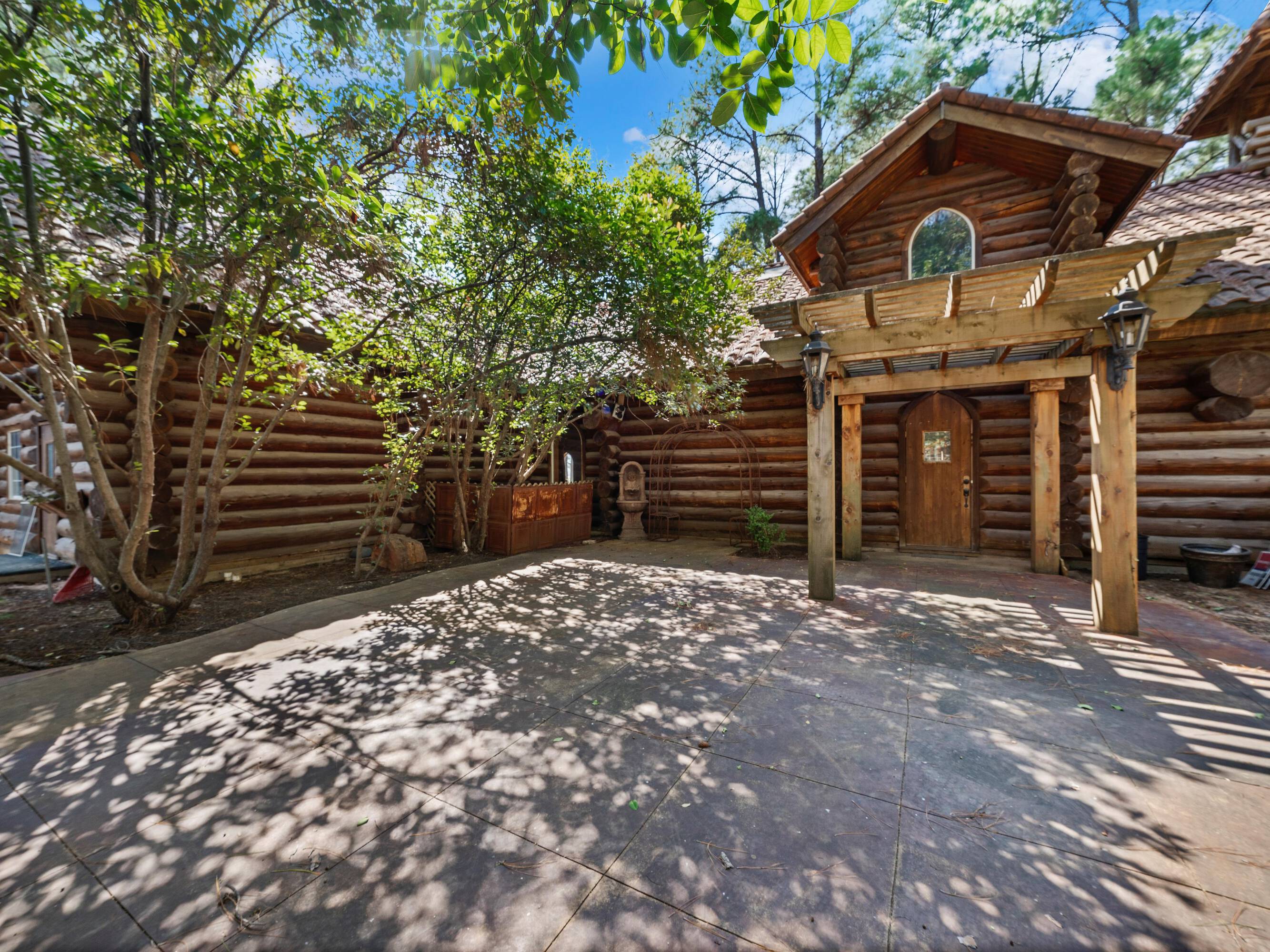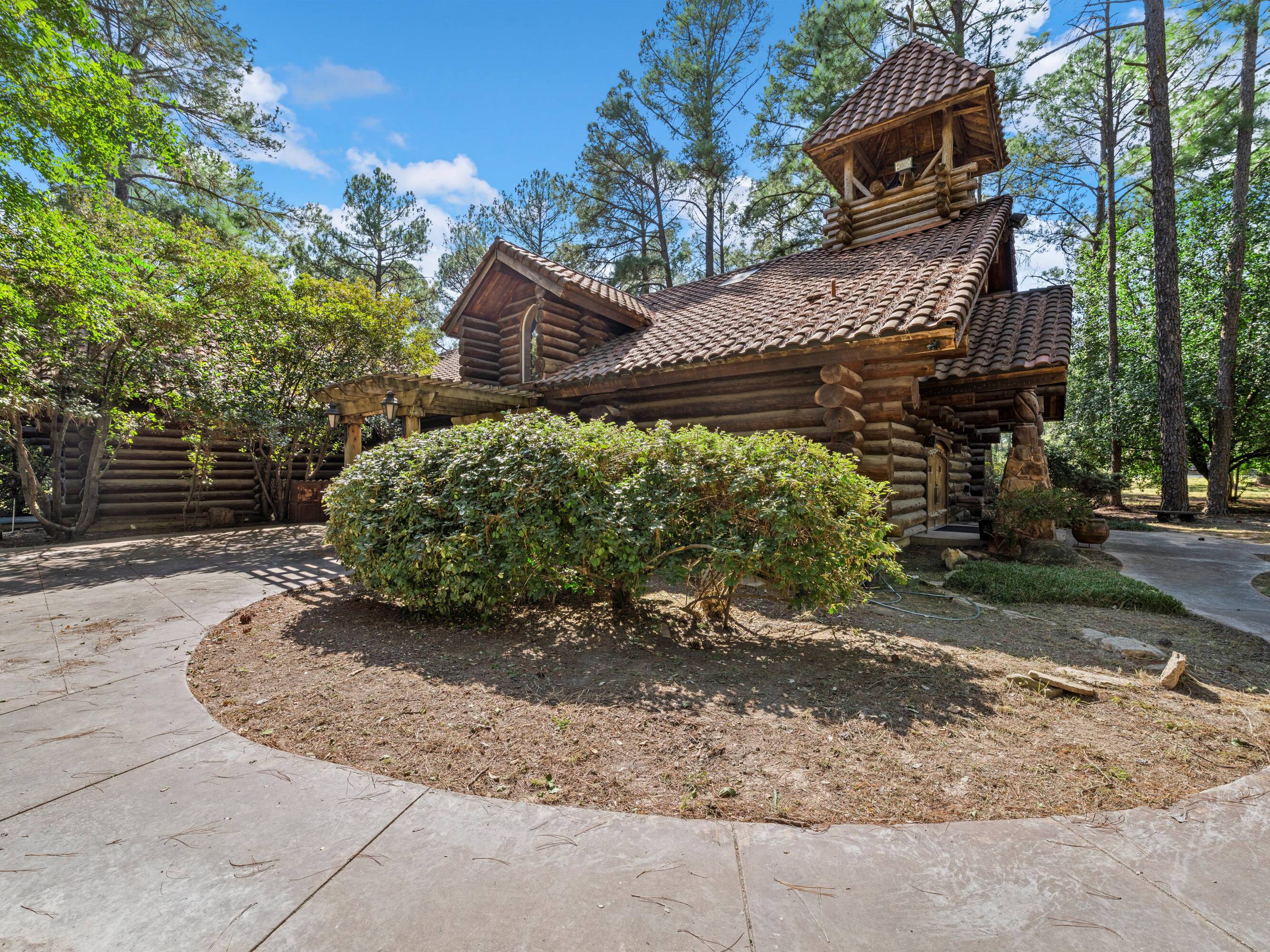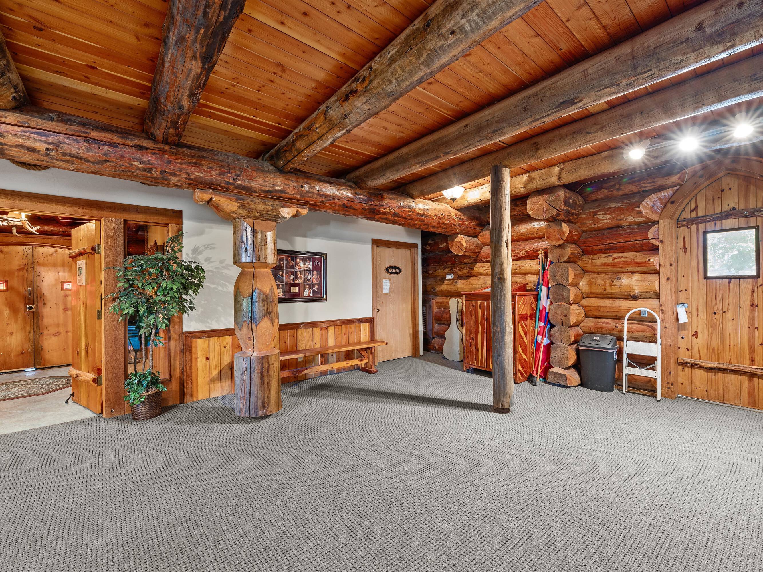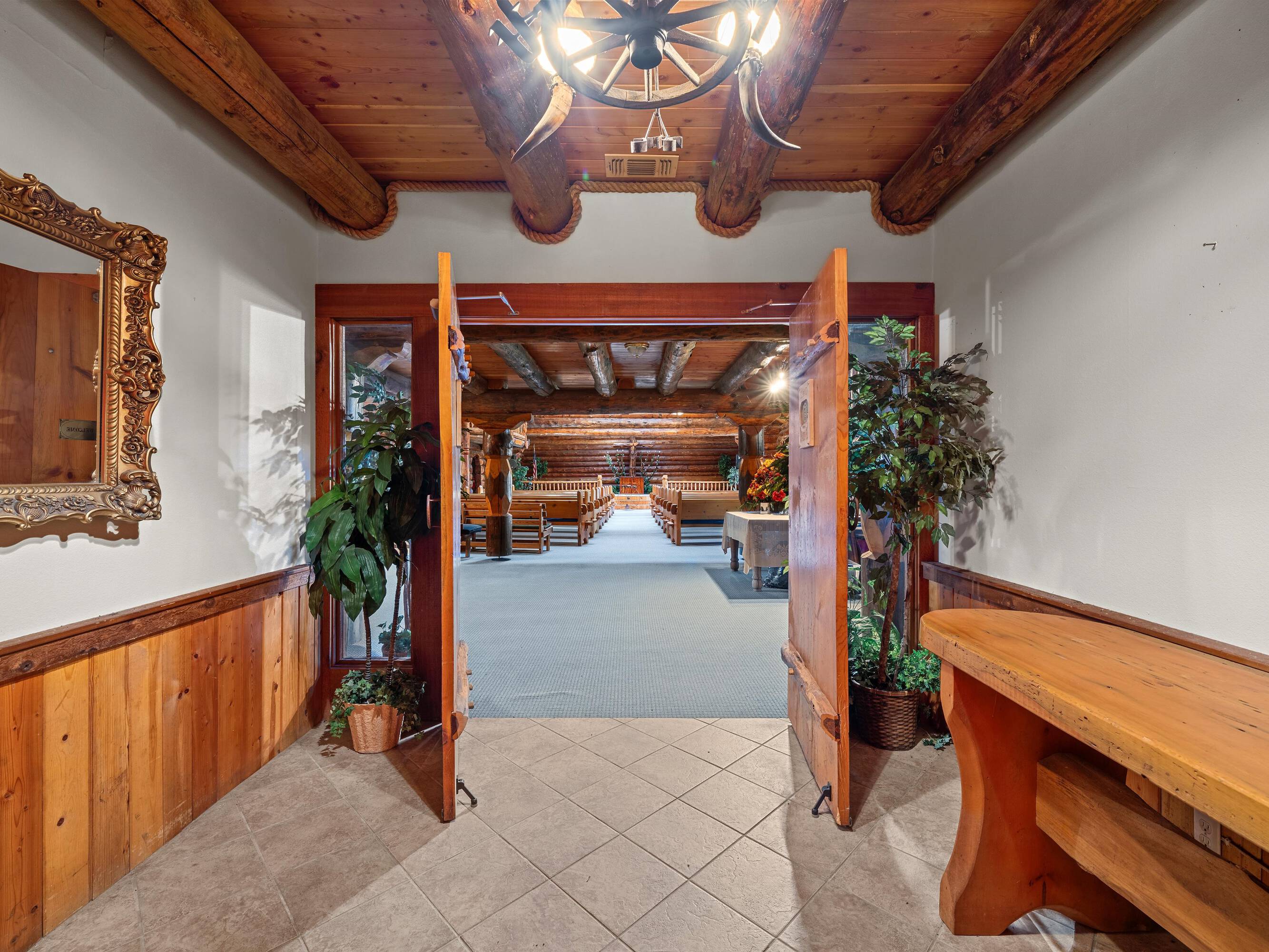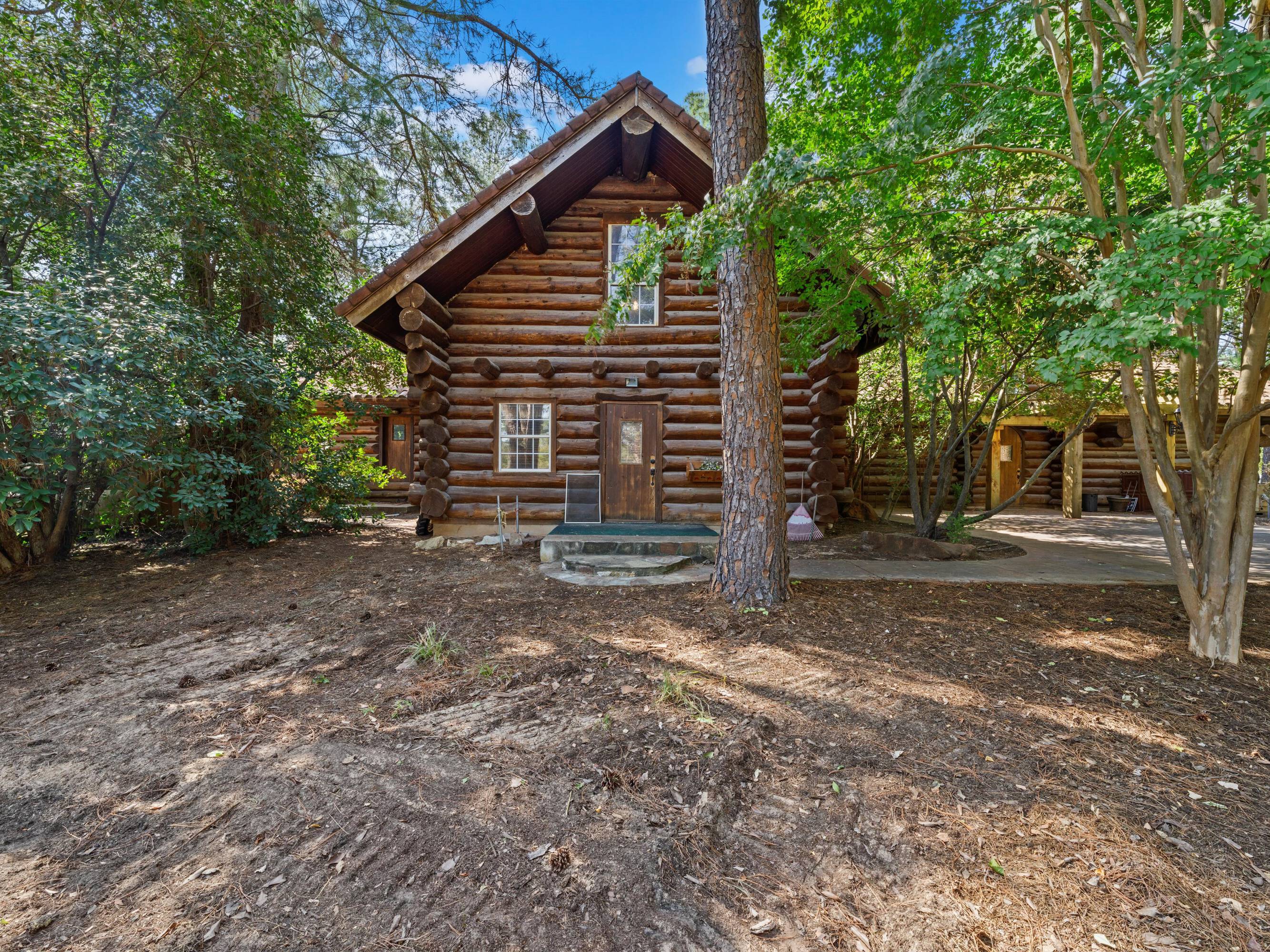 This scribed log cabin church, situated among pine trees, provides a peaceful and spiritual retreat. The handcrafted structure features scribed logs, showcasing craftsmanship and rustic elegance. Large windows allow natural light to illuminate the vaulted wood ceilings and exposed beams. The church is surrounded by pine trees, offering shade and tranquility. The property is ideal for weddings, special ceremonies, or quiet reflection. The church provides a blend of nature and architecture for those seeking a sacred space. The 7.51-acre property can be expanded into a wedding venue and event space. The building size is 5923 square feet.