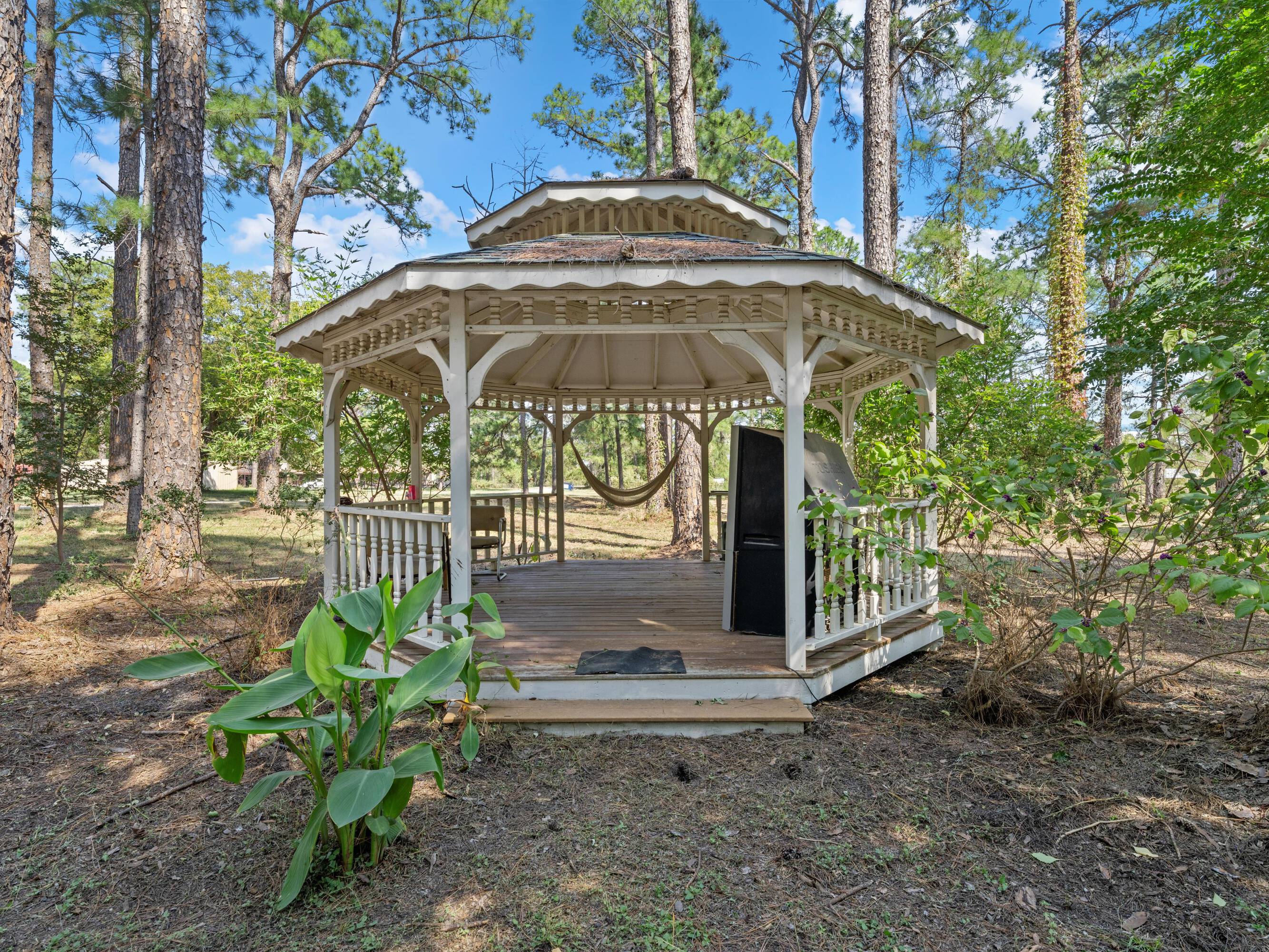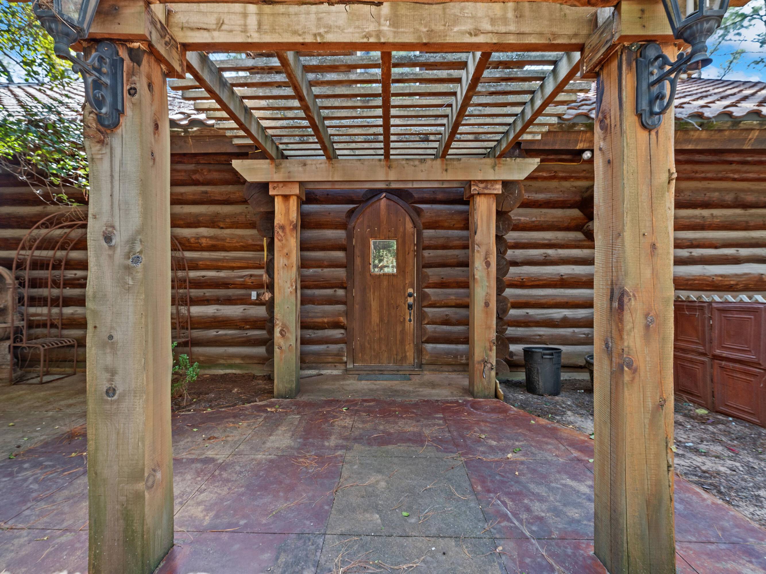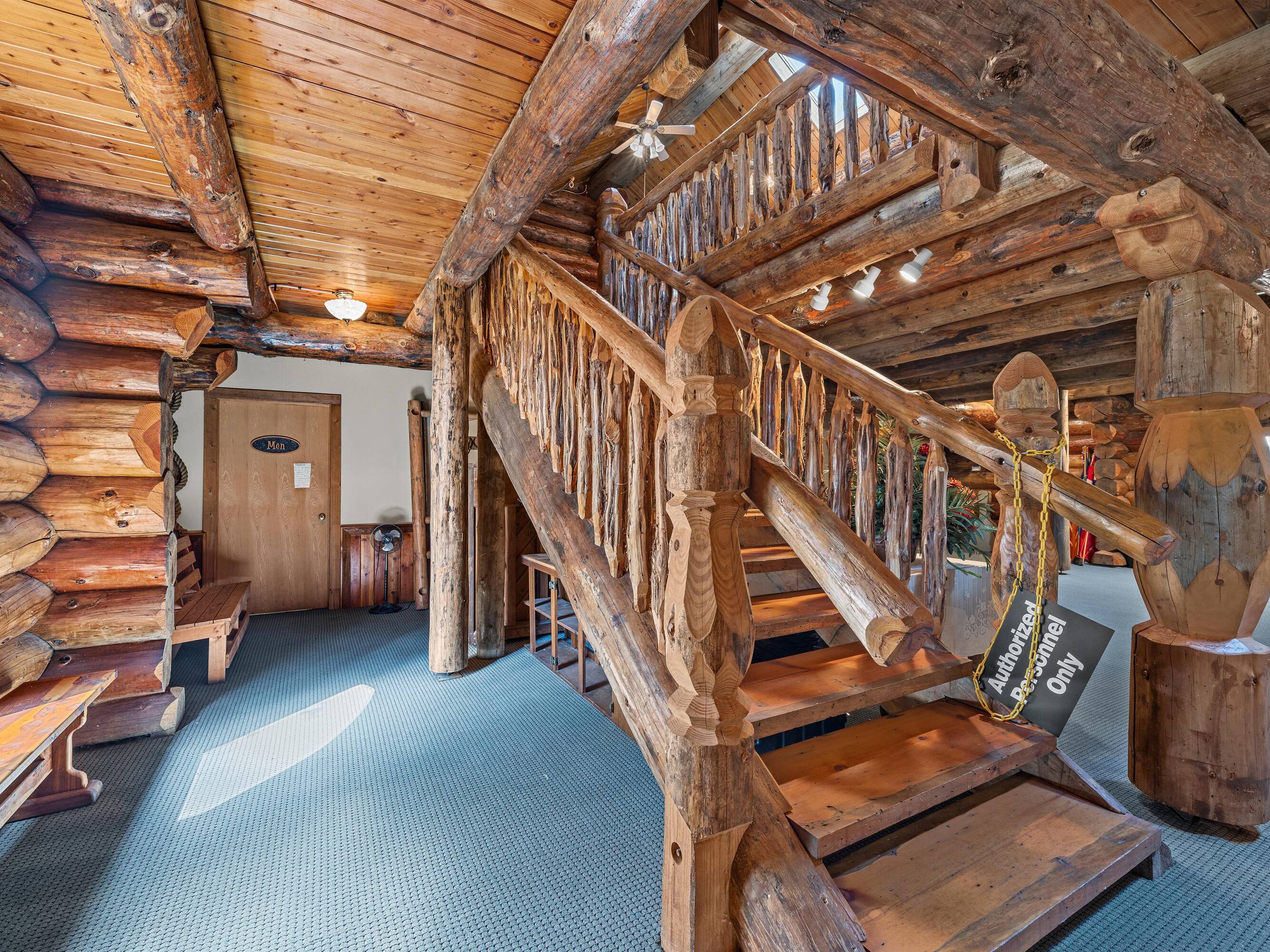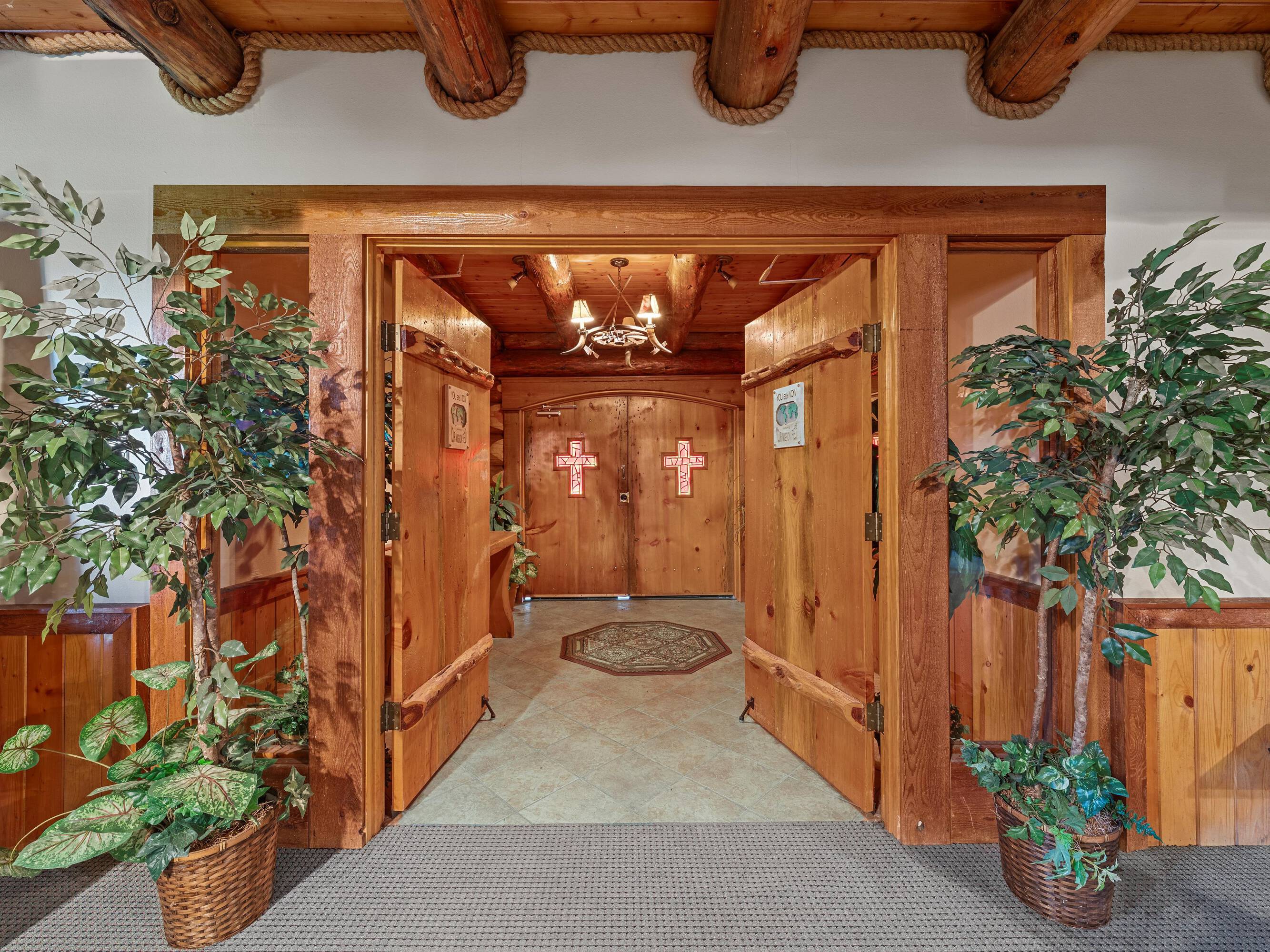 This scribed log cabin church, situated among pine trees, provides a peaceful and spiritual retreat. The handcrafted structure features scribed logs, showcasing craftsmanship and rustic elegance. Large windows allow natural light to illuminate the vaulted wood ceilings and exposed beams. The church is surrounded by pine trees, offering shade and tranquility. The property is ideal for weddings, special ceremonies, or quiet reflection. The church provides a blend of nature and architecture for those seeking a sacred space. The 7.51-acre property can be expanded into a wedding venue and event space. The building size is 5923 square feet.