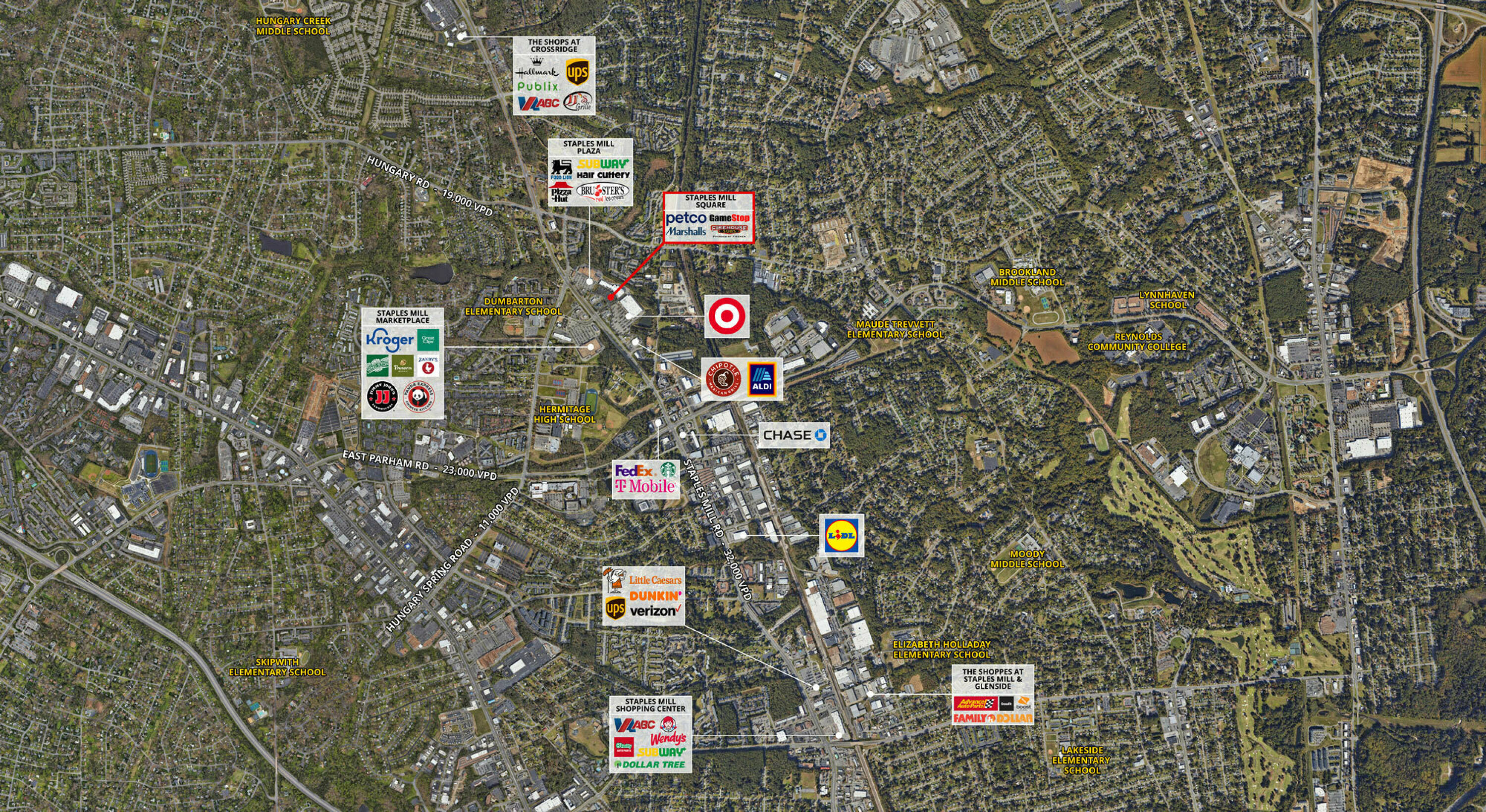 This property features: Anchored by Target for reliable customer traffic; Anchored by Food Lion, providing a steady stream of shoppers; Located off Staples Mill Road for easy access