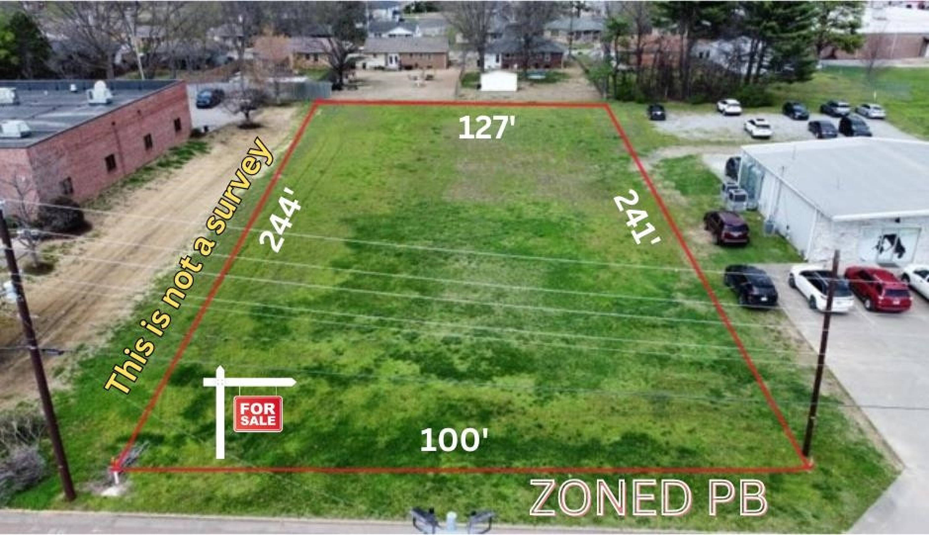 This is a large commercial lot zoned PB, suitable for various business ventures. A recent survey has been completed, and the corners of the property are marked.