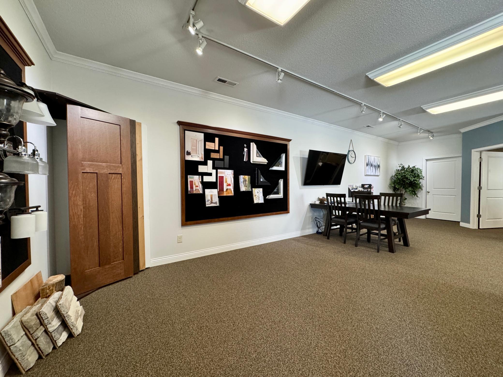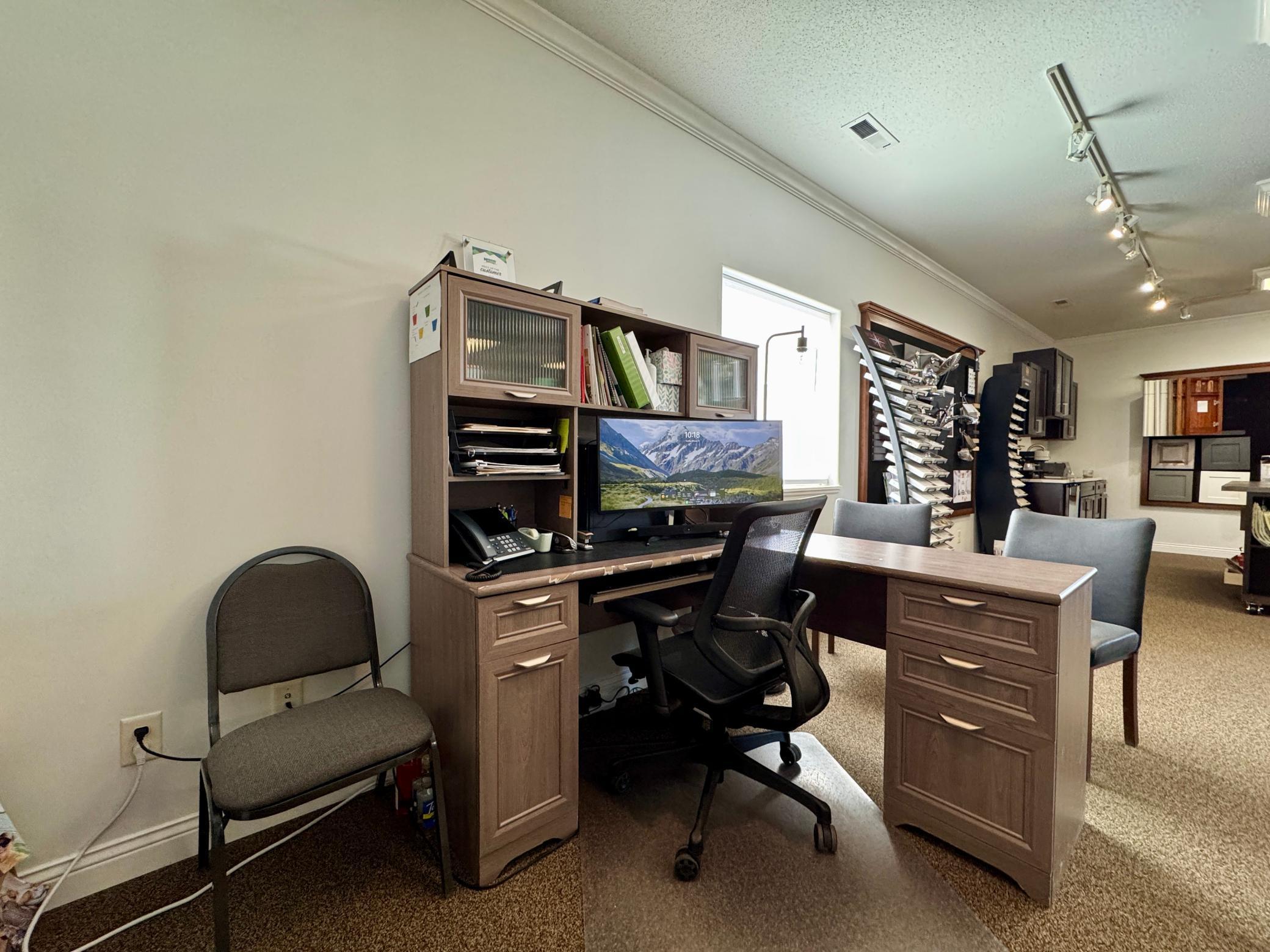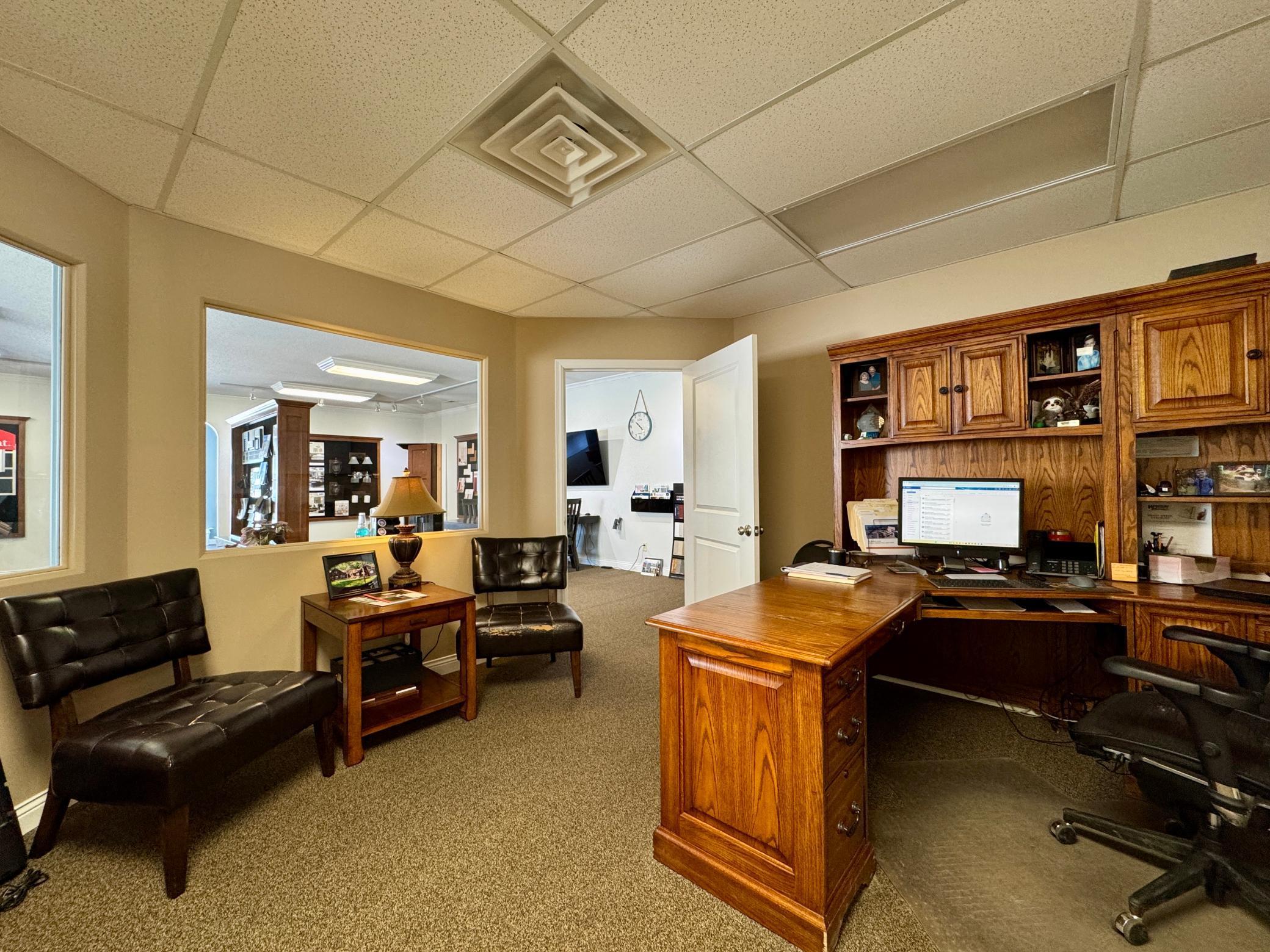 Commercial building with office space, storage, and paved parking.