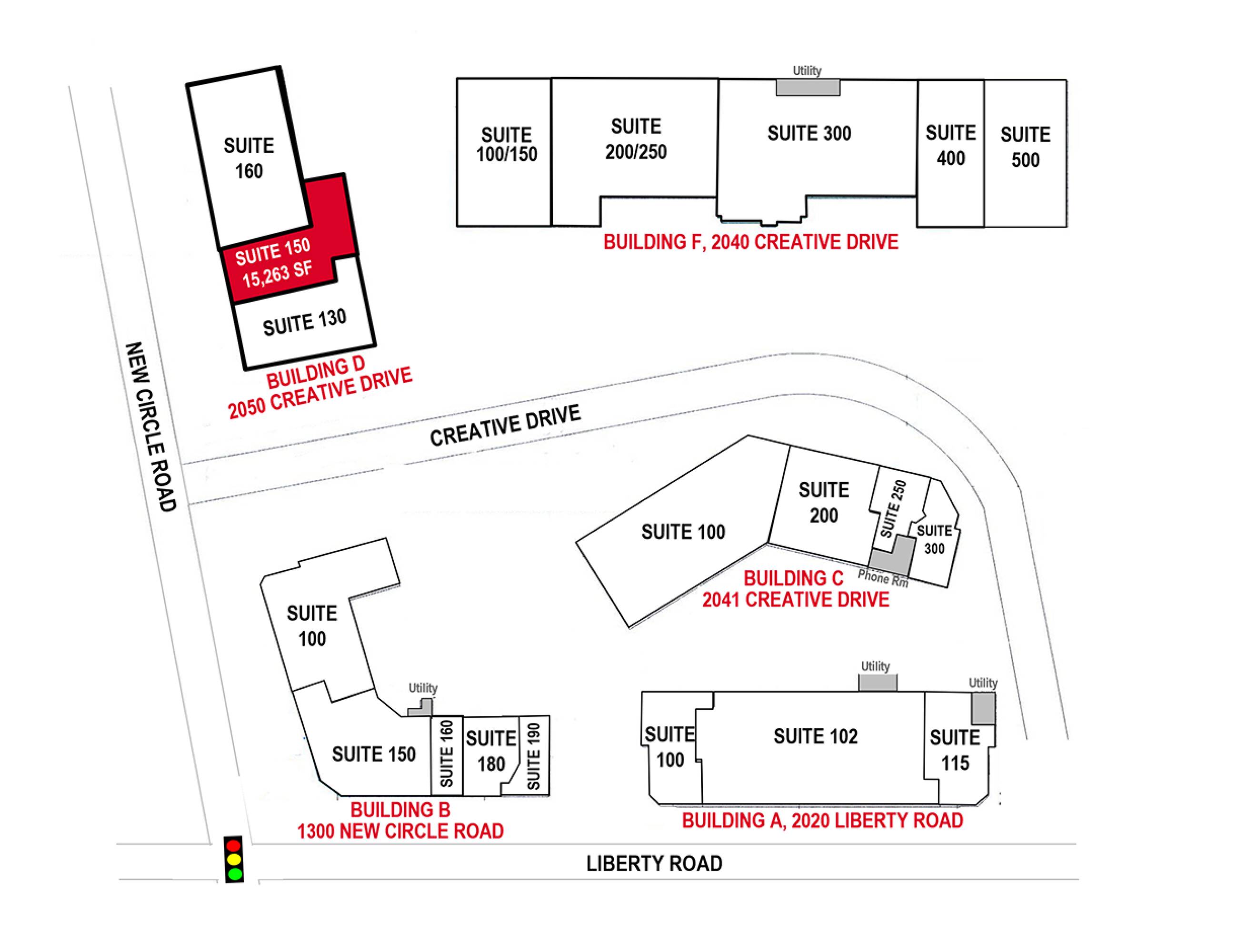 Five-building mixed-use development with office, retail, flex, and warehouse space.