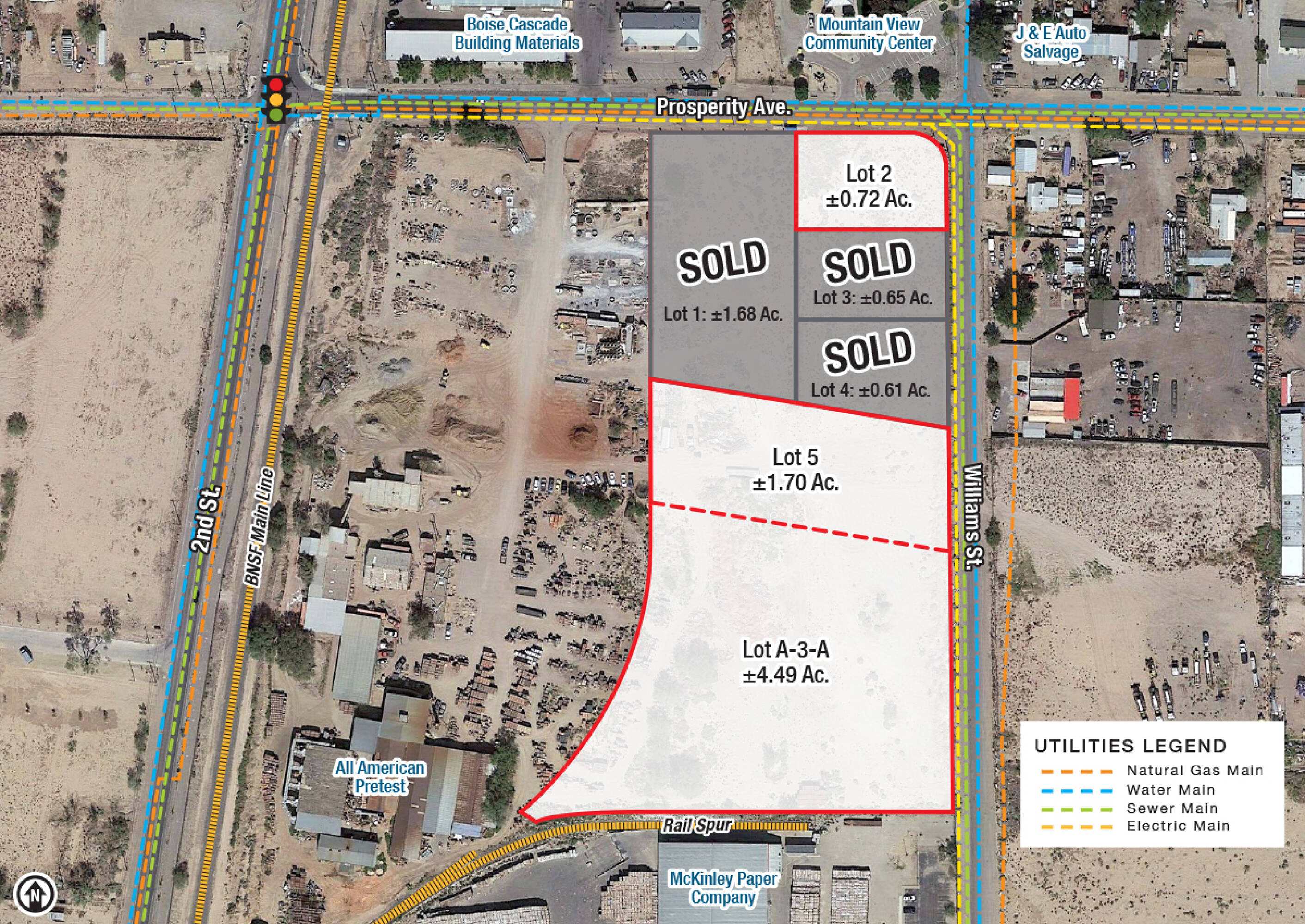Available for sale are several lots zoned for M-2 heavy manufacturing. Lot 2 is approximately 0.72 acres, Lot 5 is approximately 1.70 acres, and Lot A-3-A is approximately 4.49 acres. Lots 5 and A-3-A can be combined for a total of approximately 6.19 acres. The site is at grade level, and water, sewer, and natural gas services are available. An existing rail spur is accessible. Real estate contract financing is available.