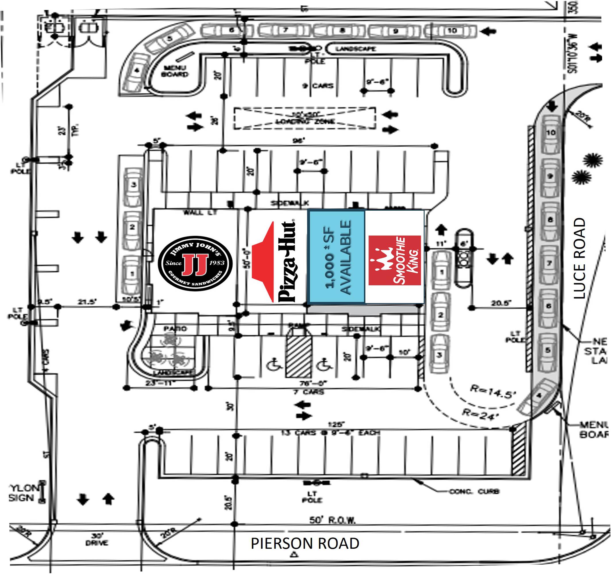 This property features: High‑visibility location at a signalized intersection (Pierson & Luce Rd).; Recently constructed retail strip center.; Join established tenants: Jimmy John’s, Smoothie King, and Pizza Hut.