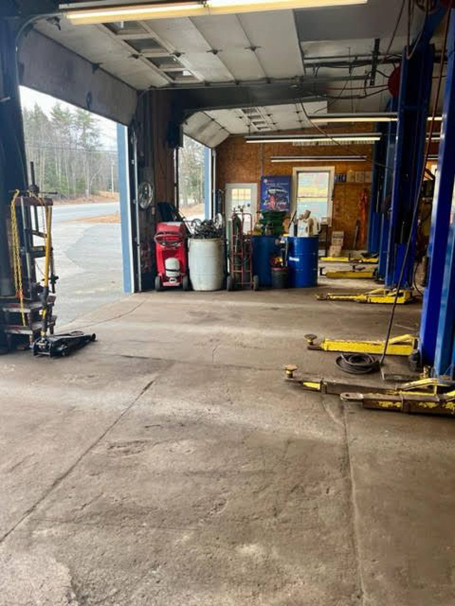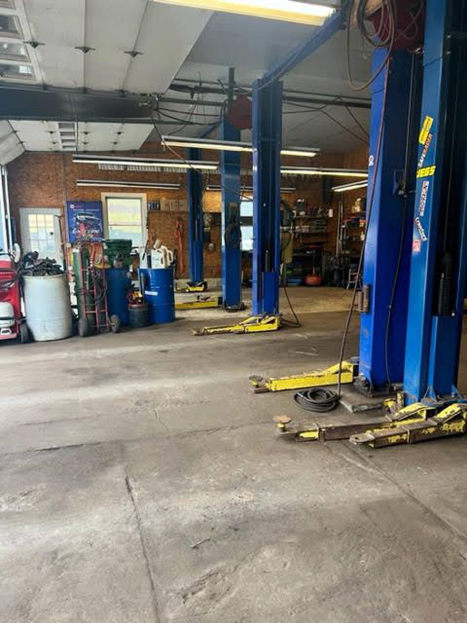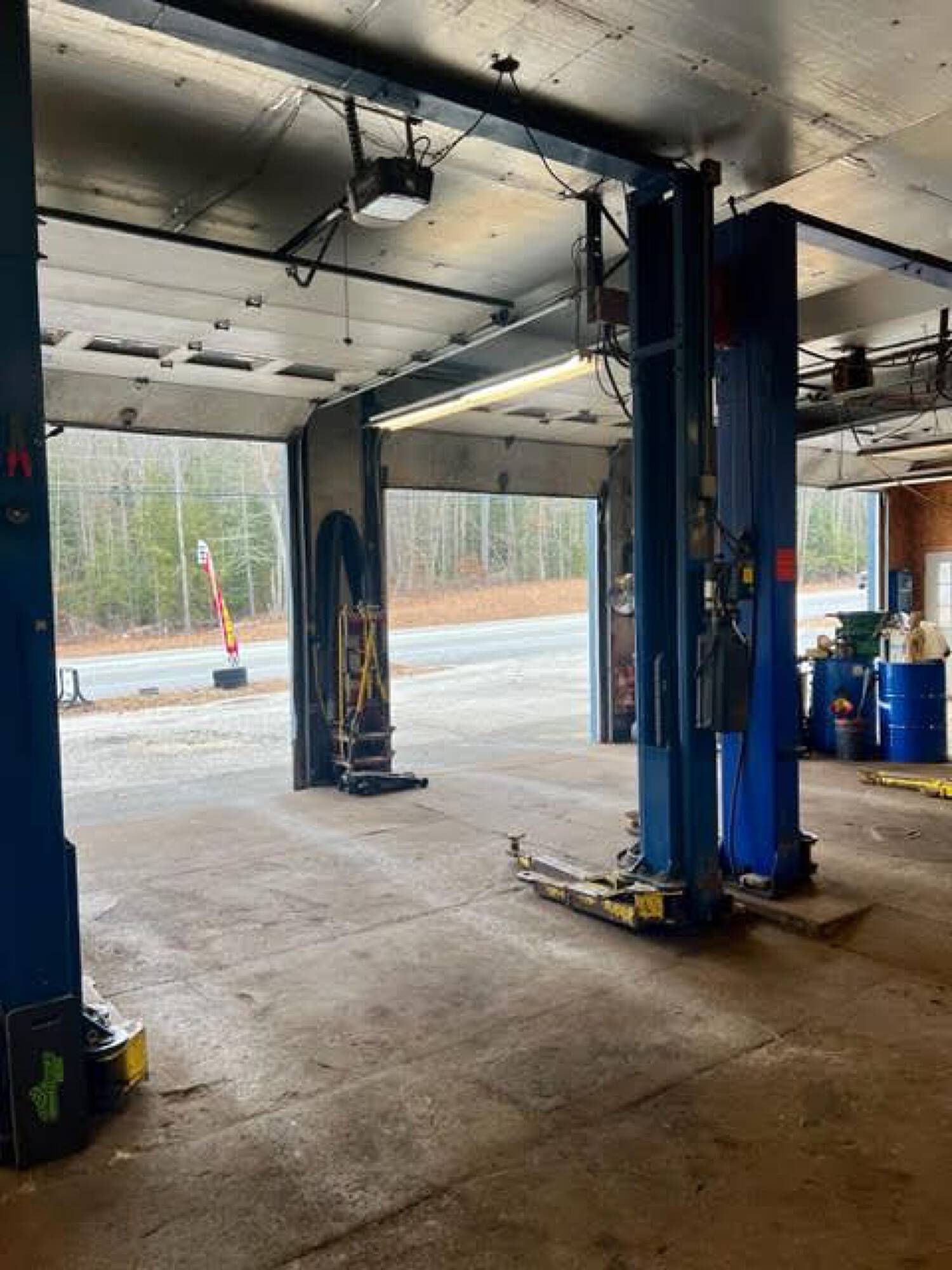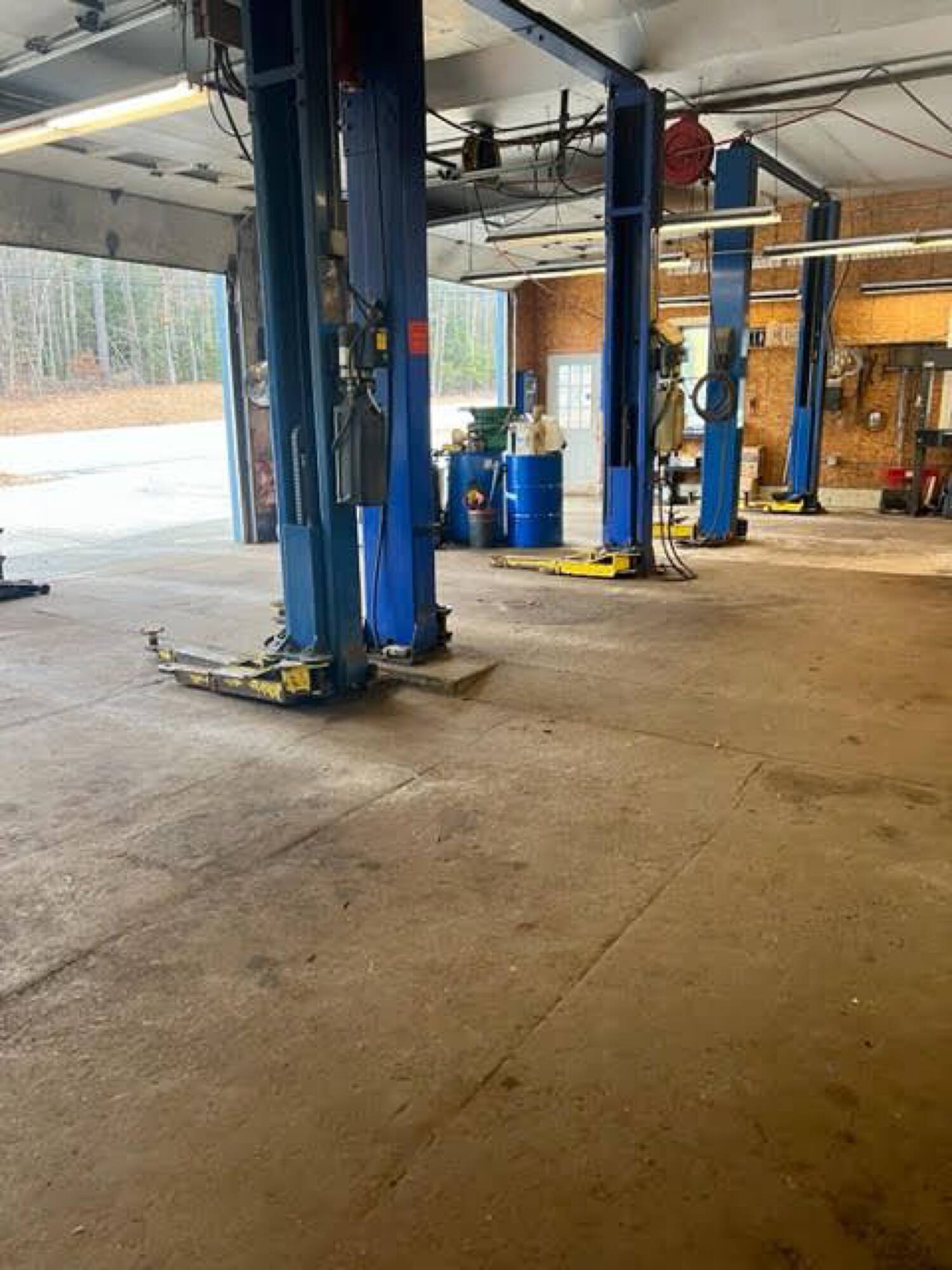 Three-bay auto garage with equipment and high visibility.