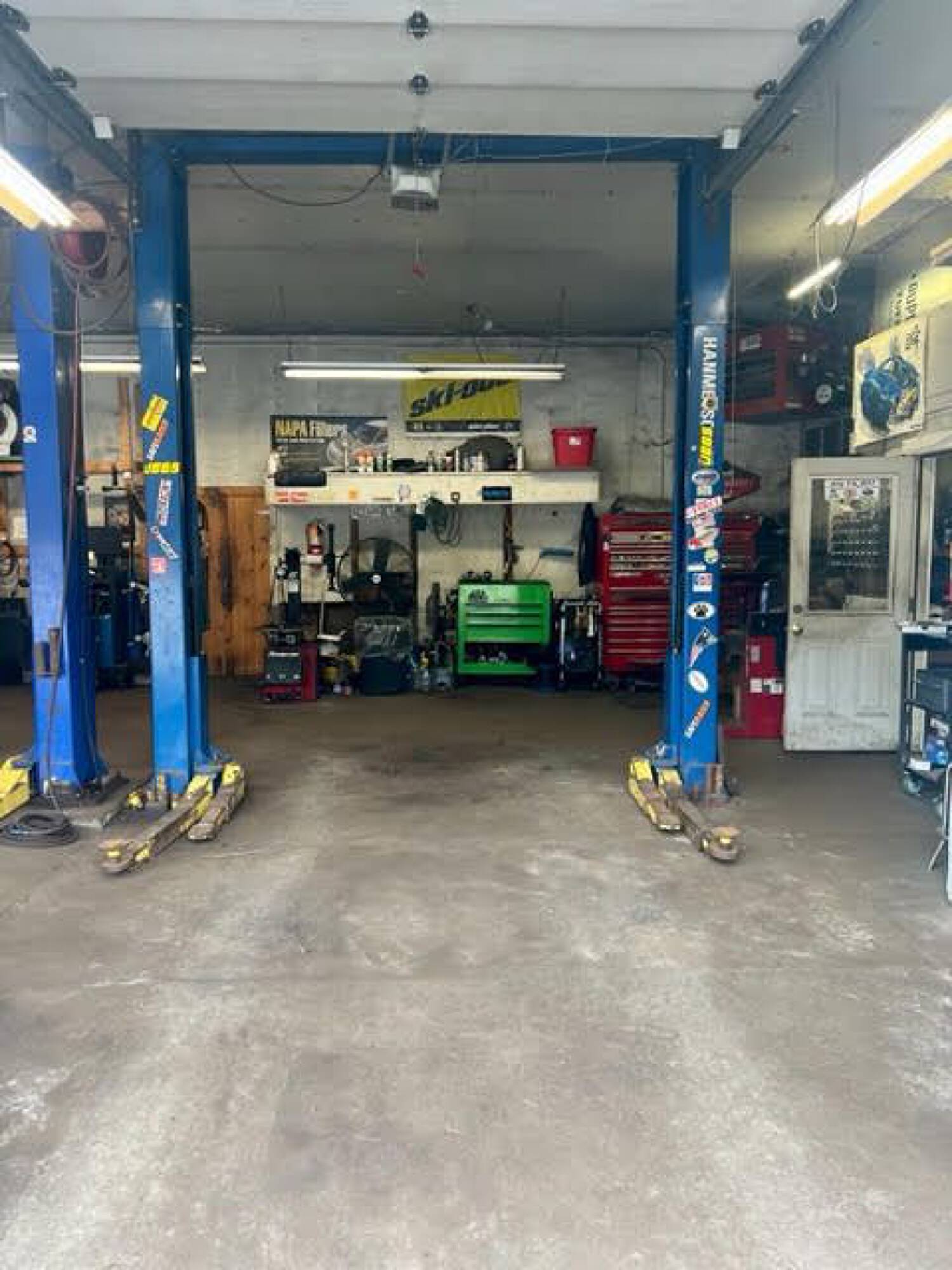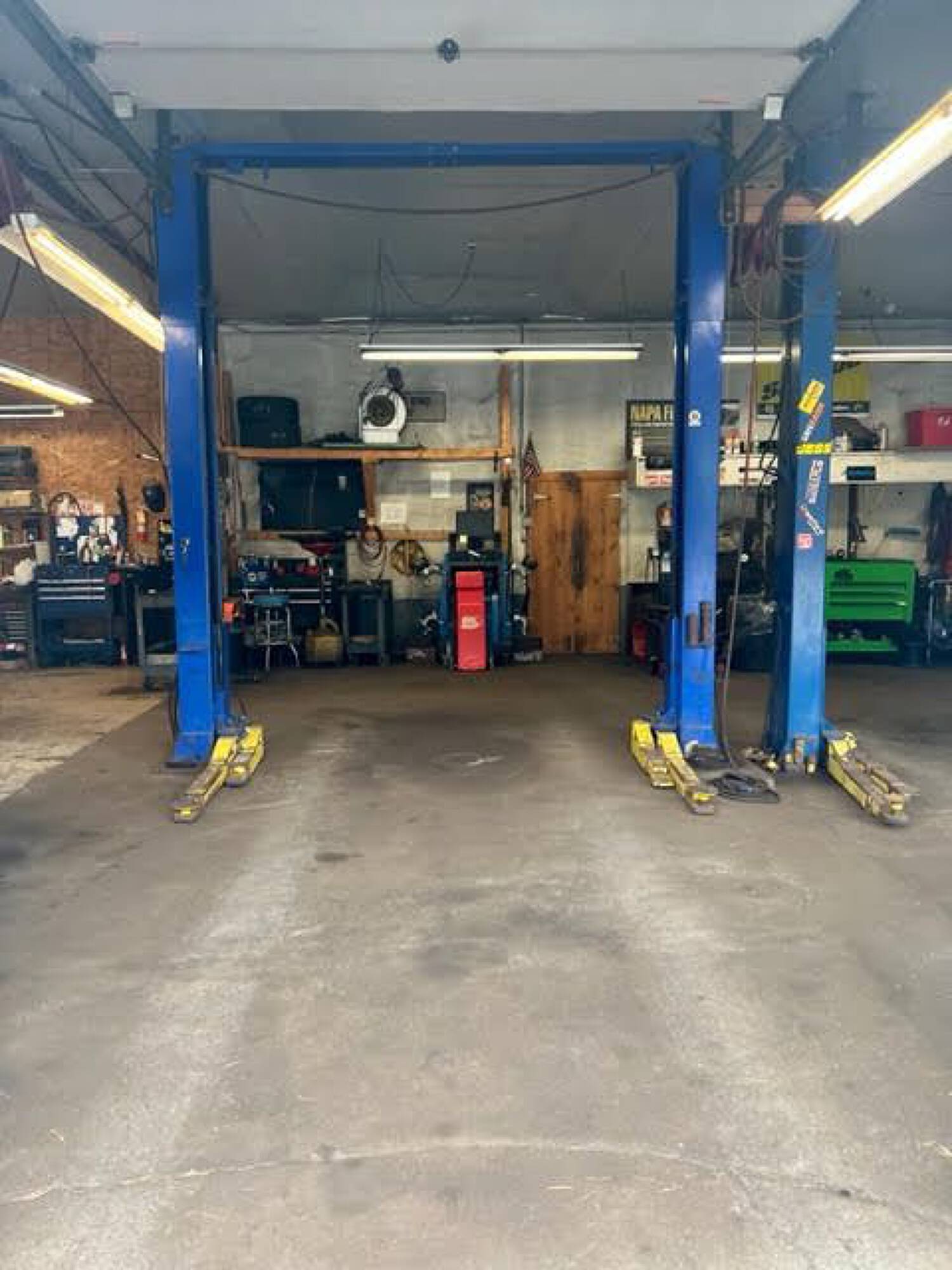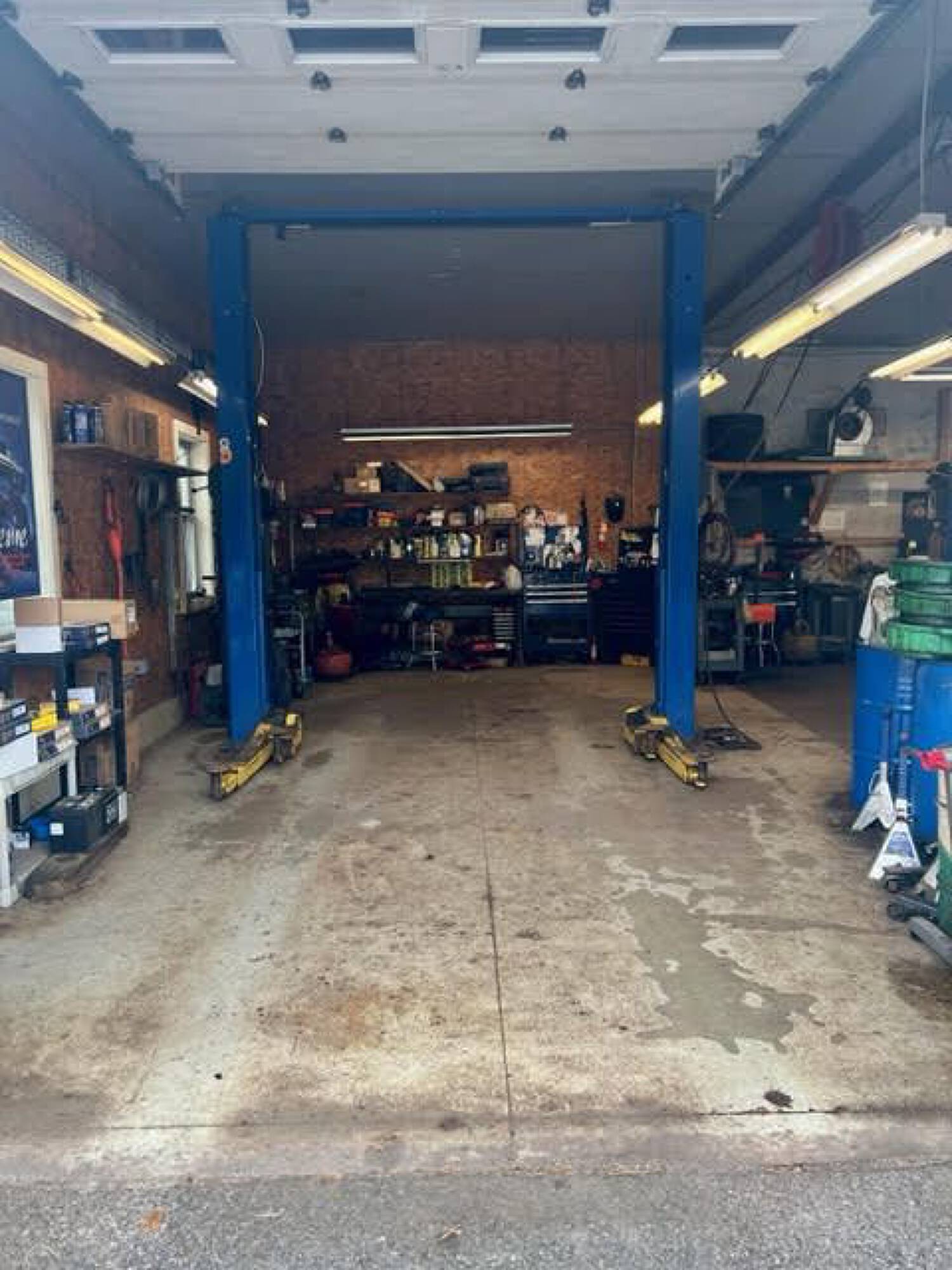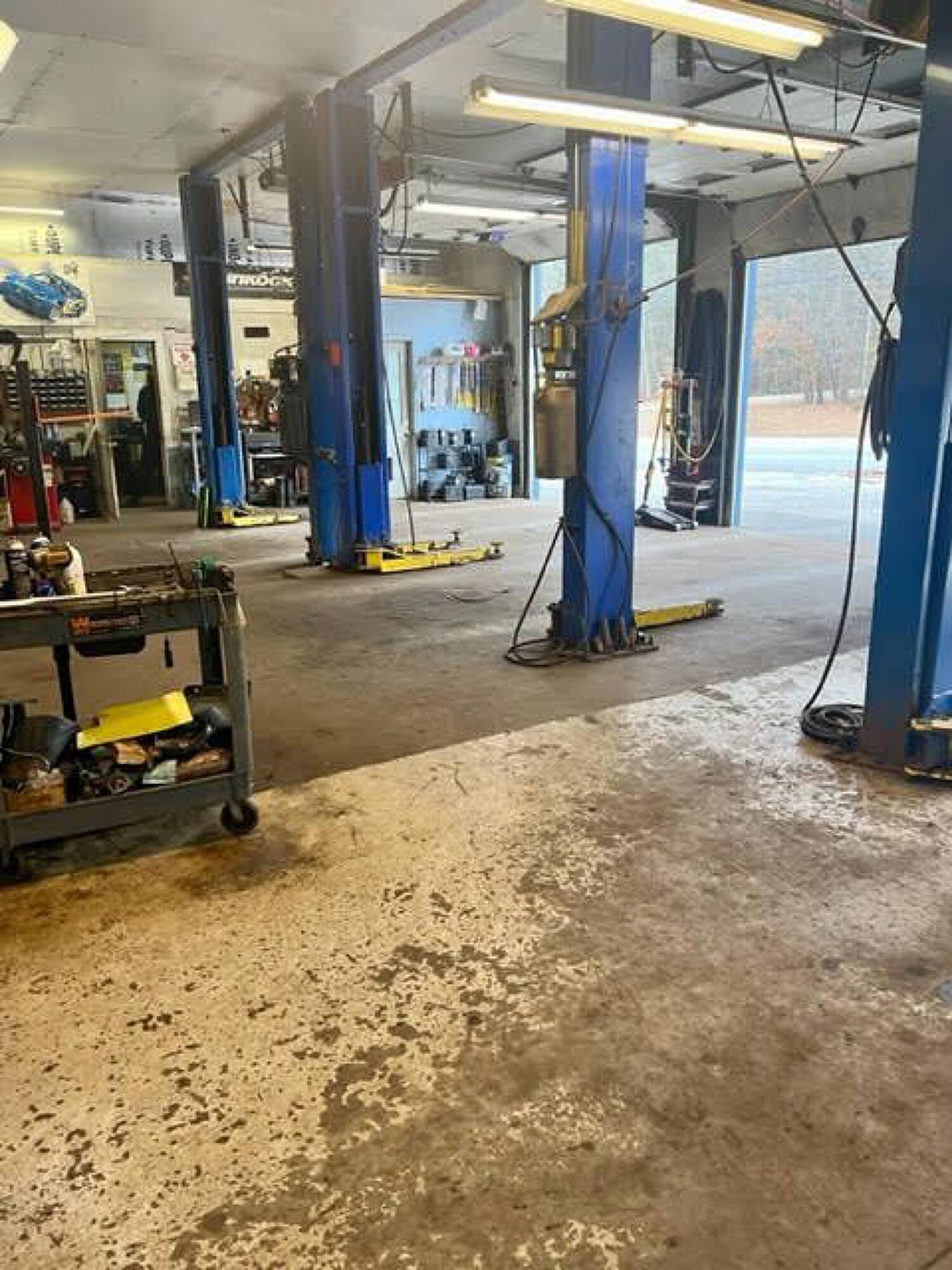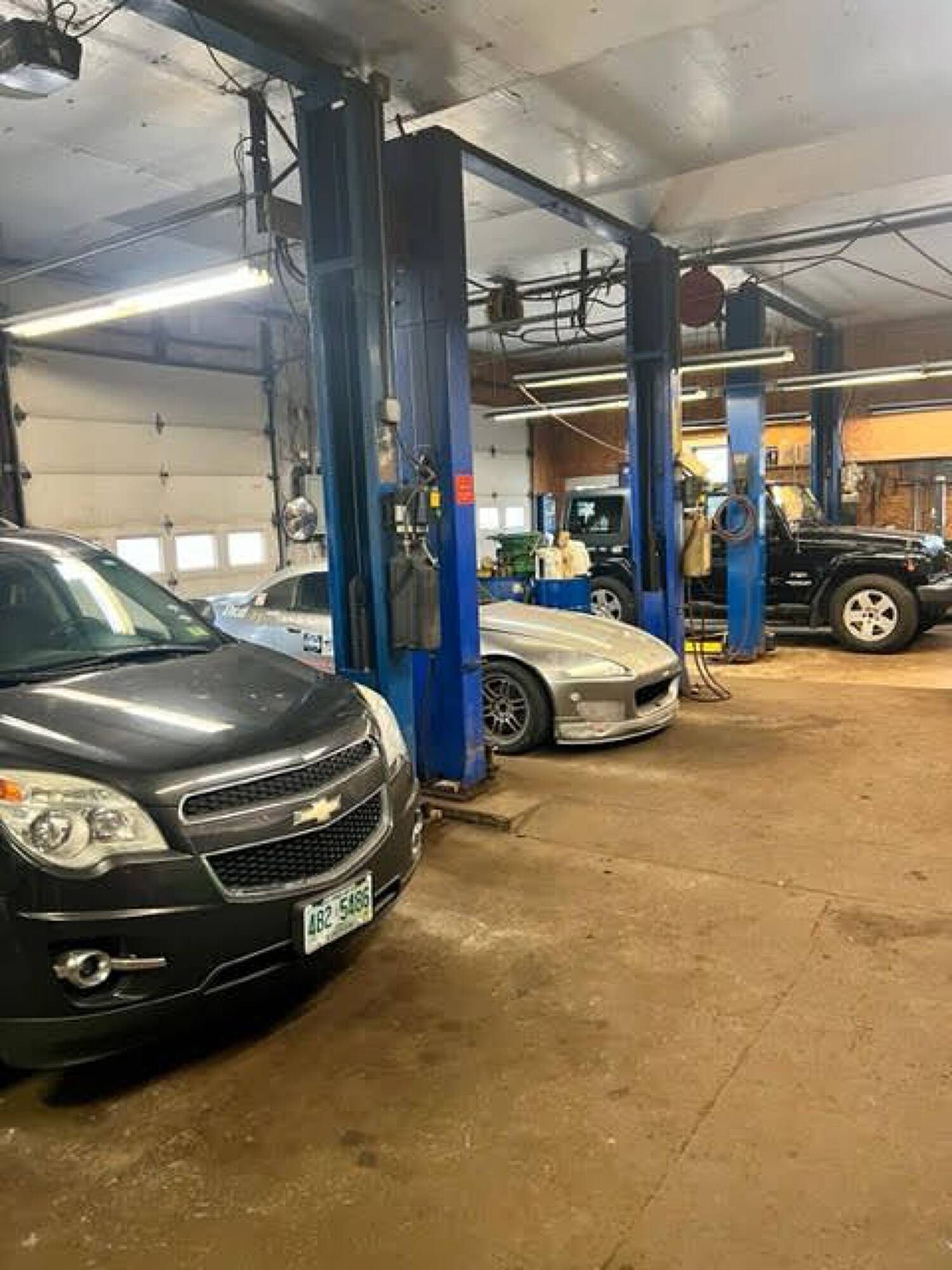 Three-bay auto garage with equipment and high visibility.