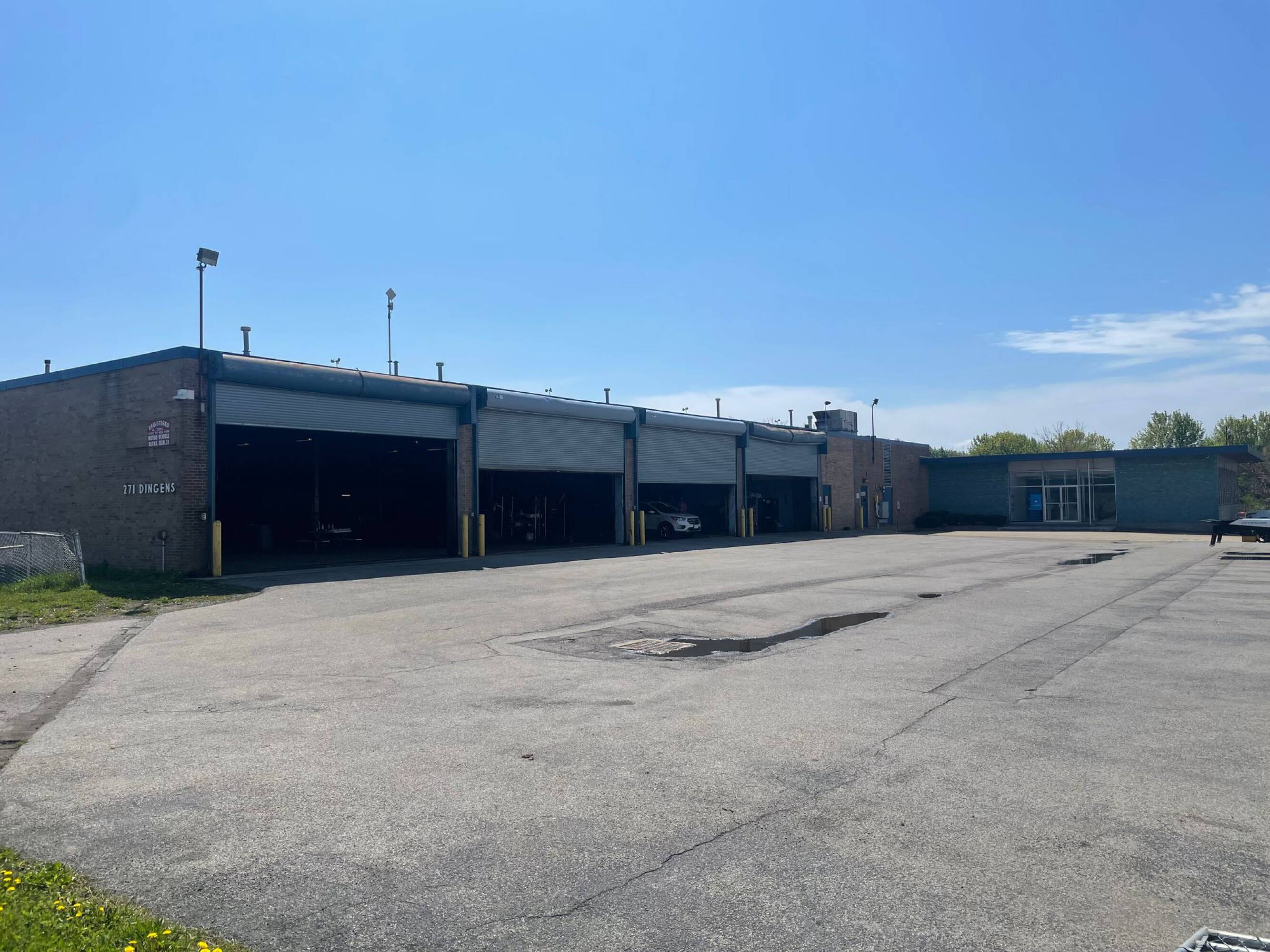 This property at 271 Dingens St, Buffalo, NY, is suitable for use as a truck or vehicle maintenance facility or a warehouse. The 21,516 SF building includes 4,160 SF of newly remodeled office space. The property features six 14" overhead doors, a van-level dock, and a 3.5-acre fenced and paved lot. The warehouse has 16 ft ceilings, radiant heat in the shop area, floor drains, air lines throughout, a parts room, heavy power, and waste oil storage. It is equipped with a wet sprinkler system. The property includes pylon signage with visibility from the Thruway and offers direct access to NYS I-190 and NYS I-90 via Exit 1. The location is on Dingens Street near Ogden.