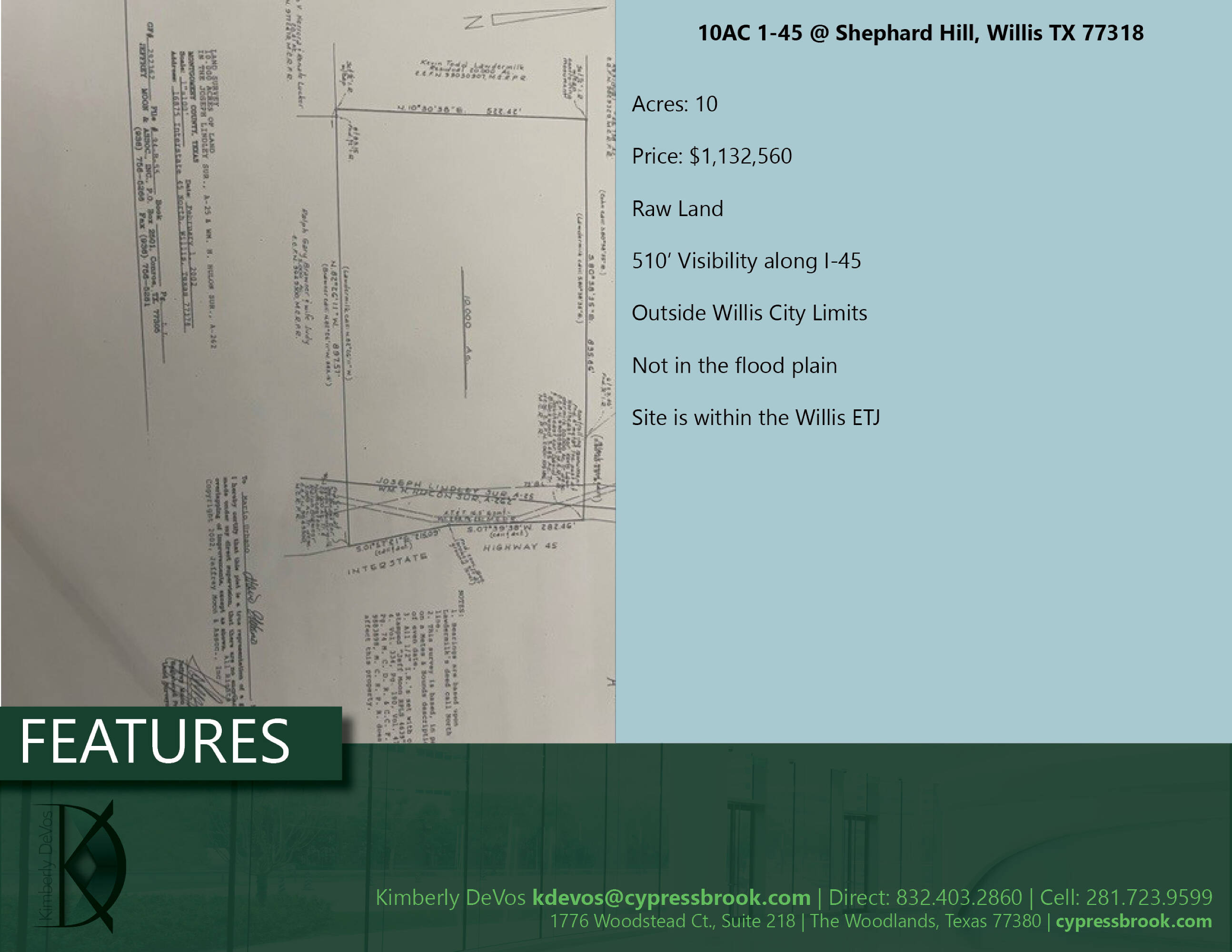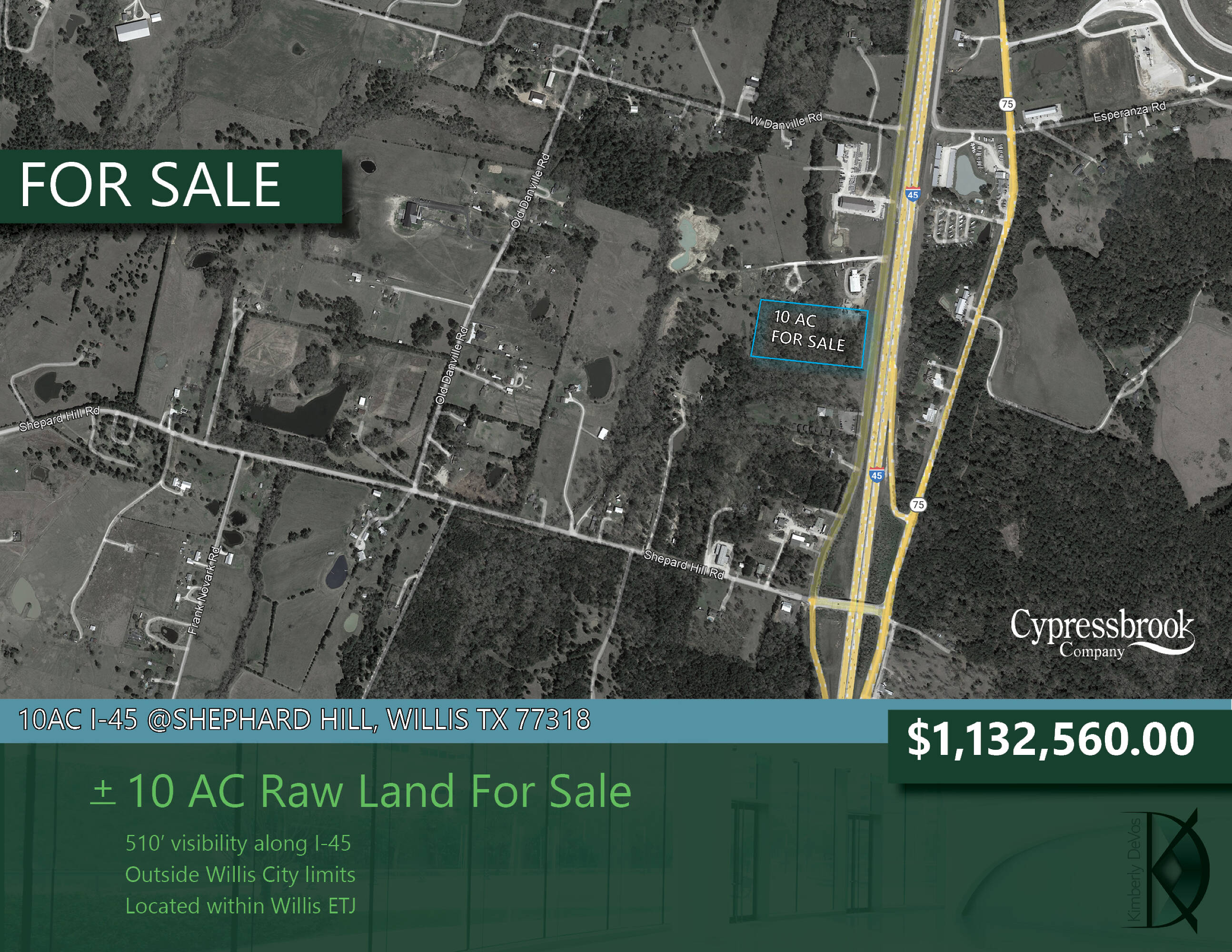 This property features: 10 Acres of Raw Land with **510' Visibility along Interstate 45**; Located at Interstate 45 @ Shephard Hill Rd, Willis TX 77318; Sits inside Willis ETJ