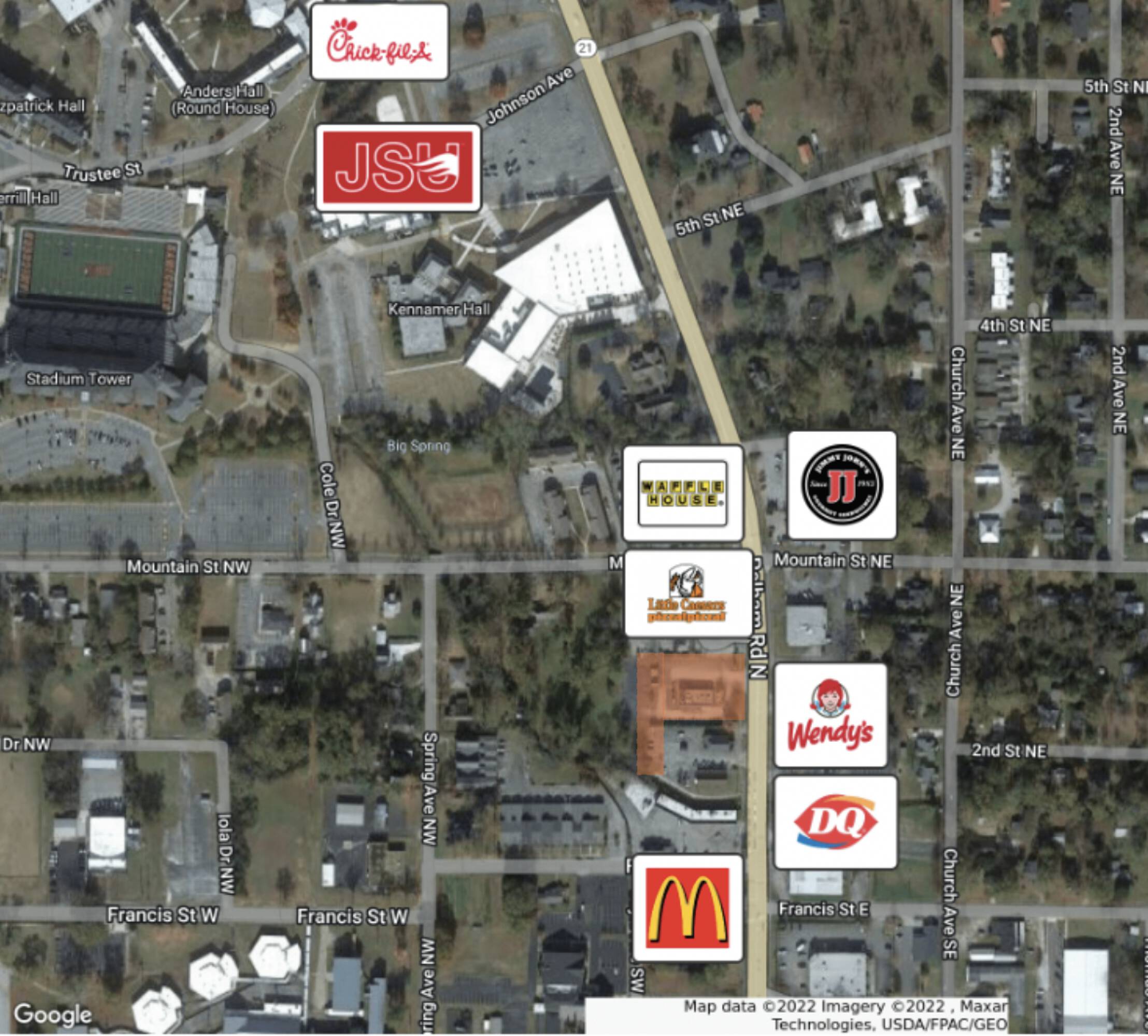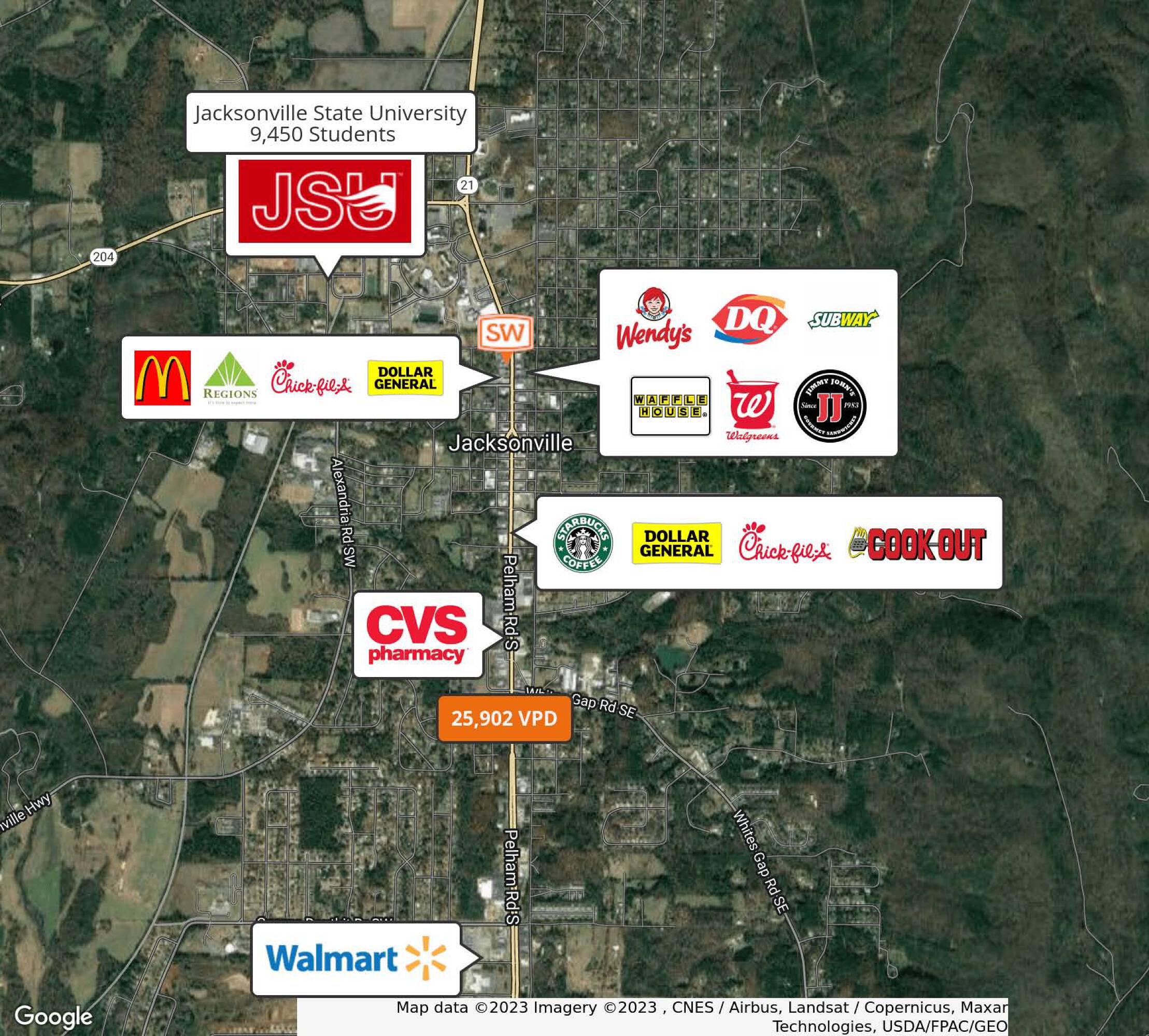 This property features: Drive‑thru for your convenience.; Signage included, increasing visibility.; Less than 1 mile from Jacksonville State University.