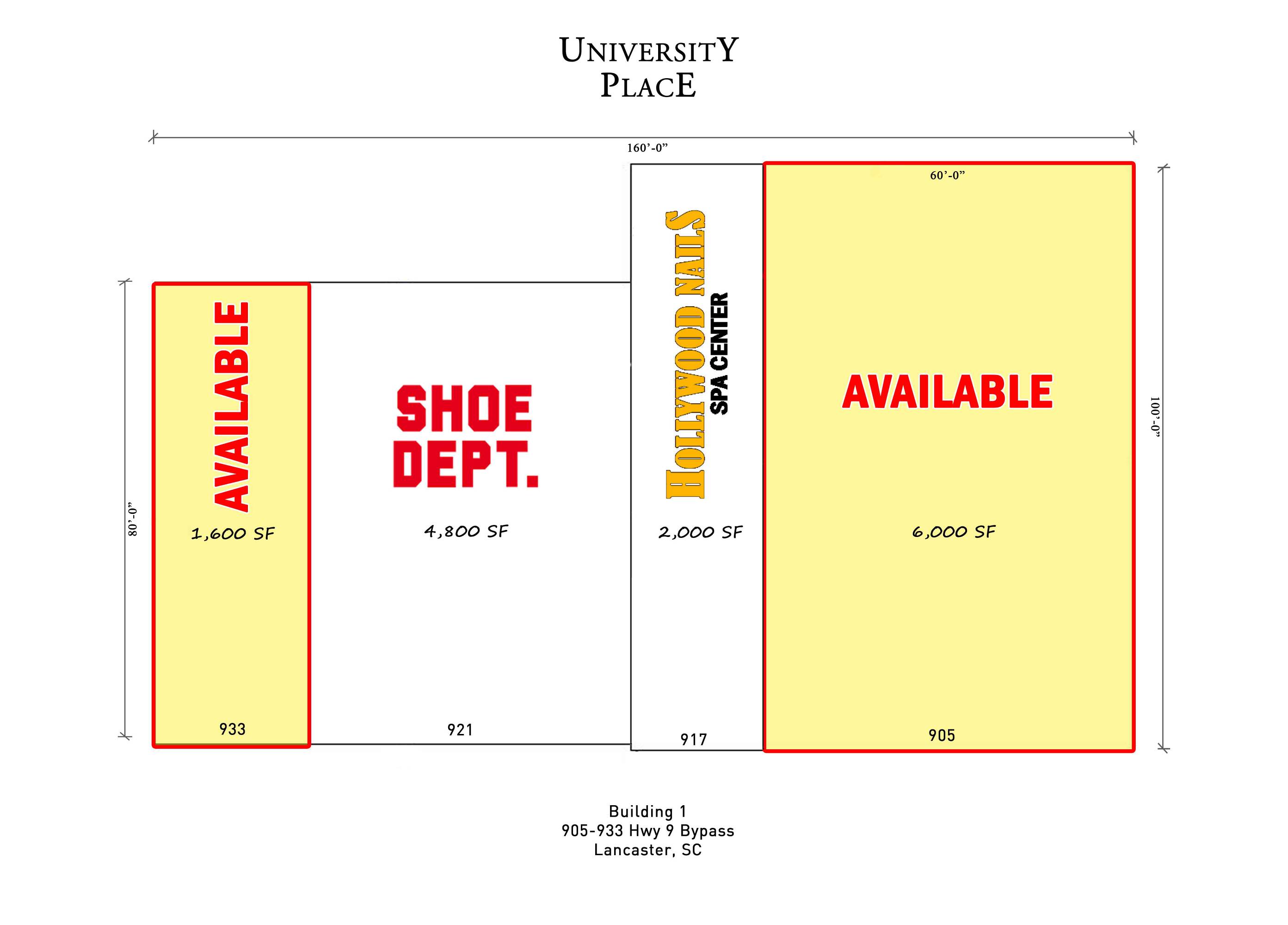 The property is located at 905-933 Hwy 9 Bypass W Lancaster, SC.
