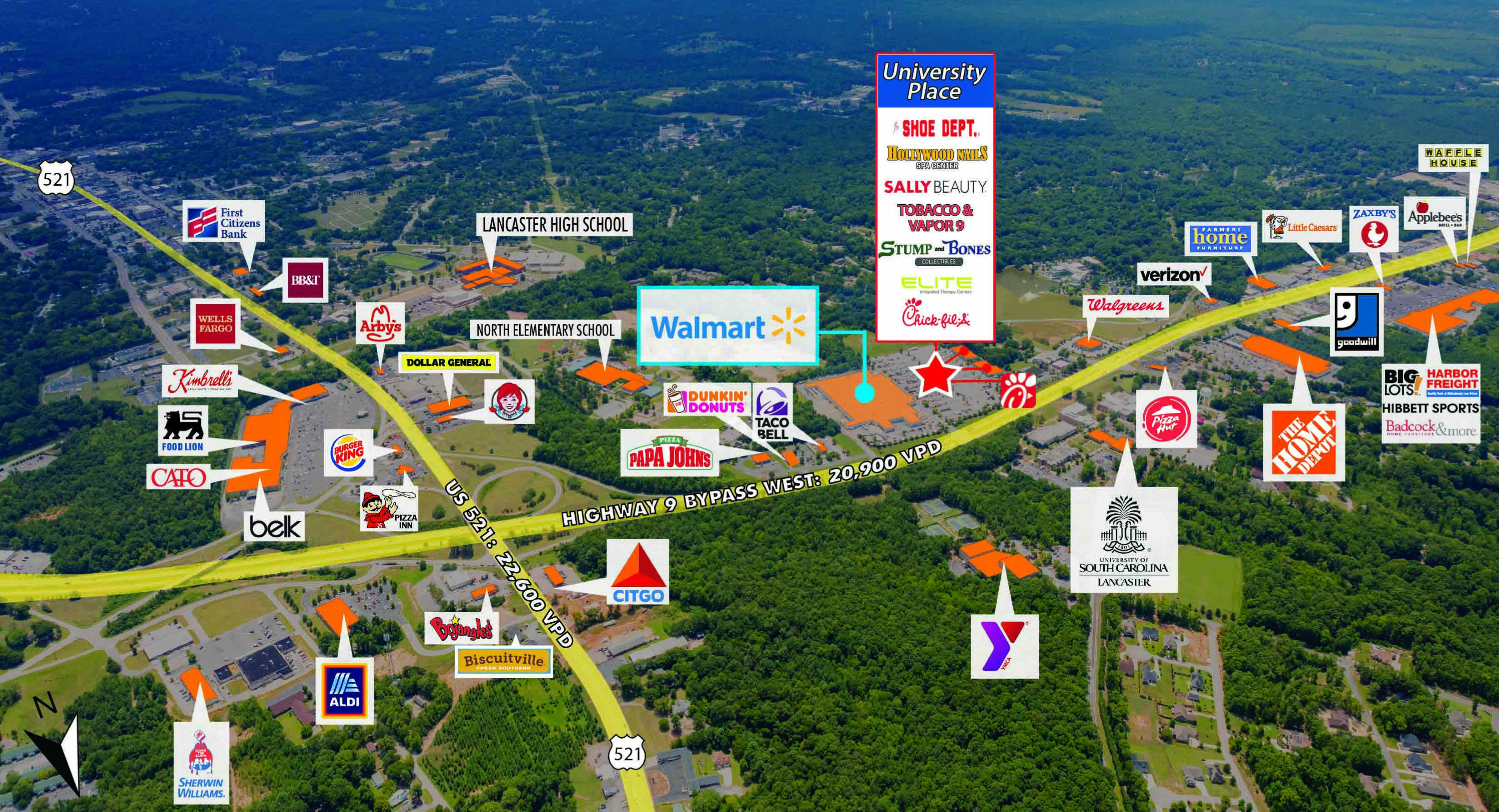 University Place is a community center anchored by Walmart, featuring 27,200 square feet of freestanding retail space. The property is situated directly across the parking lot on Hwy 9 Bypass W, less than 1 mile from Hwy 521 in Lancaster, SC.