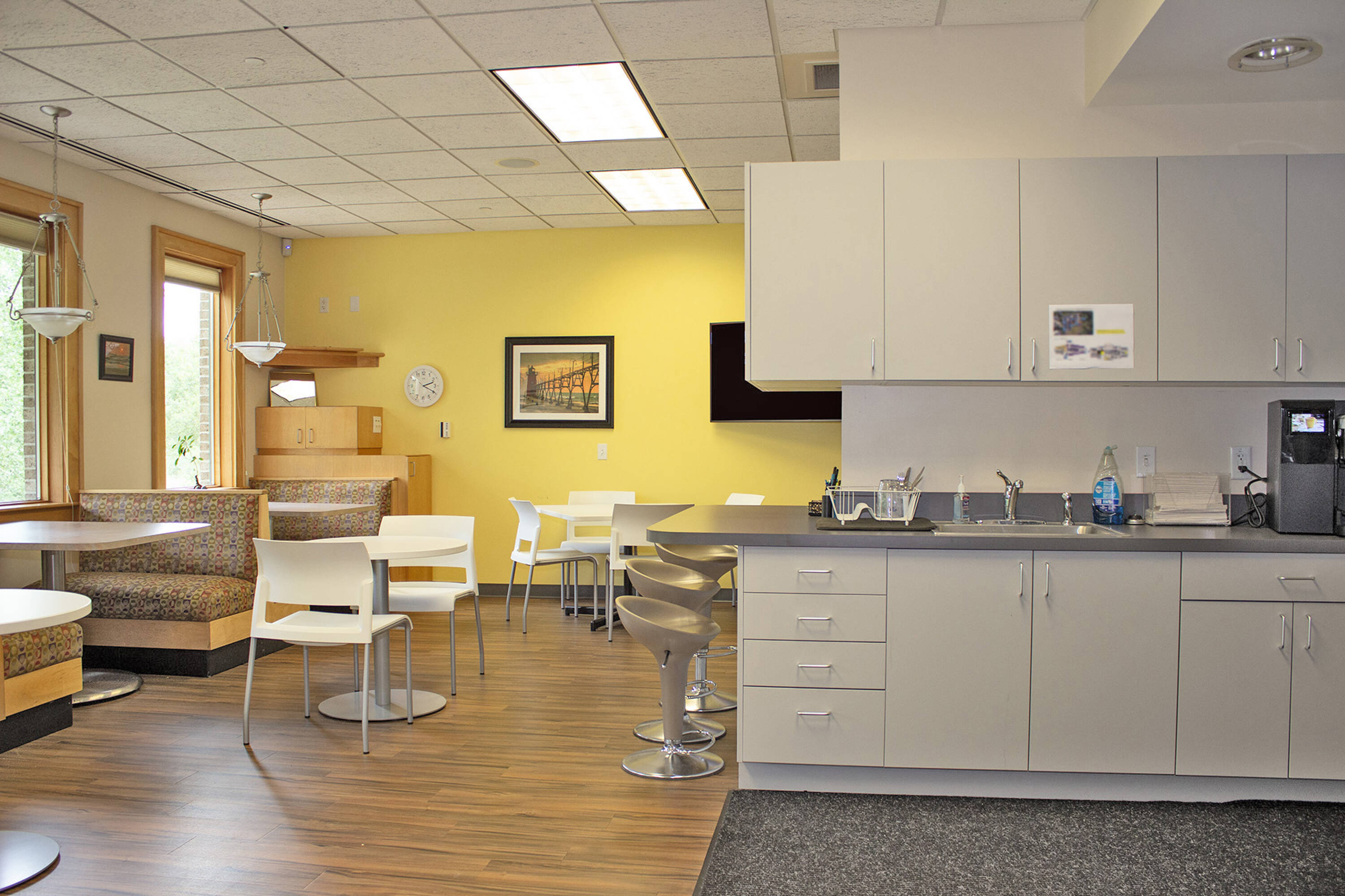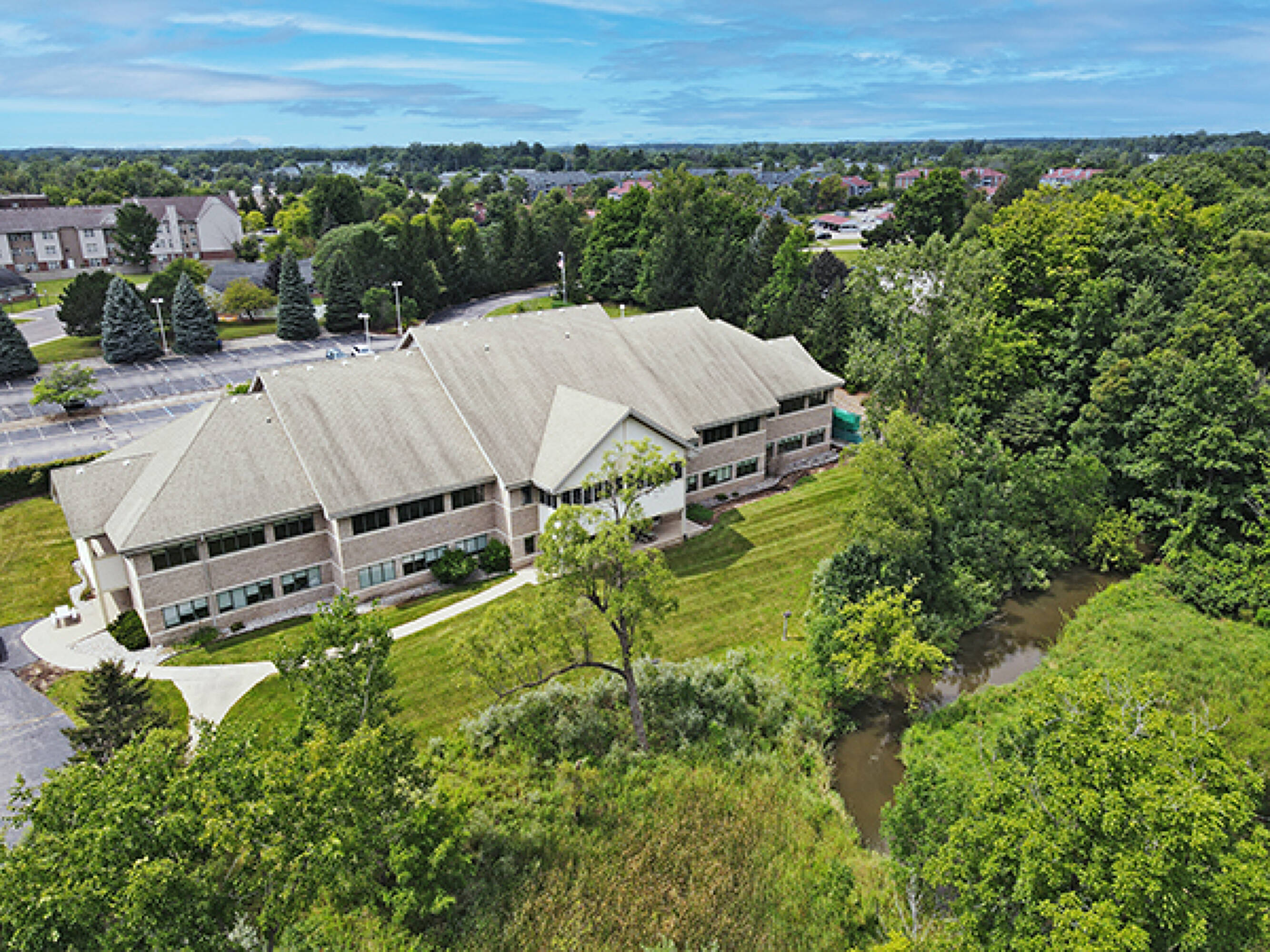 The property features a circular drive leading to a covered main entrance. Covered balconies and patios on three sides of each floor provide views of the creek and surrounding woodlands. The top floor consists of a large reception area, conference room, enclosed offices, workstations, and an open area for cubicles. The lower level includes a cafeteria with patio and workout facility, in addition to a training room, server room, enclosed offices, an open area for cubicles, and restrooms with a shower. Building amenities include a security system with key card access and a 230kW backup generator with the capacity to power the entire building. Situated off Saginaw Highway, the property is near the I-96 interchange and in close proximity to numerous restaurants, shopping options, and hotels. The property is suitable for corporate office headquarters. The building has a total size of 29768 square feet.