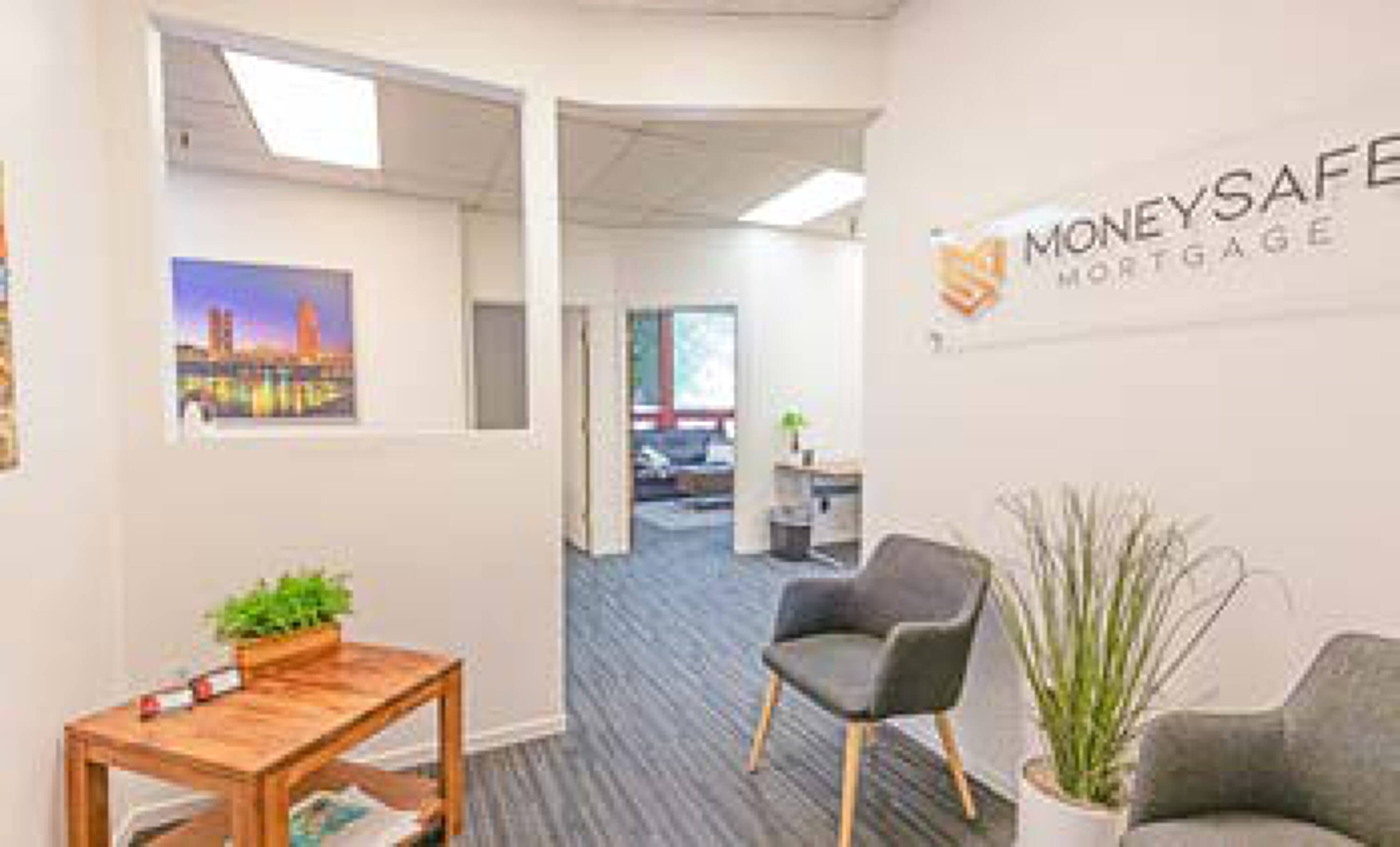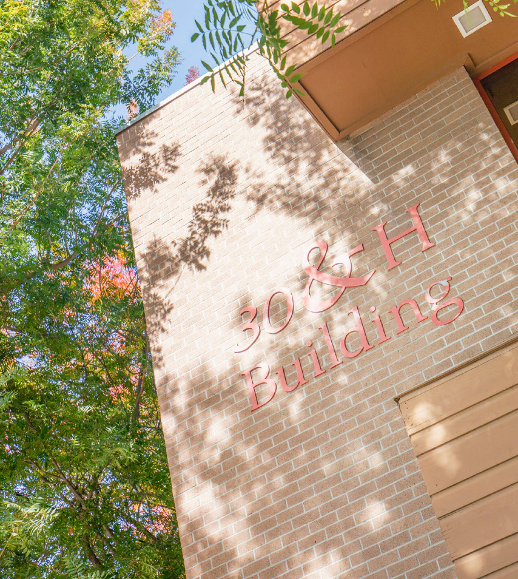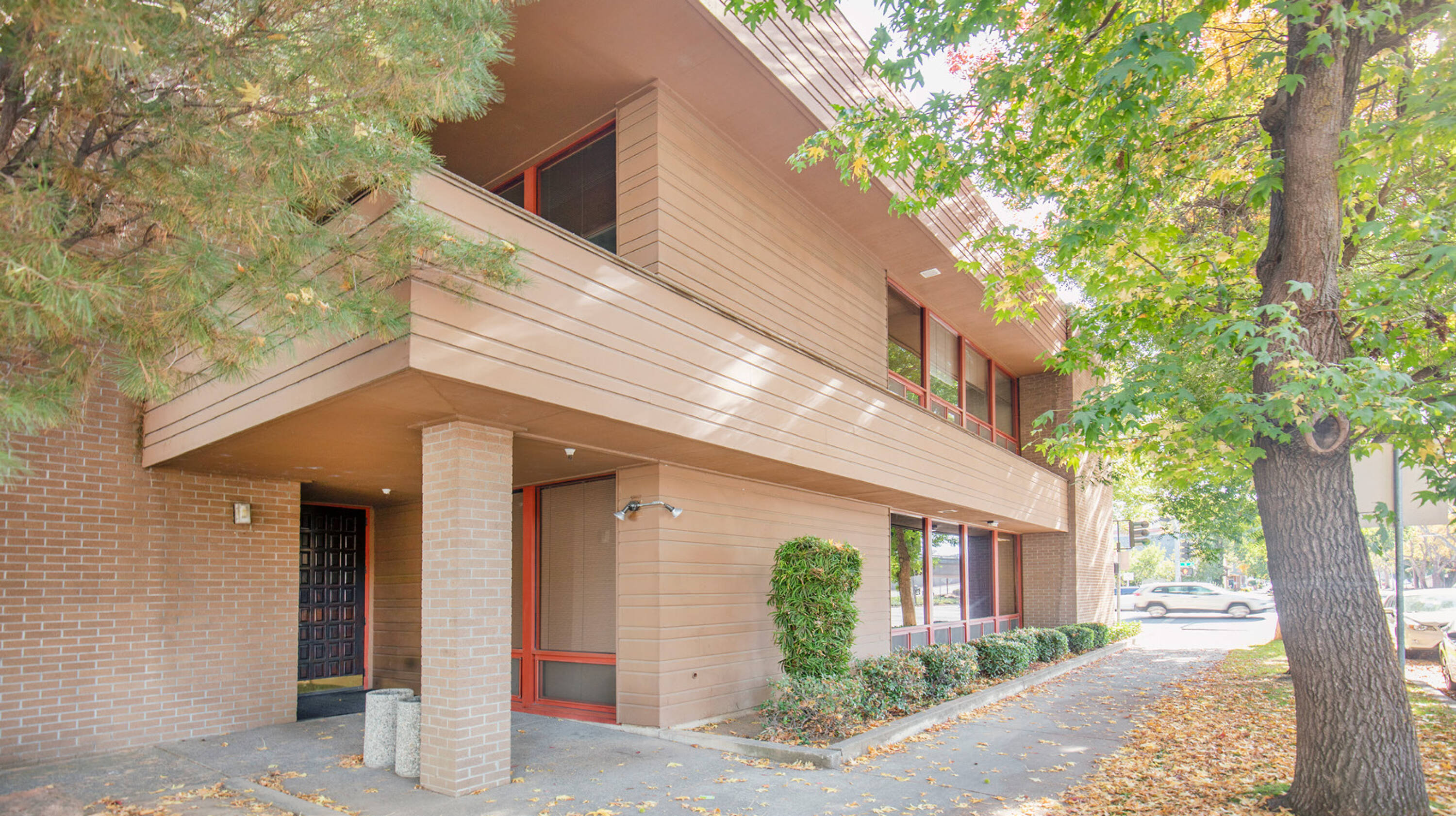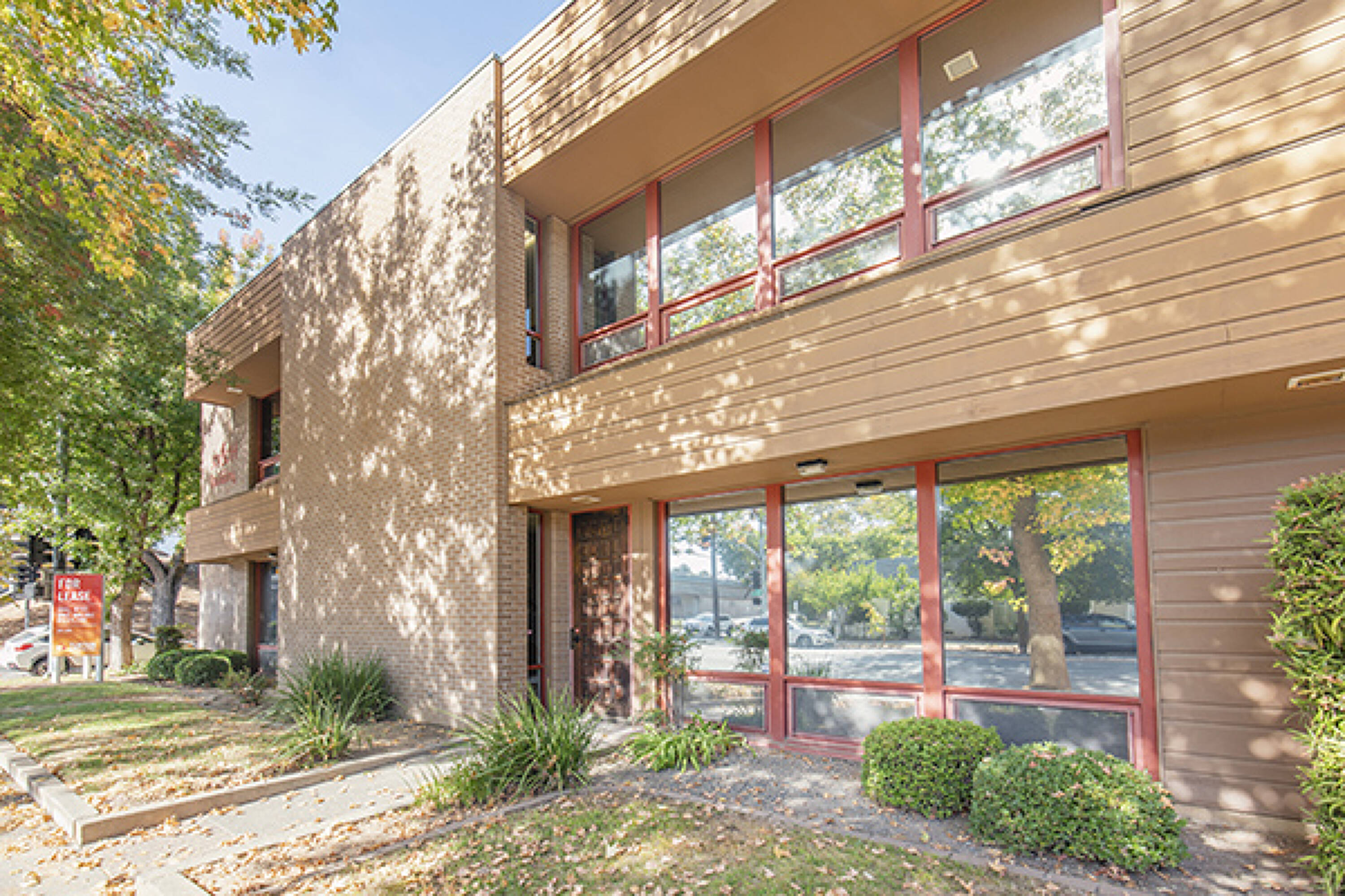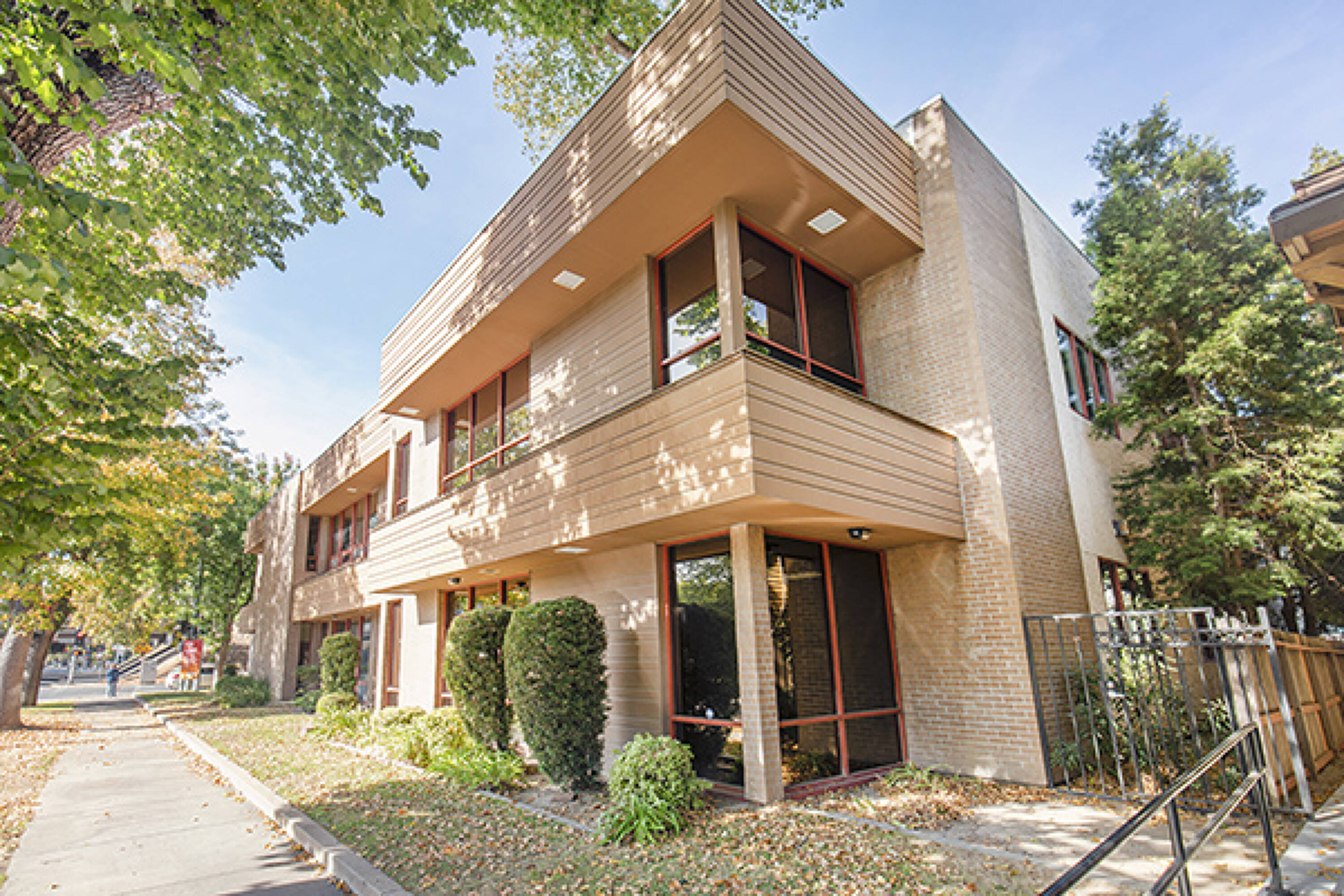 Two-story office building with contemporary architecture and mature landscaping.