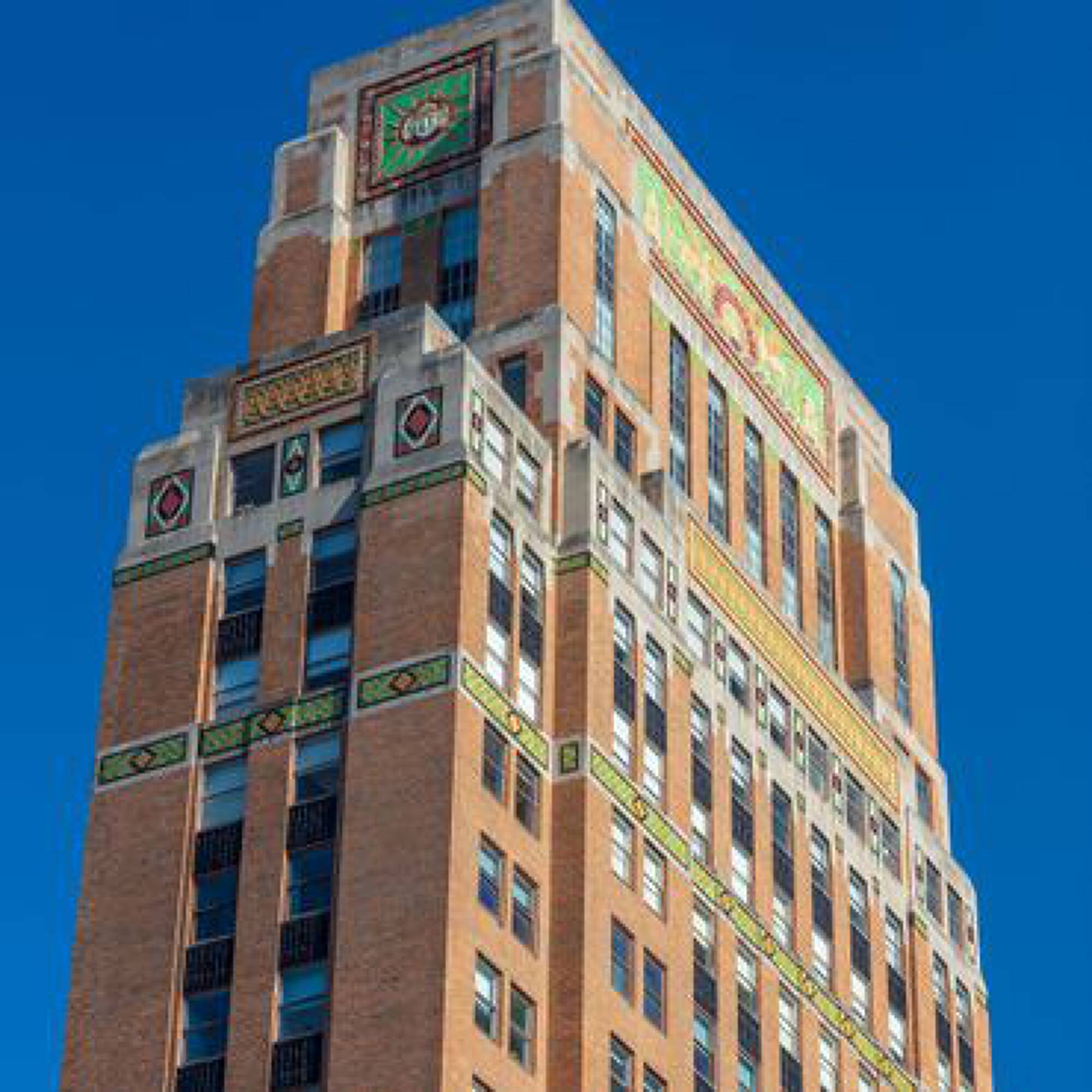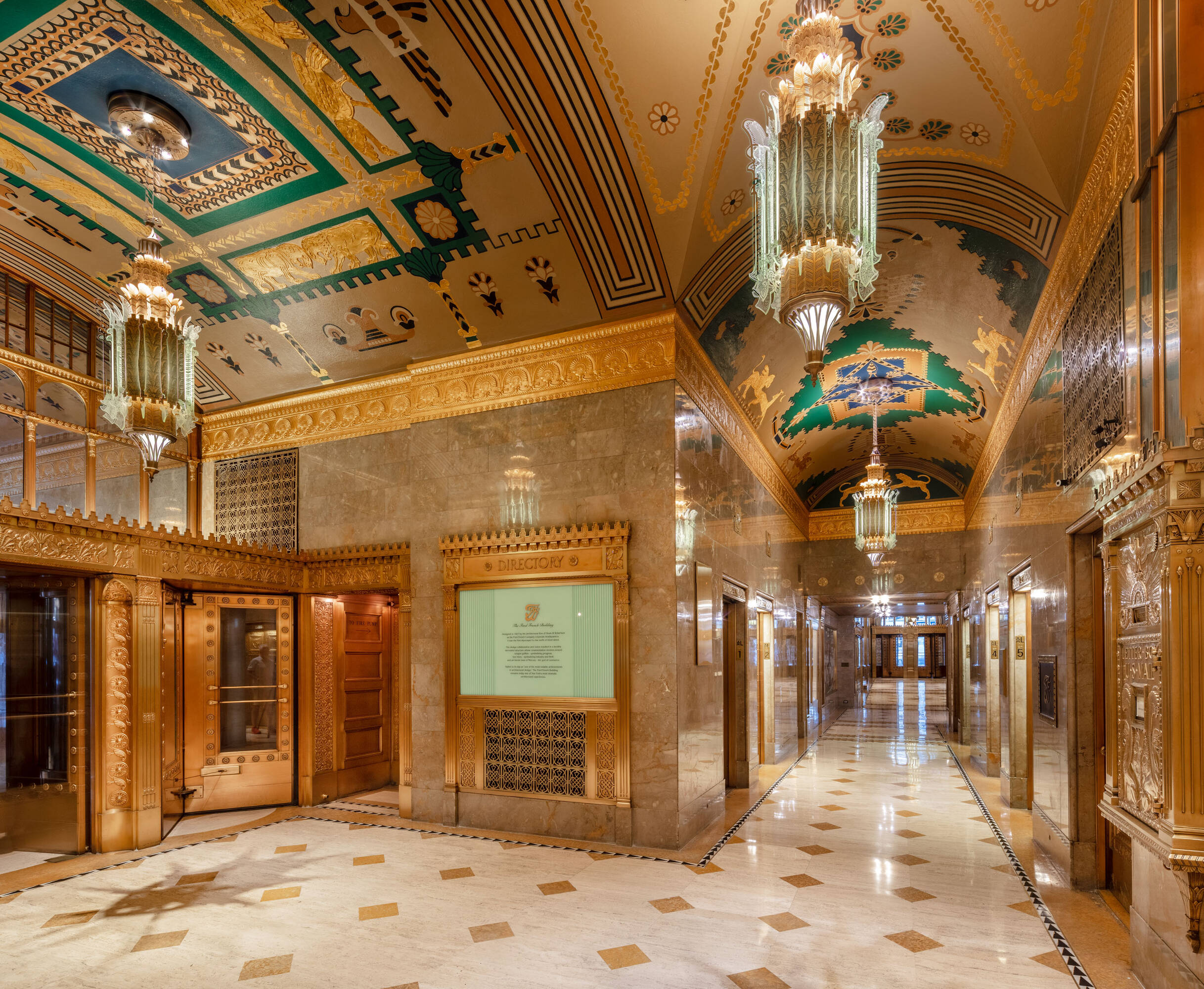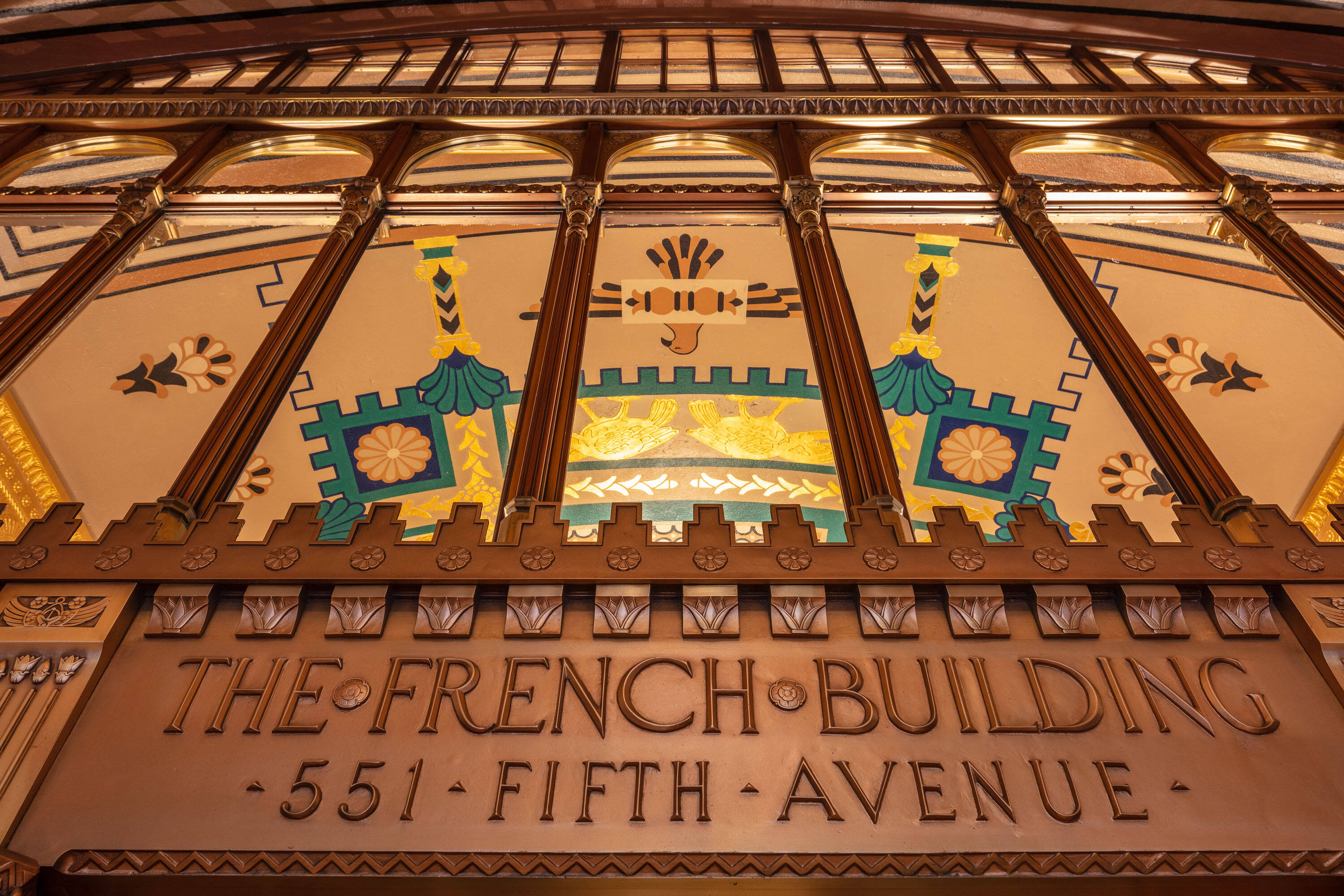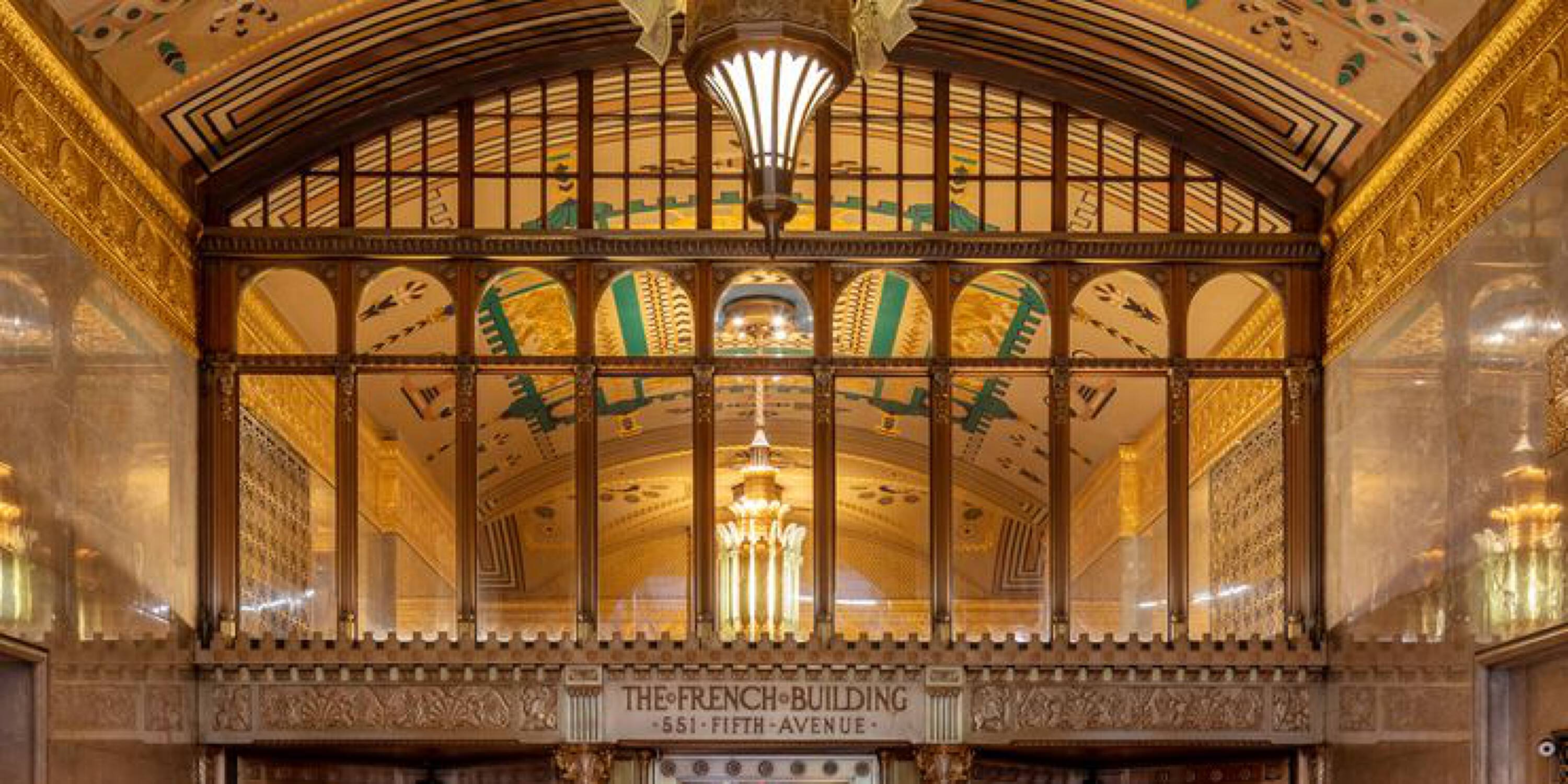 Located at 551 Fifth Avenue at 45th Street in New York City, the Fred F. French Building is an art deco structure designed in 1927 by H. Douglas Ives. The 38-story building is near major businesses, hotels, restaurants, retail stores, public transportation, and Grand Central Terminal, and offers views of Midtown Manhattan. The building served as the headquarters for Fred Fillmore French, who also developed Tudor City and Knickerbocker Village. The building's design incorporates art deco, ancient Babylonian, and European styles. The lobby, designated an interior landmark, features Roman travertine floors, St. Genevieve marble walls, cast bronze elevator doors, and patterned glass chandeliers. The exterior has a vertical facade of limestone and brick rising from a three-story limestone base, with orange brickwork, terracotta decor with black trim, themed rectangular patterns, bronze paneling, and bronze framed storefronts. The Fred F. French Building has been restored and upgraded with equipment, mechanicals, and elevator systems and is home to global corporations, Denihan Hospitality Group, and Morton’s Steakhouse.