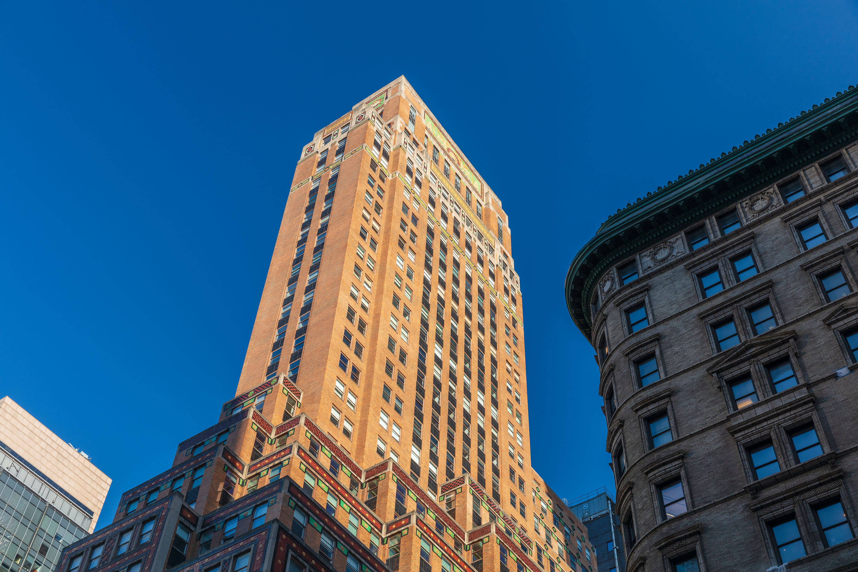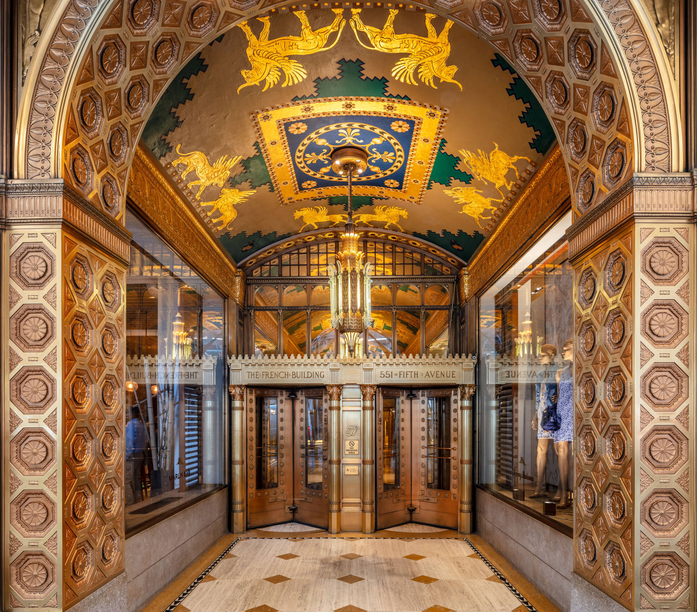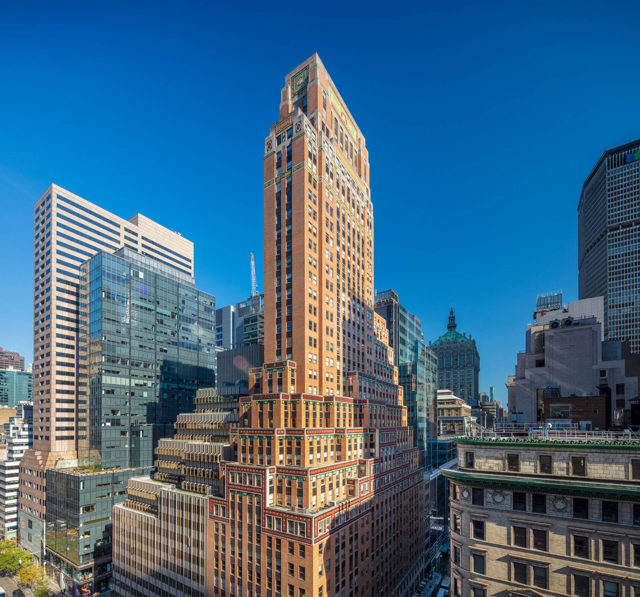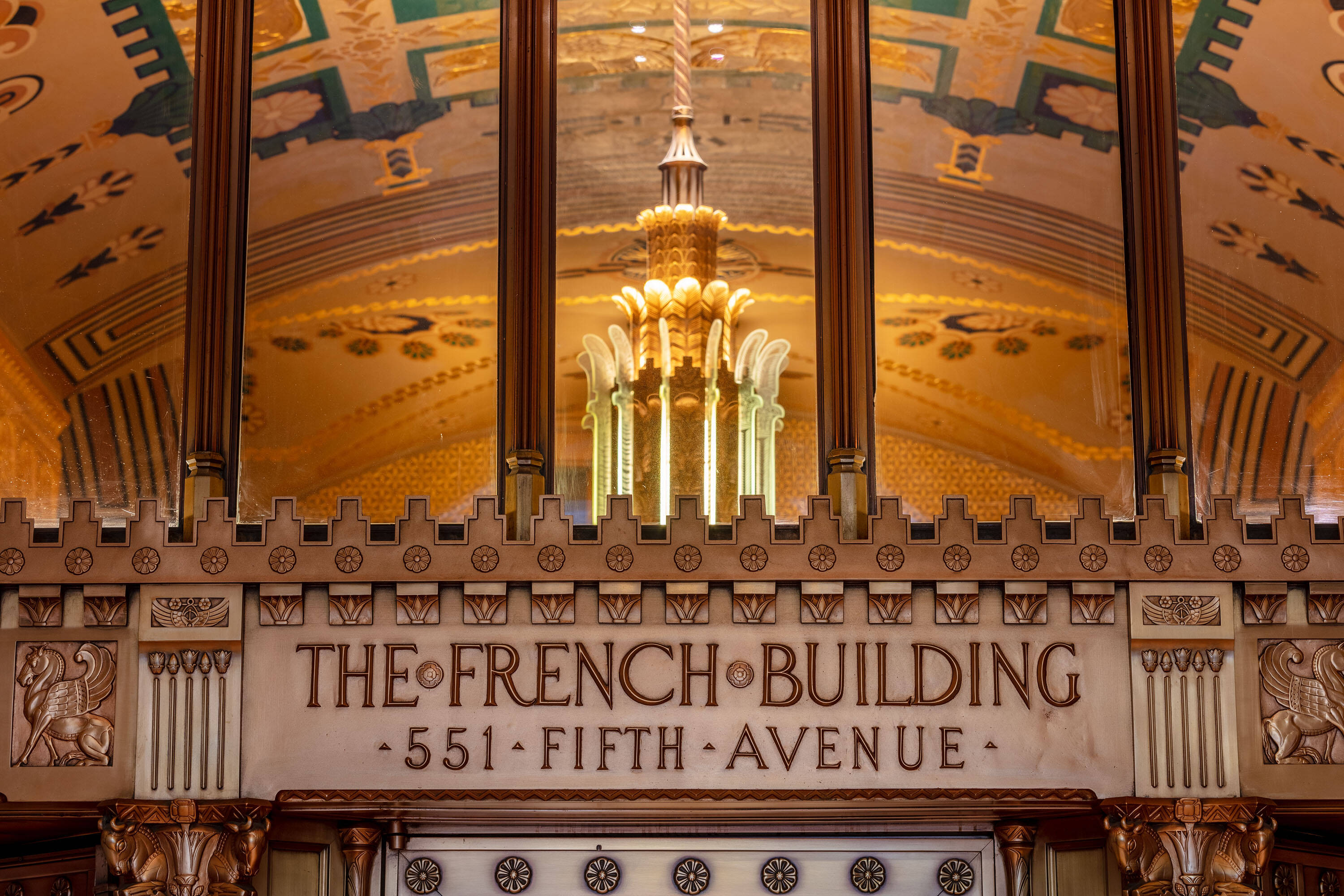 Located at 551 Fifth Avenue at 45th Street in New York City, the Fred F. French Building is an art deco structure designed in 1927 by H. Douglas Ives. The 38-story building is near major businesses, hotels, restaurants, retail stores, public transportation, and Grand Central Terminal, and offers views of Midtown Manhattan. The building served as the headquarters for Fred Fillmore French, who also developed Tudor City and Knickerbocker Village. The building's design incorporates art deco, ancient Babylonian, and European styles. The lobby, designated an interior landmark, features Roman travertine floors, St. Genevieve marble walls, cast bronze elevator doors, and patterned glass chandeliers. The exterior has a vertical facade of limestone and brick rising from a three-story limestone base, with orange brickwork, terracotta decor with black trim, themed rectangular patterns, bronze paneling, and bronze framed storefronts. The Fred F. French Building has been restored and upgraded with equipment, mechanicals, and elevator systems and is home to global corporations, Denihan Hospitality Group, and Morton’s Steakhouse.