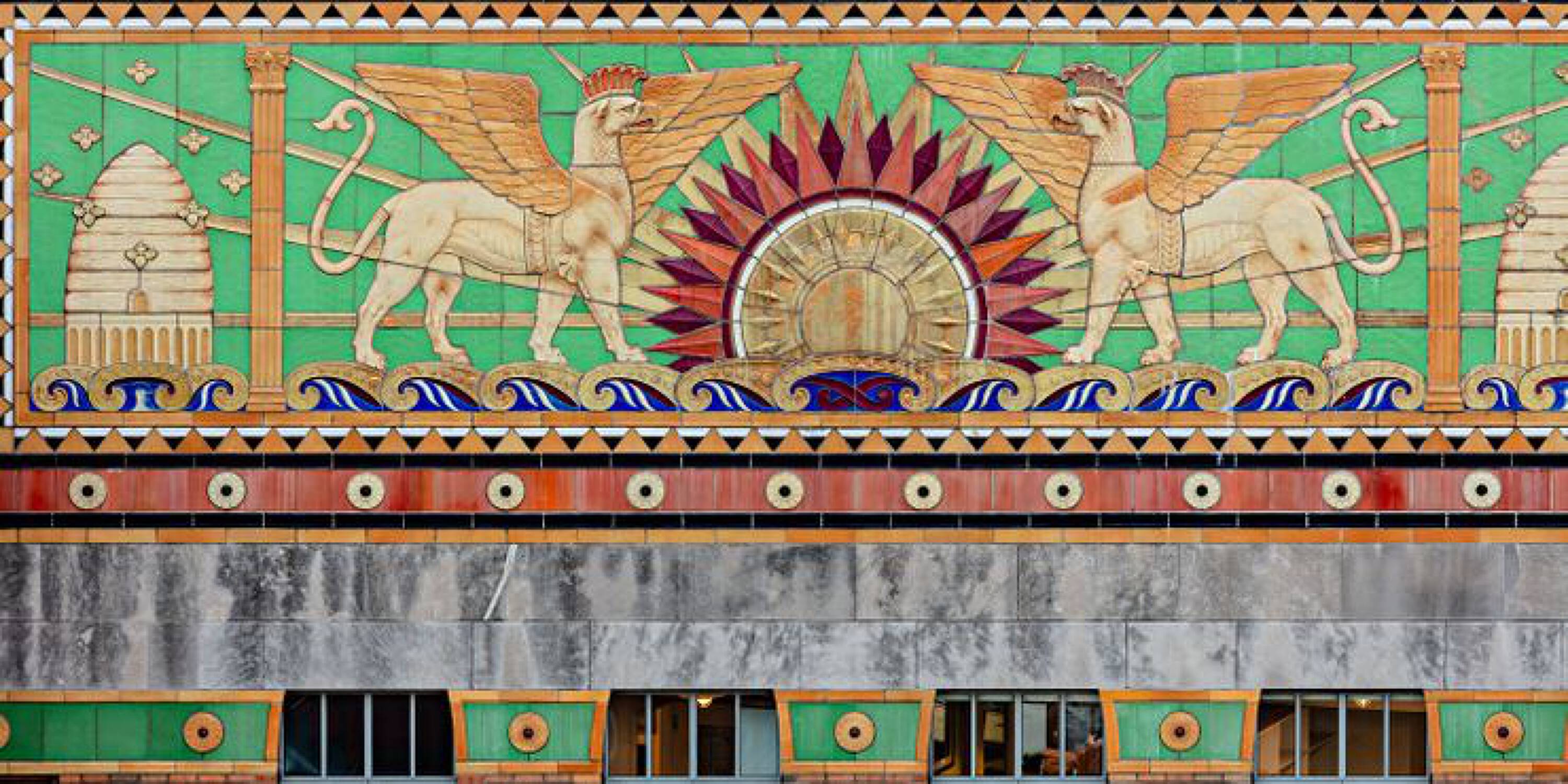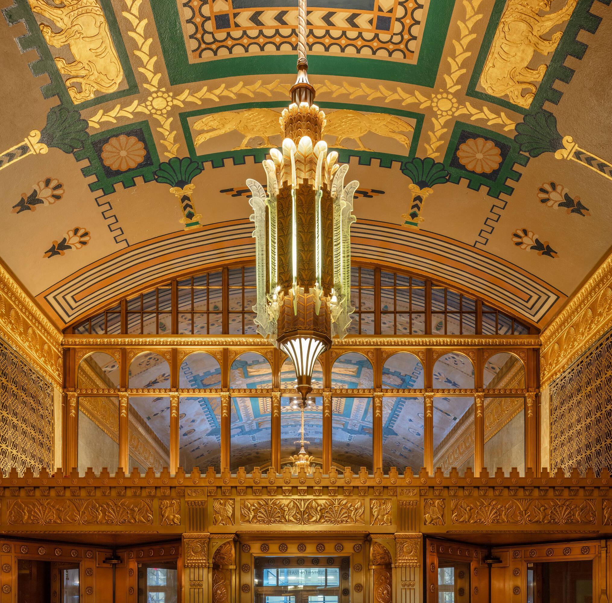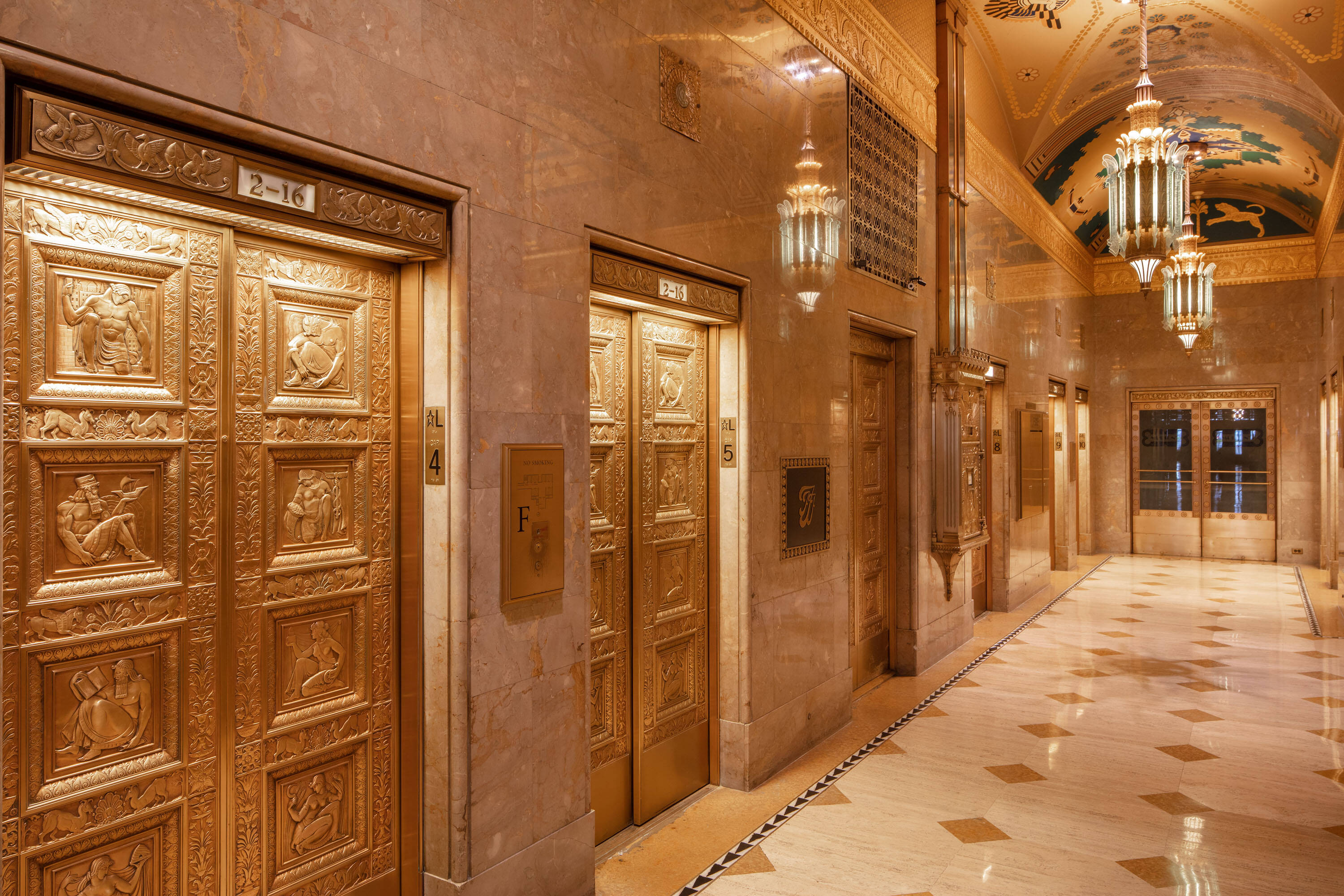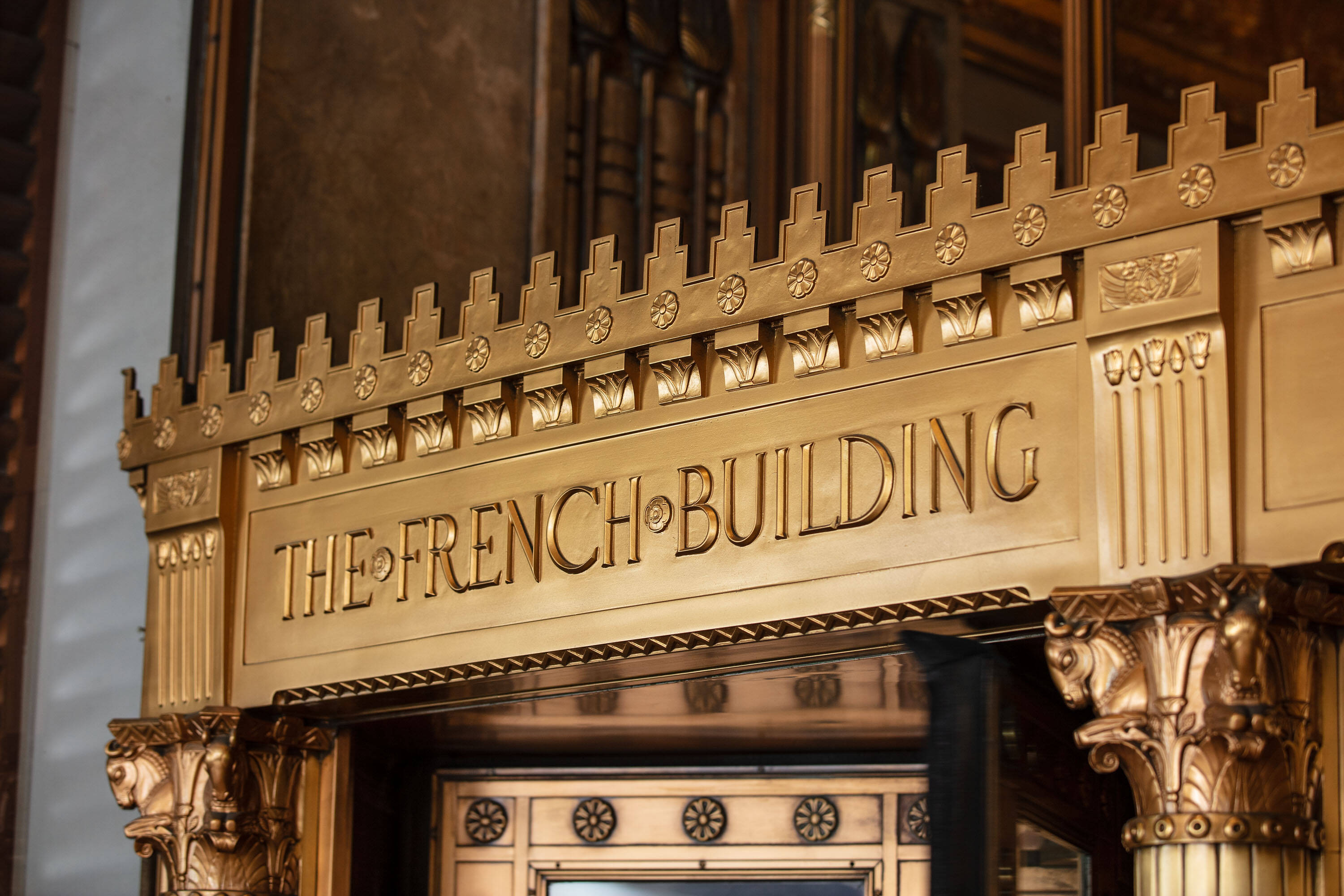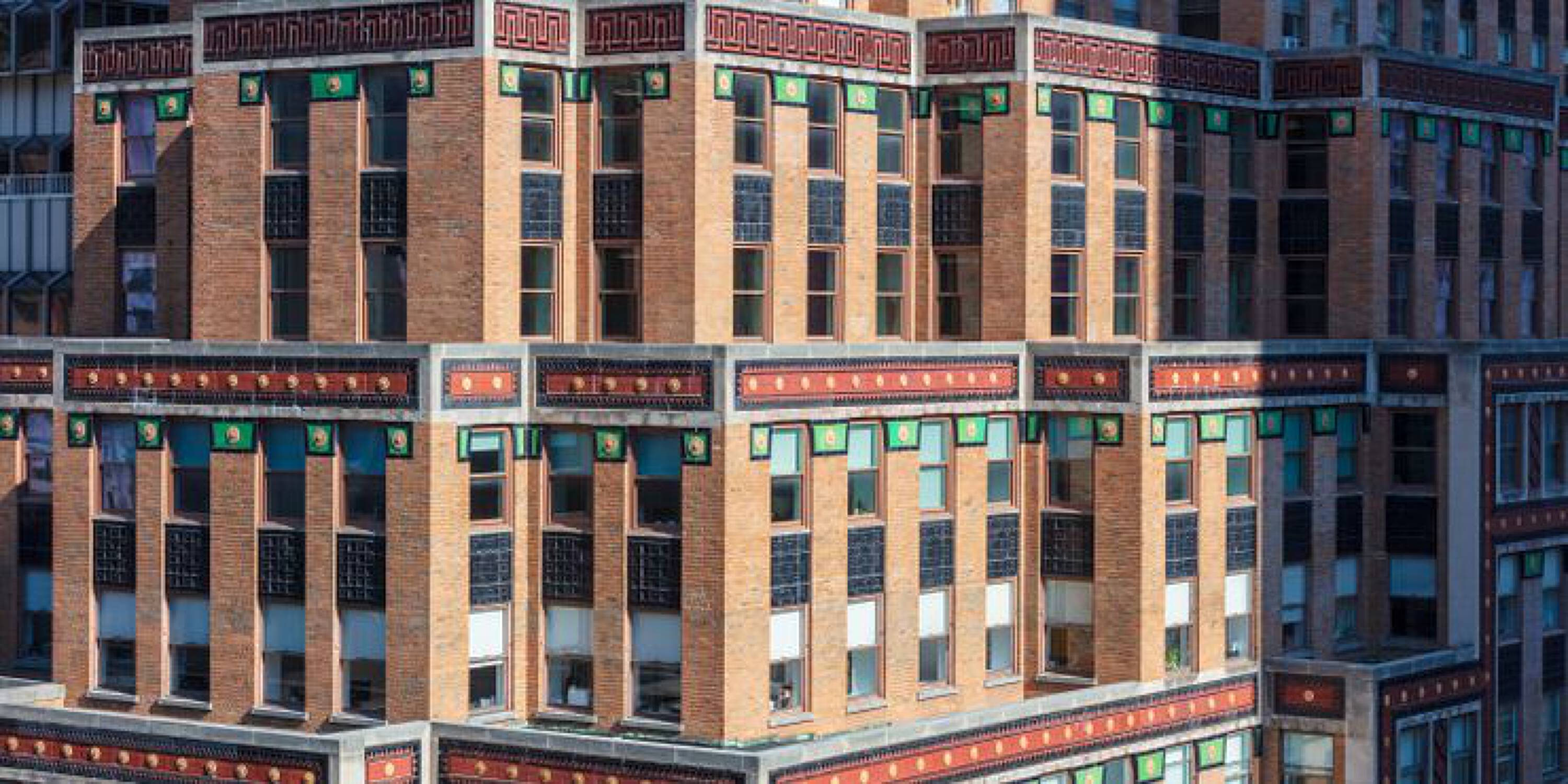 Located at 551 Fifth Avenue at 45th Street in New York City, the Fred F. French Building is an art deco structure designed in 1927 by H. Douglas Ives. The 38-story building is near major businesses, hotels, restaurants, retail stores, public transportation, and Grand Central Terminal, and offers views of Midtown Manhattan. The building served as the headquarters for Fred Fillmore French, who also developed Tudor City and Knickerbocker Village. The building's design incorporates art deco, ancient Babylonian, and European styles. The lobby, designated an interior landmark, features Roman travertine floors, St. Genevieve marble walls, cast bronze elevator doors, and patterned glass chandeliers. The exterior has a vertical facade of limestone and brick rising from a three-story limestone base, with orange brickwork, terracotta decor with black trim, themed rectangular patterns, bronze paneling, and bronze framed storefronts. The Fred F. French Building has been restored and upgraded with equipment, mechanicals, and elevator systems and is home to global corporations, Denihan Hospitality Group, and Morton’s Steakhouse.