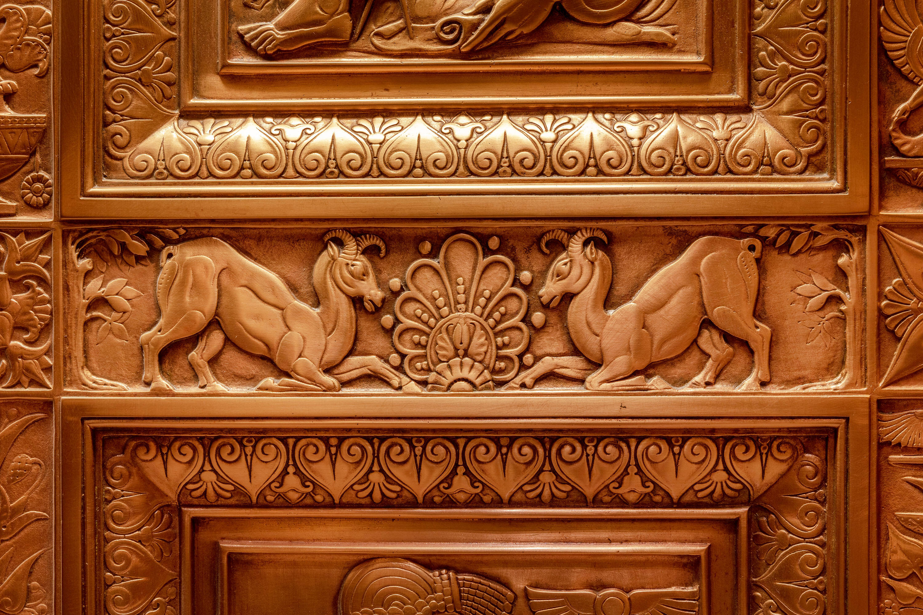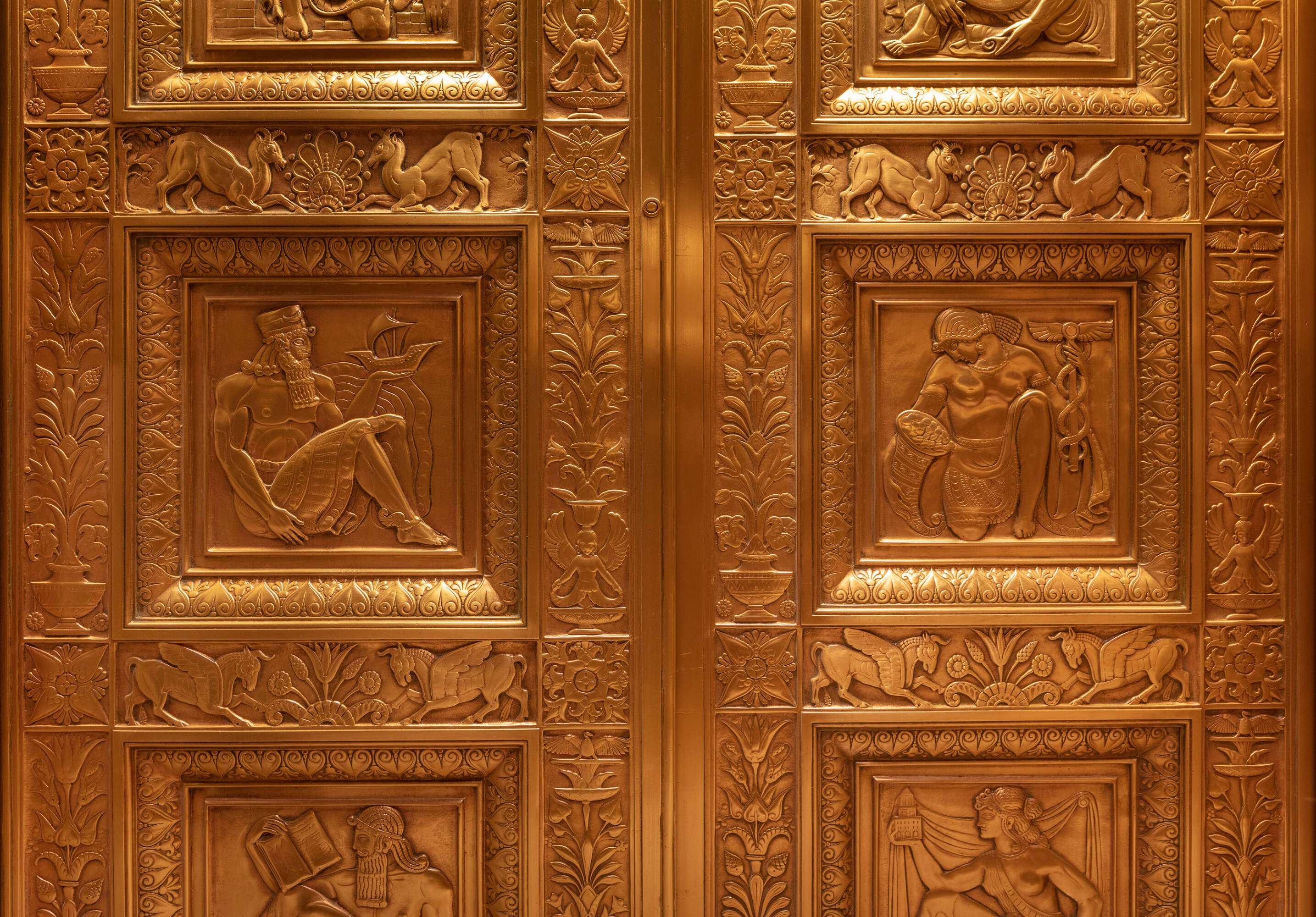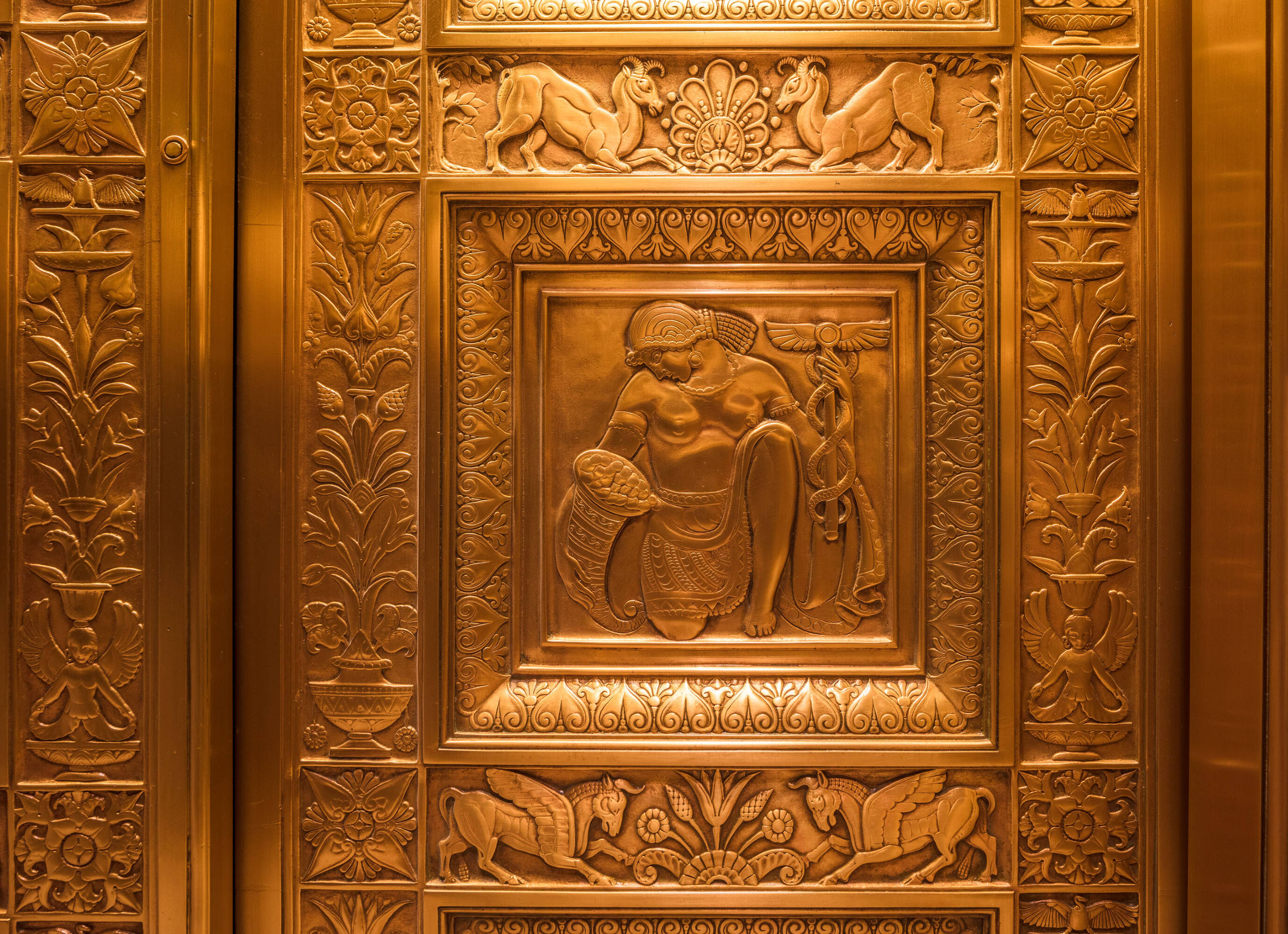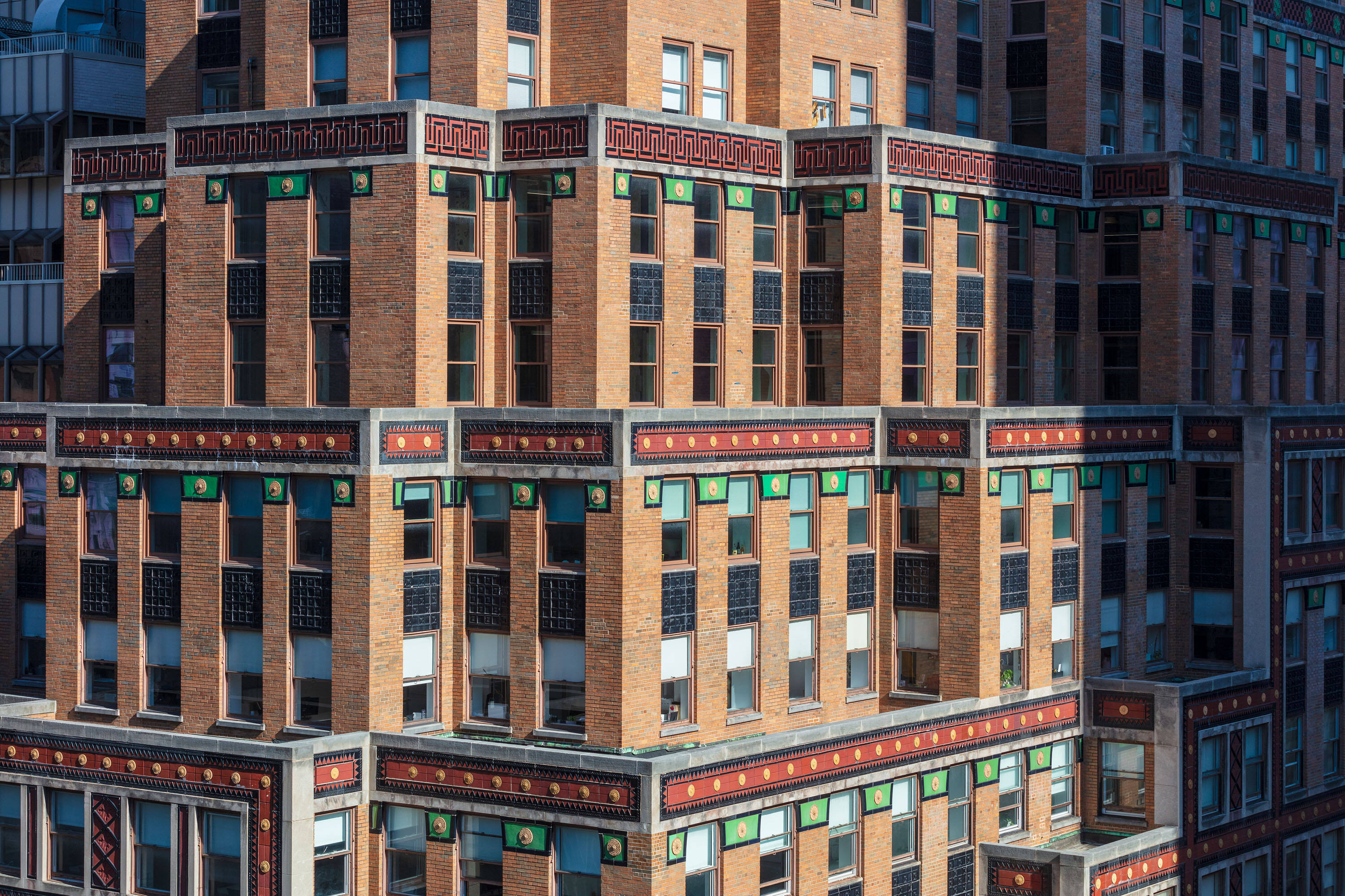 Located at 551 Fifth Avenue at 45th Street in New York City, the Fred F. French Building is an art deco structure designed in 1927 by H. Douglas Ives. The 38-story building is near major businesses, hotels, restaurants, retail stores, public transportation, and Grand Central Terminal, and offers views of Midtown Manhattan. The building served as the headquarters for Fred Fillmore French, who also developed Tudor City and Knickerbocker Village. The building's design incorporates art deco, ancient Babylonian, and European styles. The lobby, designated an interior landmark, features Roman travertine floors, St. Genevieve marble walls, cast bronze elevator doors, and patterned glass chandeliers. The exterior has a vertical facade of limestone and brick rising from a three-story limestone base, with orange brickwork, terracotta decor with black trim, themed rectangular patterns, bronze paneling, and bronze framed storefronts. The Fred F. French Building has been restored and upgraded with equipment, mechanicals, and elevator systems and is home to global corporations, Denihan Hospitality Group, and Morton’s Steakhouse.
