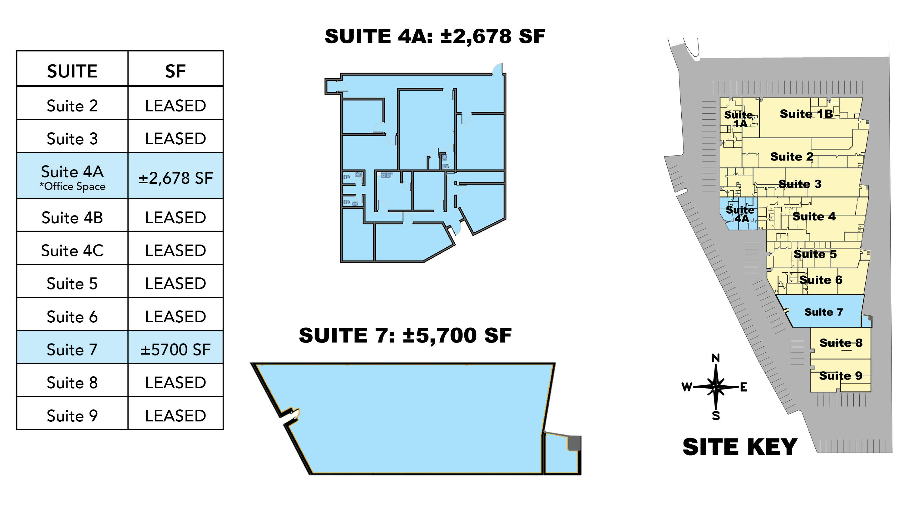 Office and warehouse spaces available for lease.