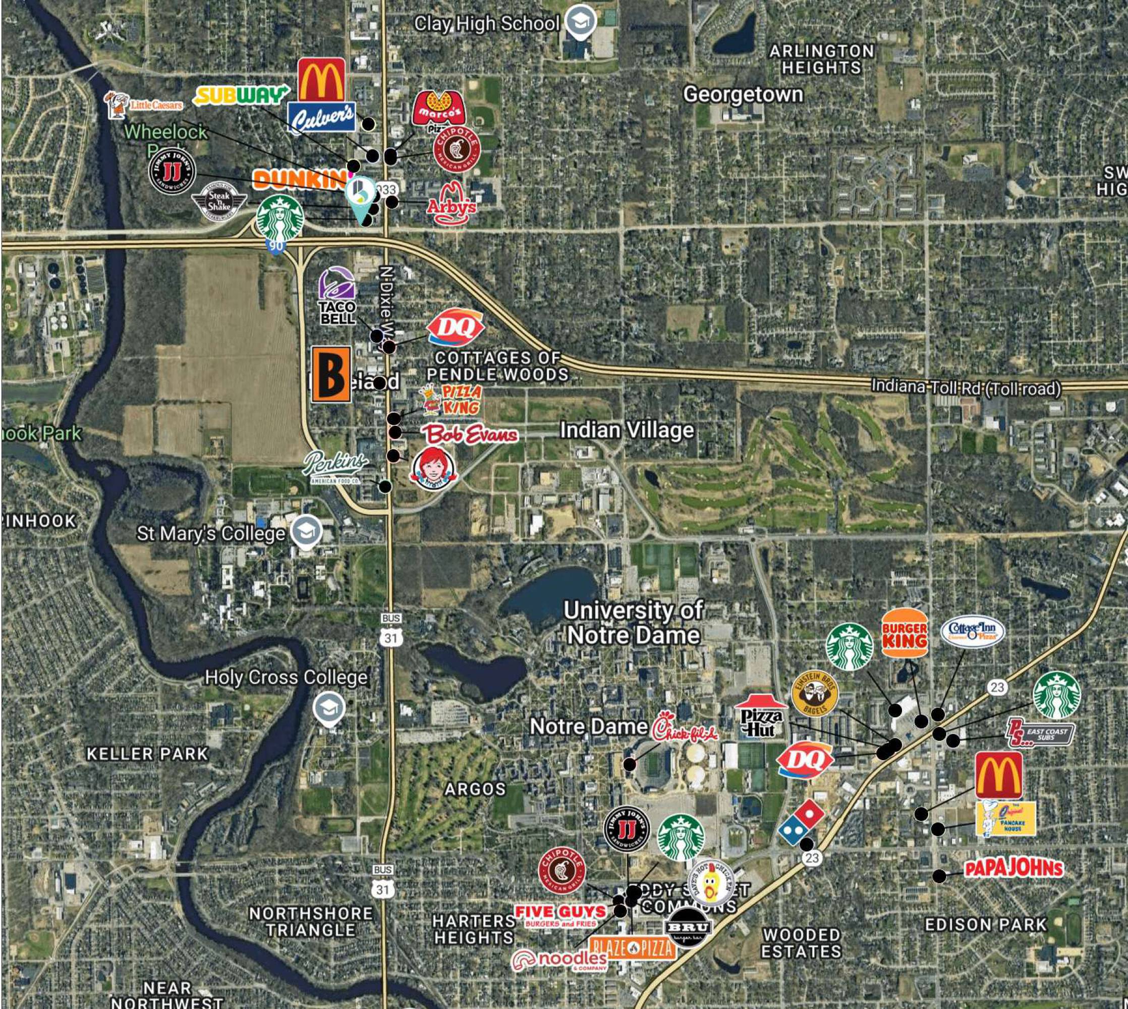 This property features: High‑visibility location on SR 933, a major thoroughfare.; Minutes from the University of Notre Dame and student housing.; Proximity to Exit 77 of the Indiana Toll Road.
