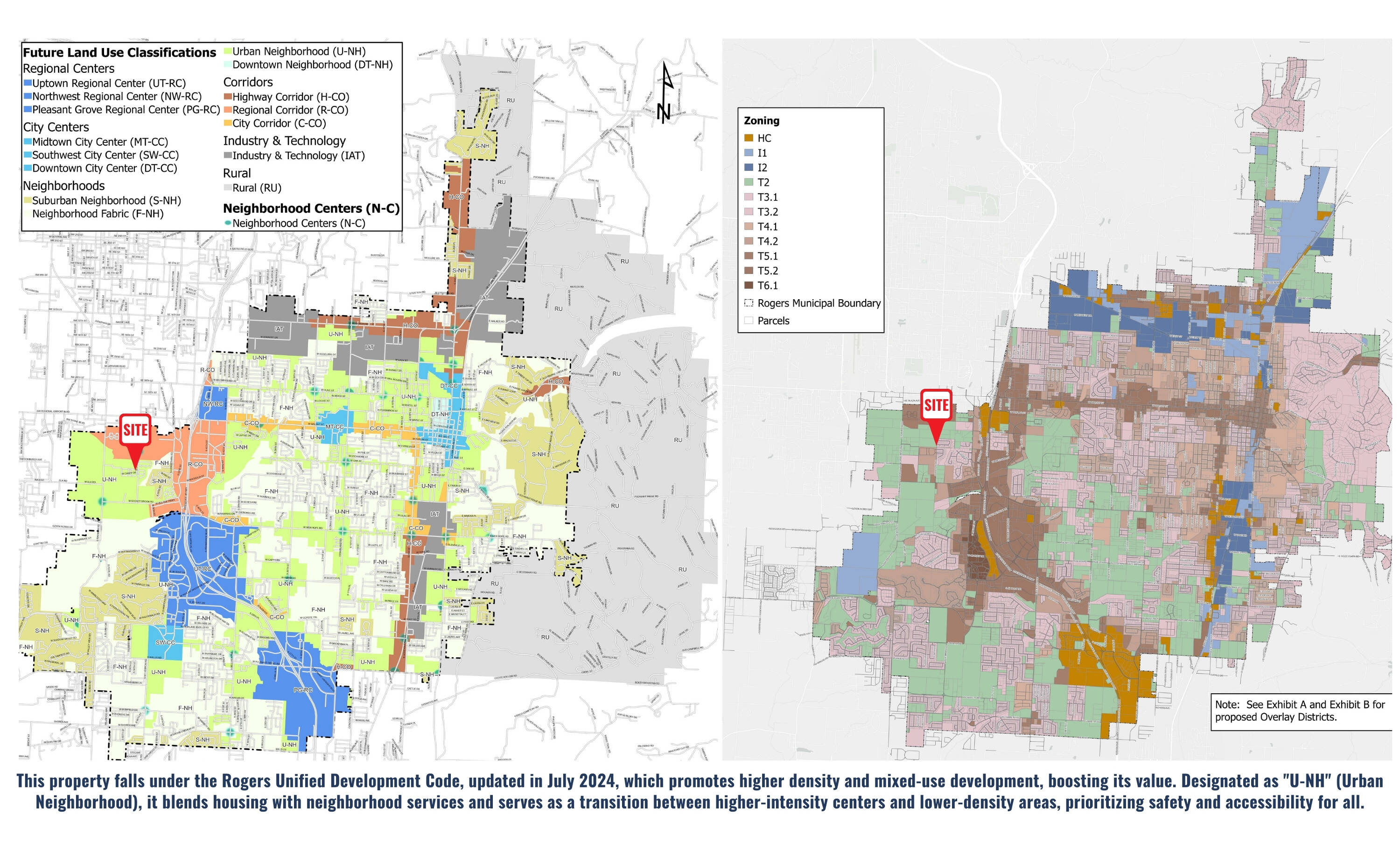 This property features: Designated "U‑Nh" (Urban Neighborhood) under Rogers Unified Development Code, promoting mixed‑use development.; Updated Rogers Unified Development Code (July 2024) allows for higher density development.; **Property value boosted by higher density and mixed‑use development potential.**