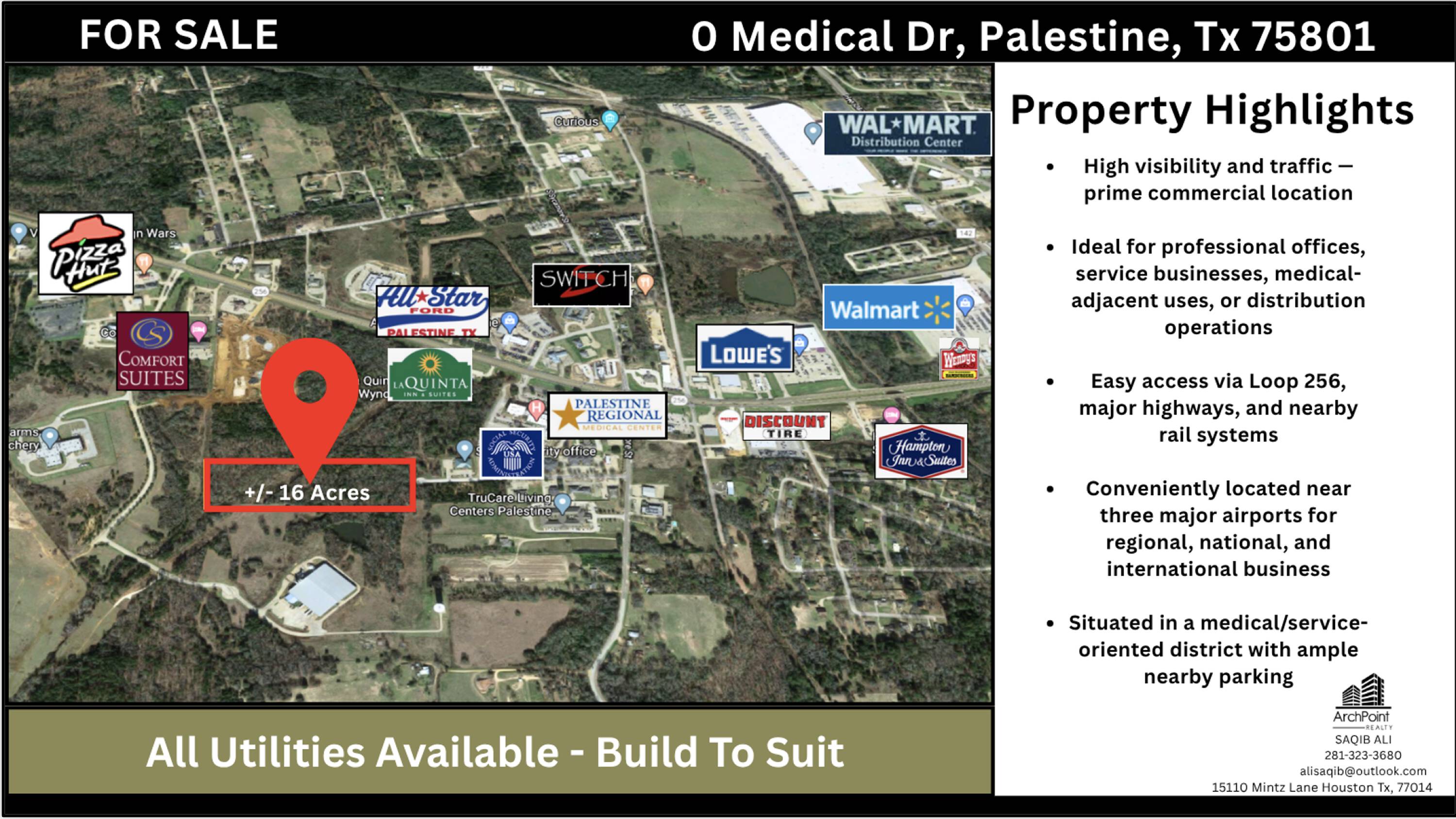 This land benefits from a convenient location with easy access to various amenities. These include the Palestine Regional Medical Center, Walmart Supercenter, Lowe's Home Improvement, multiple shopping centers, banks, and local businesses.